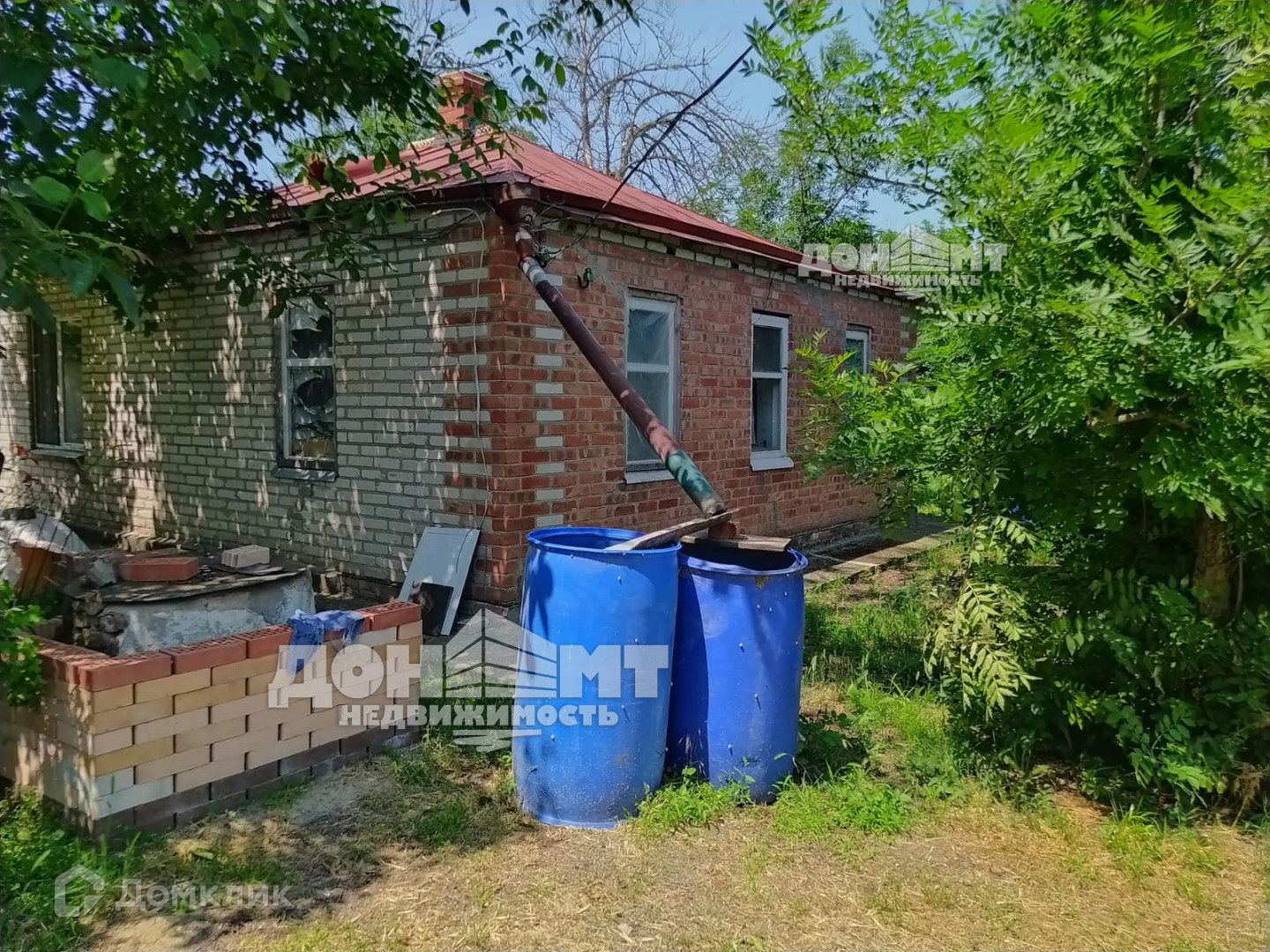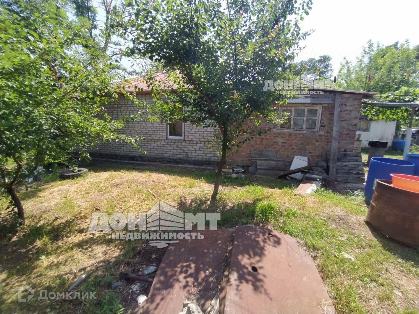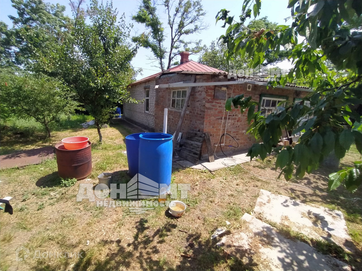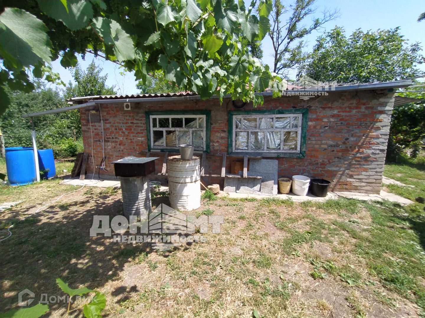 Дом саманный, обложен кирпичом, площадь 39 кв.м., плюс пристроена веранда с санузлом. В доме 4 комнаты, веранда-кухня, санузел. Печное отопление, вода - собственная скважина, глубиной 16 м., бойлер, электричество, сливная яма, хорошая крыша. Газ рядом с забором. Хоз. постройки: навес для машины, погреб. На участке растут: 4 яблони, 3 груши, 2 черешни, 2 вишни, 2 абрикоса, 4 грецких ореха, малина, ежевика, 10 кустов сортового винограда и 3 куста винного, арки для винограда. Огород обработан. По фасаду забор из профлиста, ворота, калитка. Дорога - асфальт.