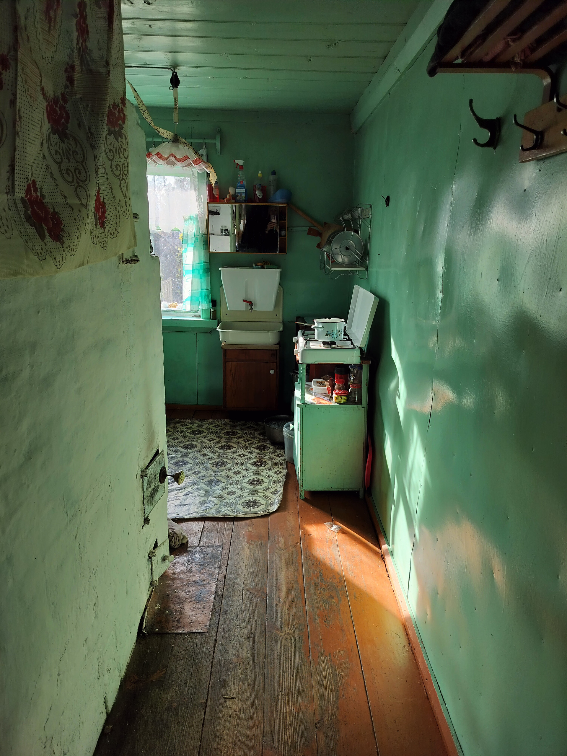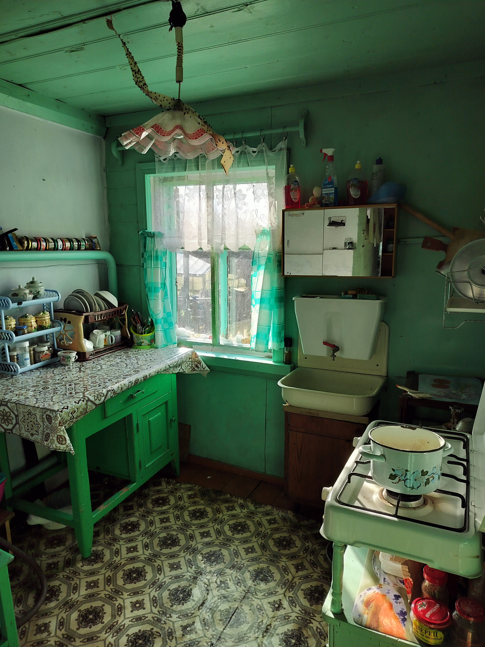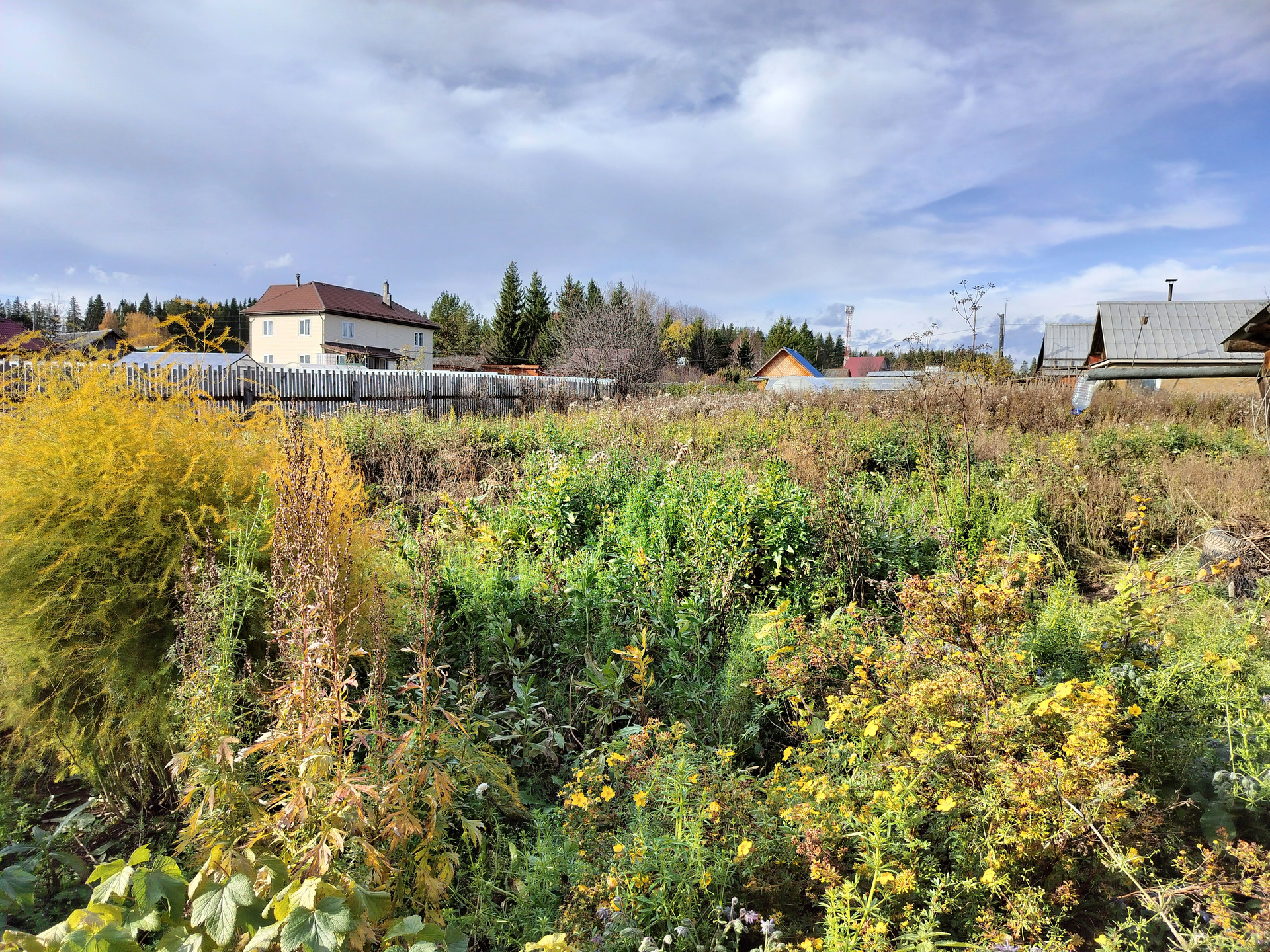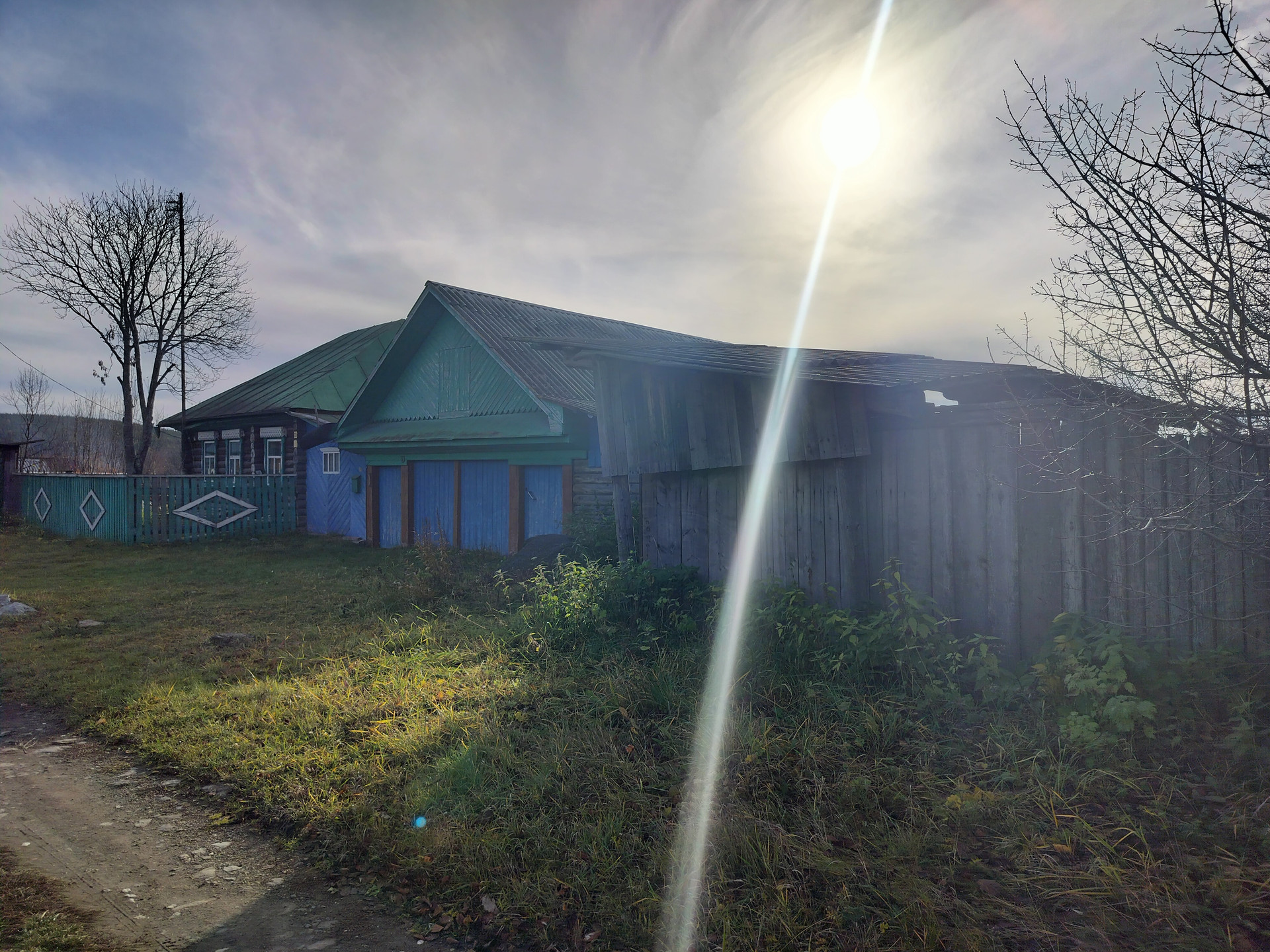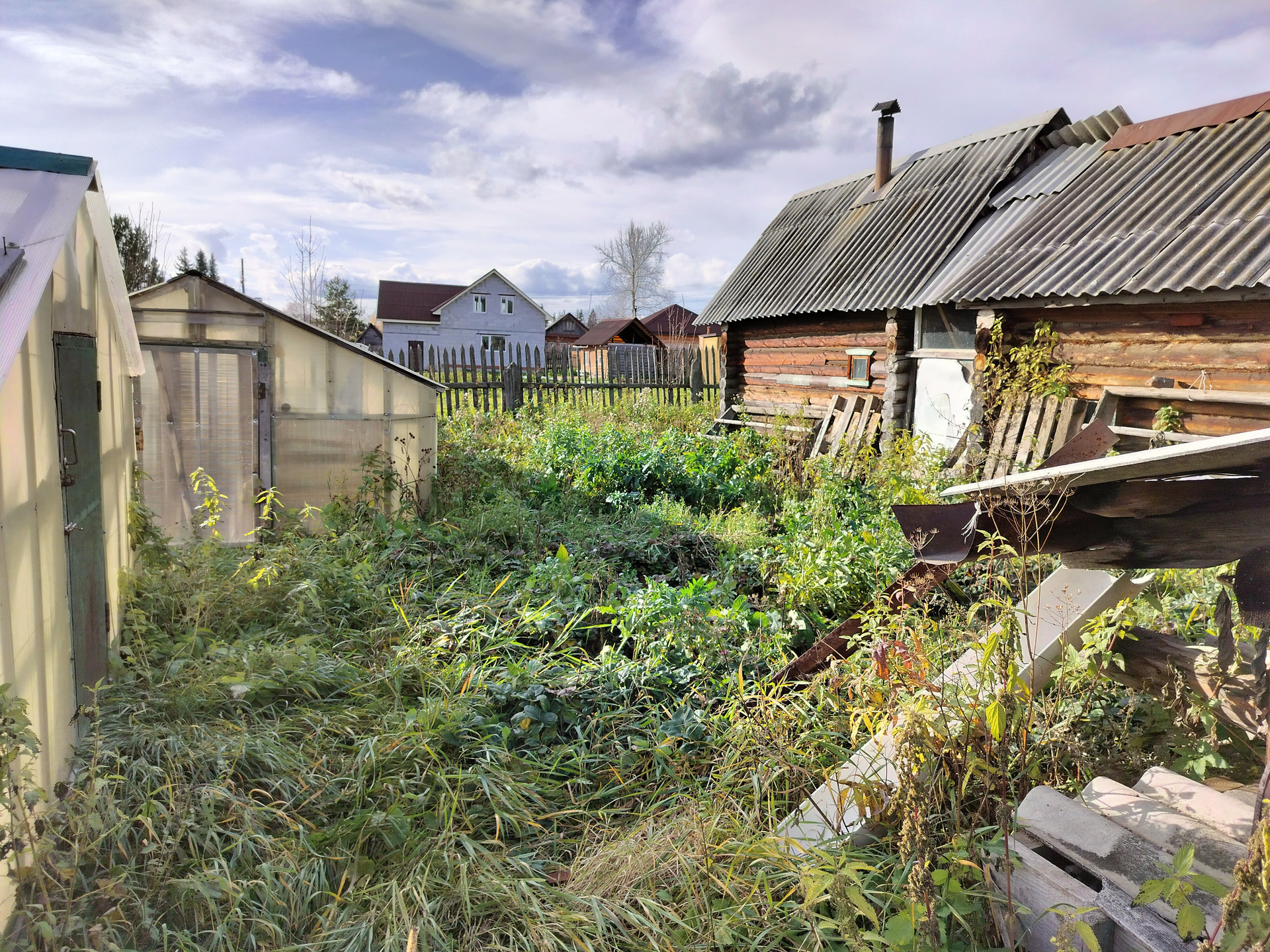 На участке имеются хозяйственные постройки: дровяник, сарай для скота, курятник, туалет. Также есть гараж под технику и баня (баня действующая, очень жаркая). Все эти постройки под одной крышей. На участке также имеются две теплицы.