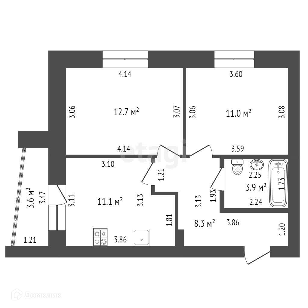 Общая площадь 47 квадратных метра, без учета застекленной лоджии. Зал 12,7 квадратных метра, спальня 11 квадратных метра и просторная кухня 11,1 квадрата.