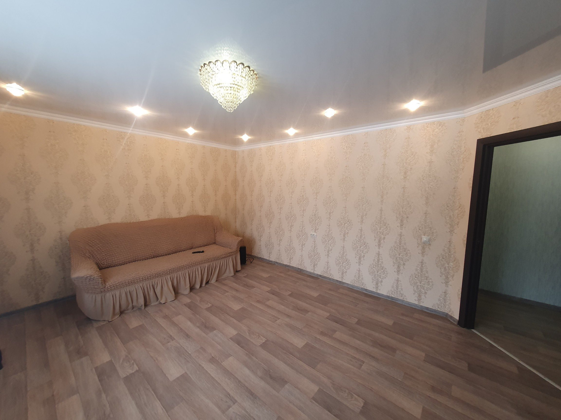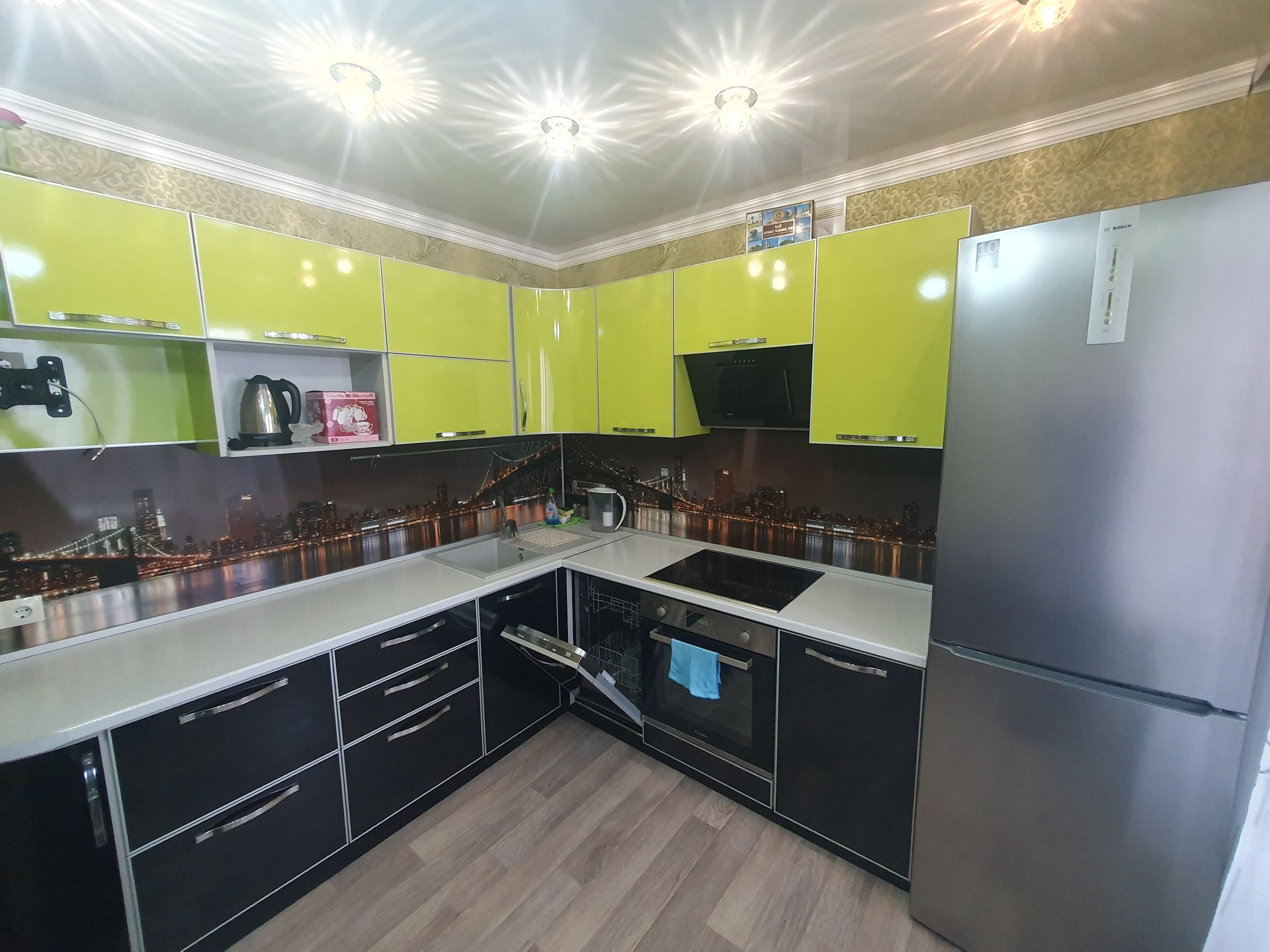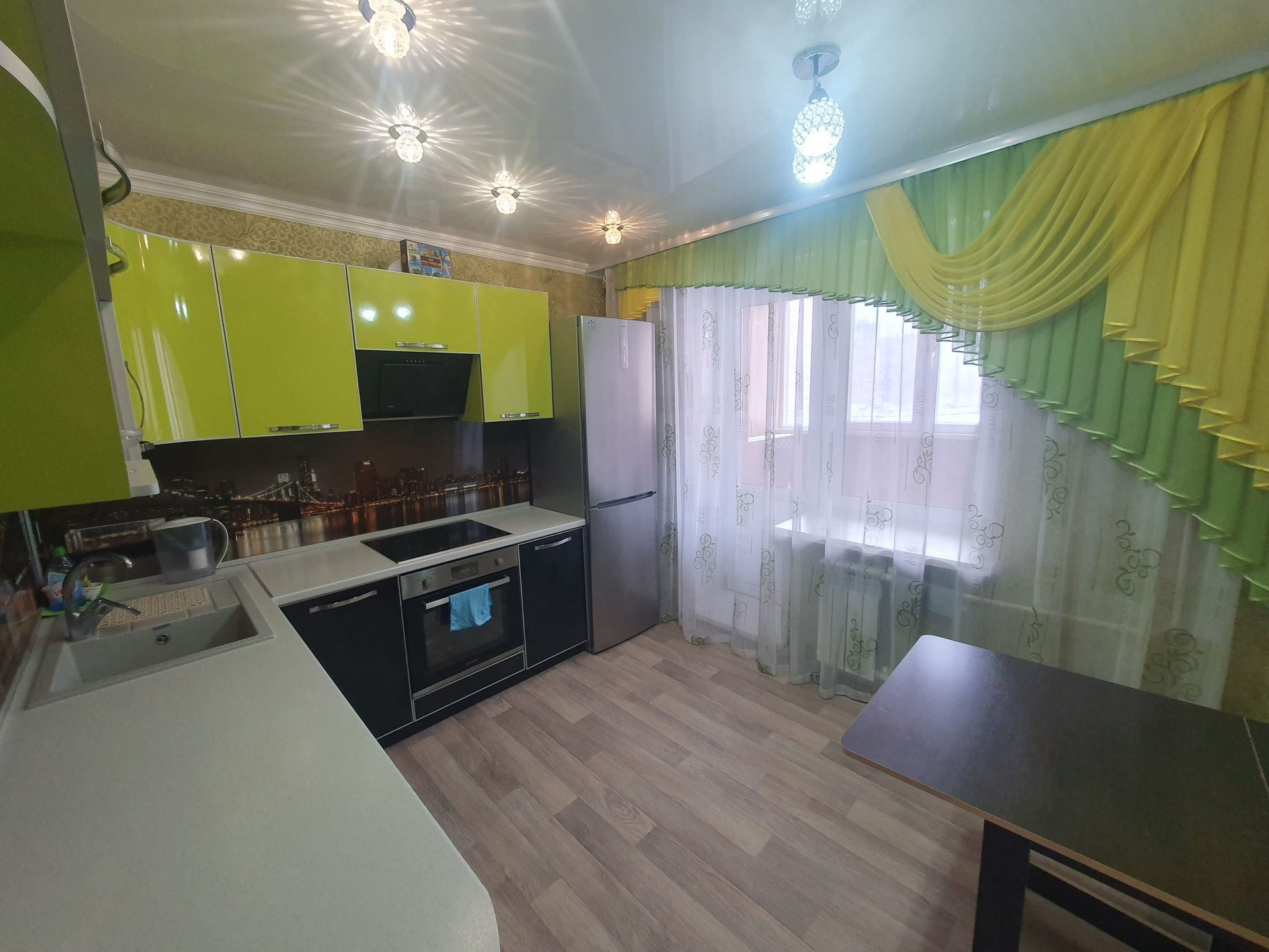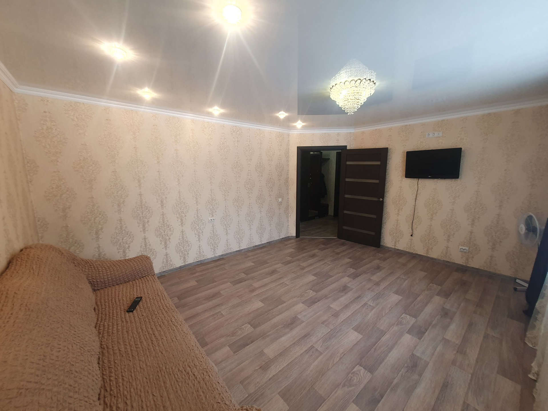 - Кухонный гарнитур с плитой, холодильник, стиральная машина, посудомоечная машина, 2 спальных места, телевизор, чайник электрический, большой встроенный шкаф в коридоре, прихожая.