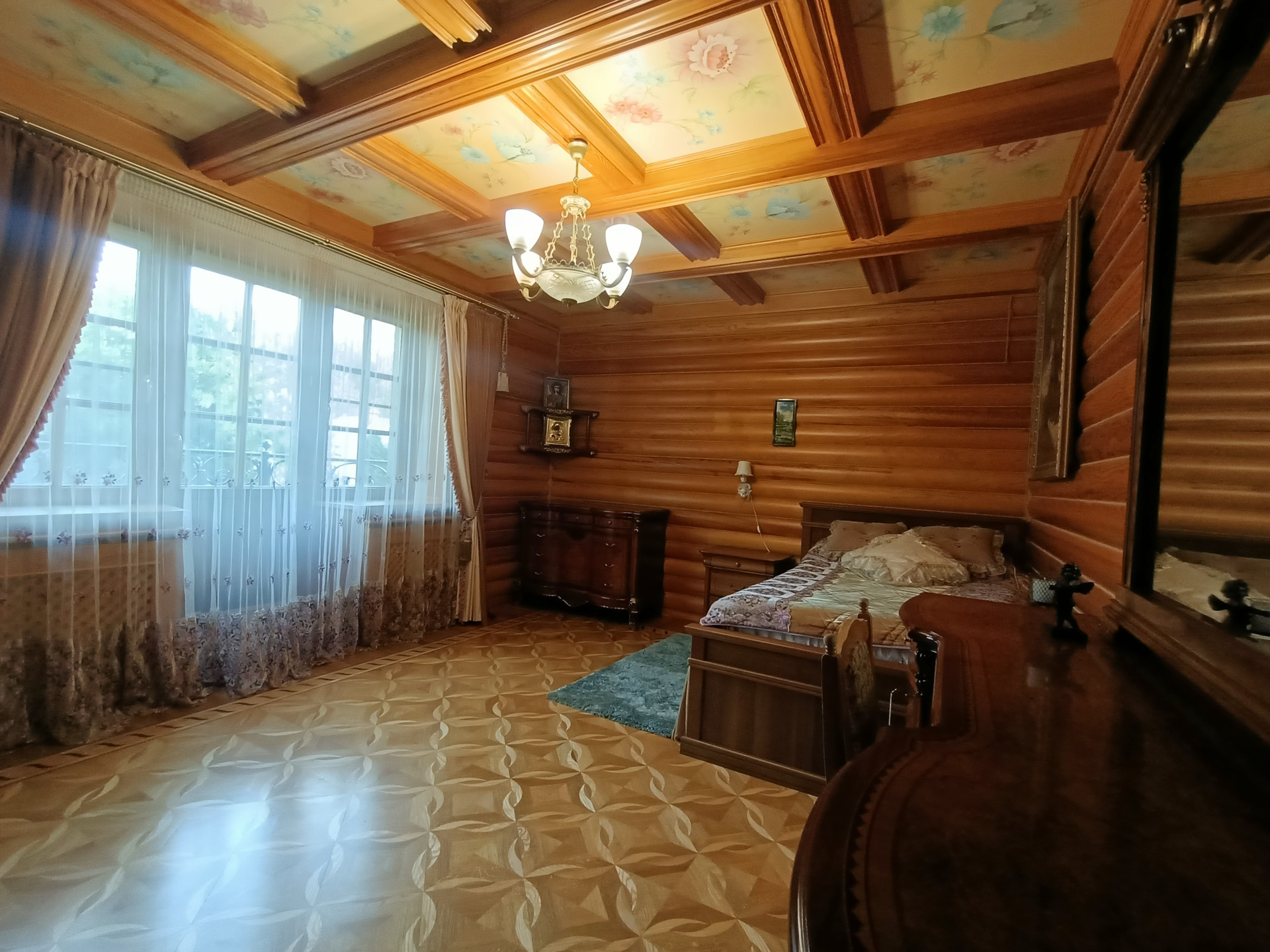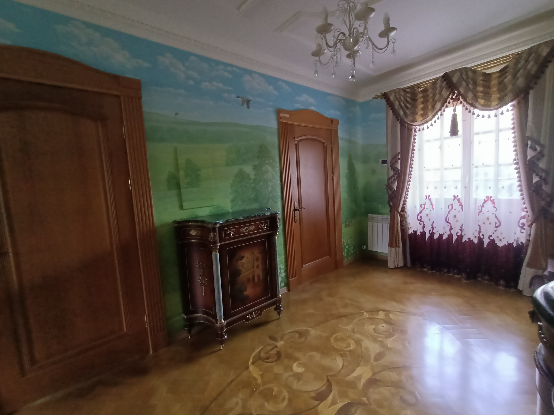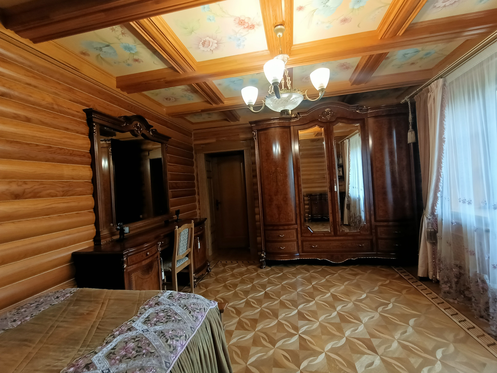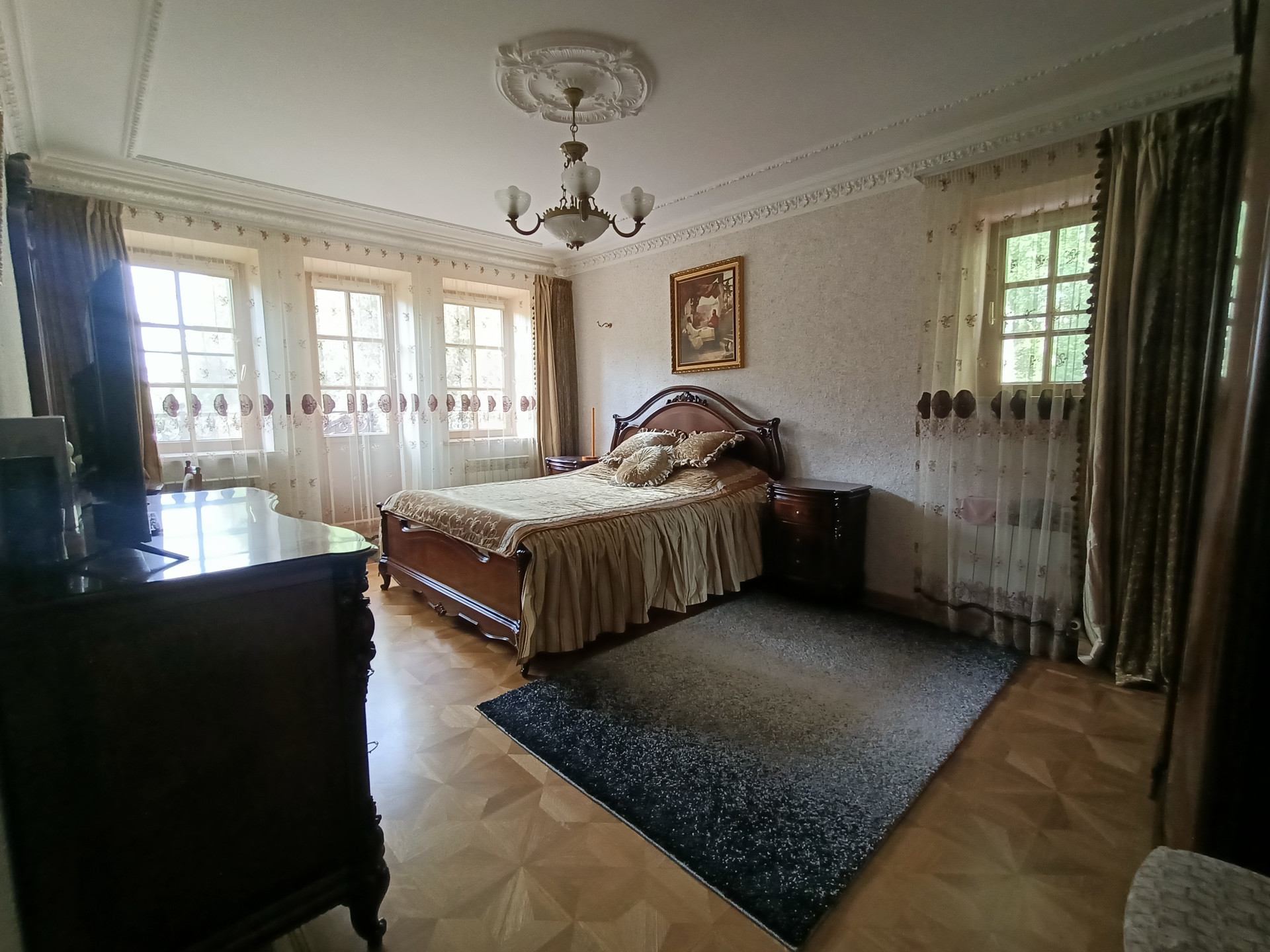Площадь 253,2 кв.м., жилая 127 кв.м., кухня 23 кв.м. Сделан эксклюзивный дизайнерский ремонт из высококачественных материалов. Межкомнатные двери и лестница из массива дуба, в комнатах — сборный паркет. Дорогая мебель и техника, везде сделаны теплые полы, на кухне встроенная техника Miele. На втором этаже есть балкон и просторная терраса с видом на собственную березовую рощу.