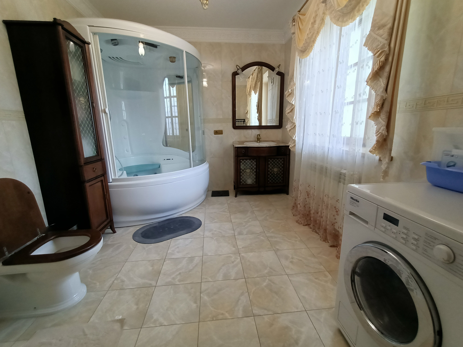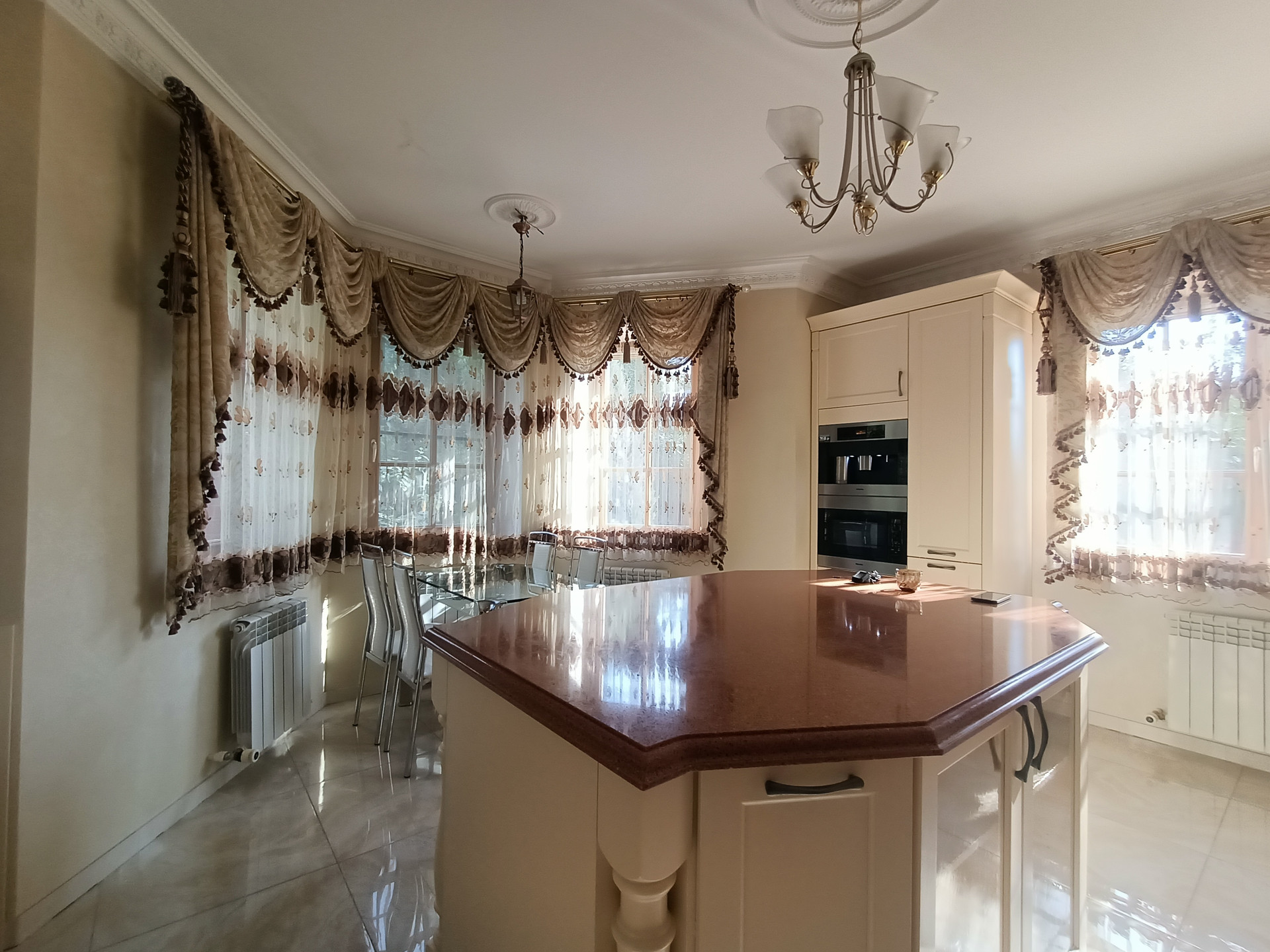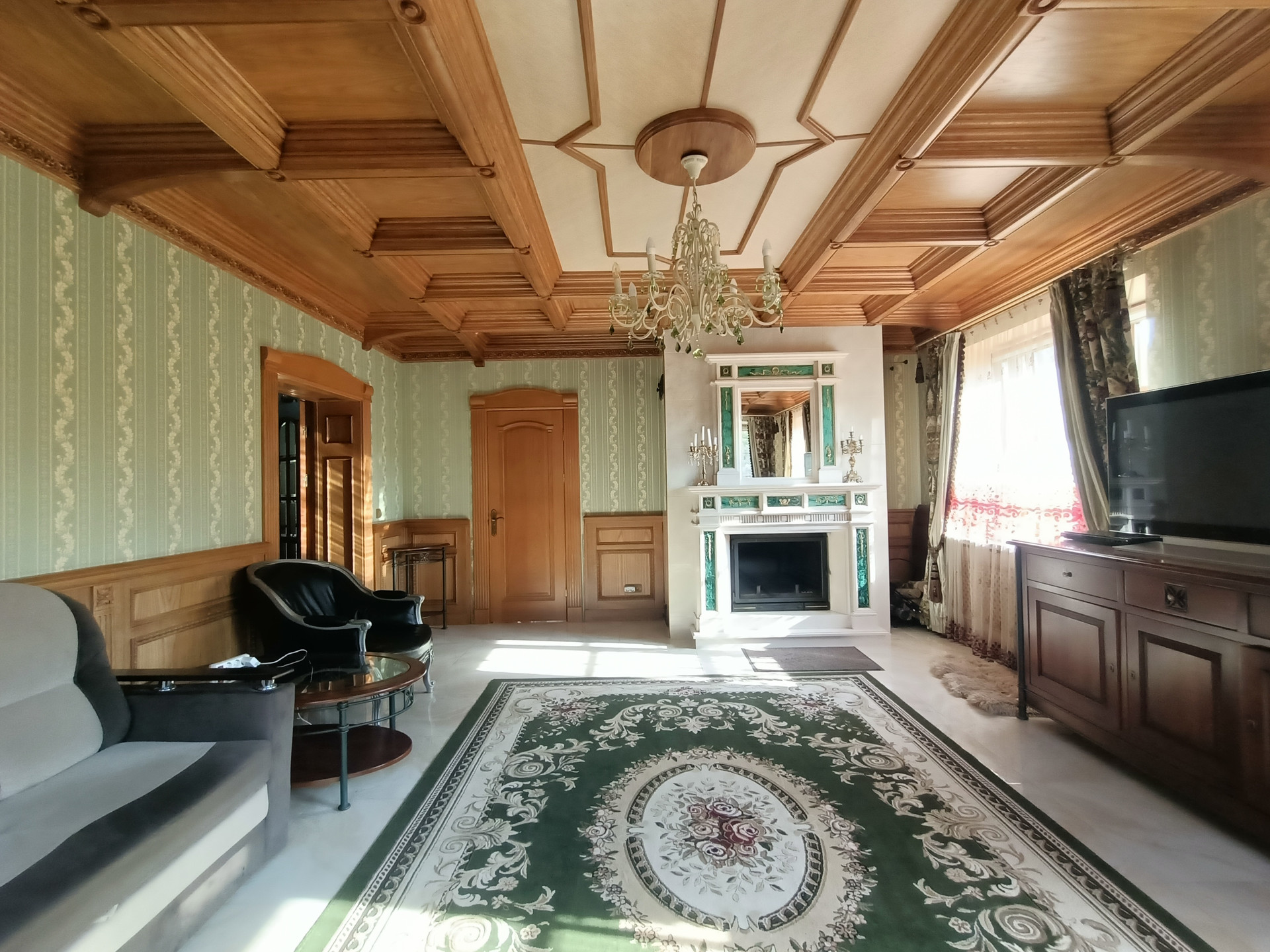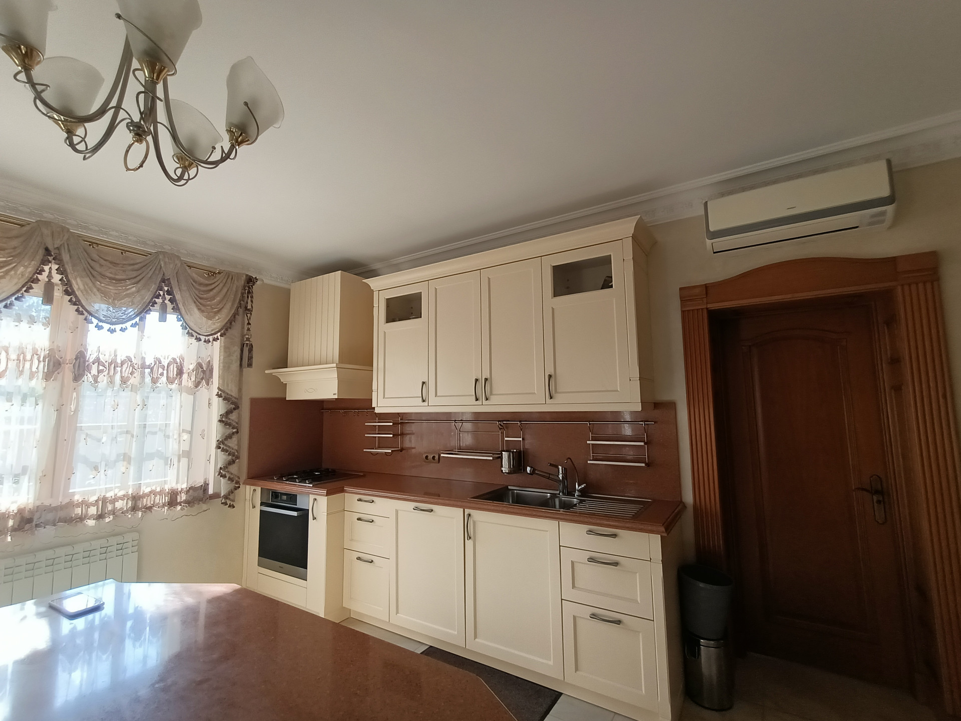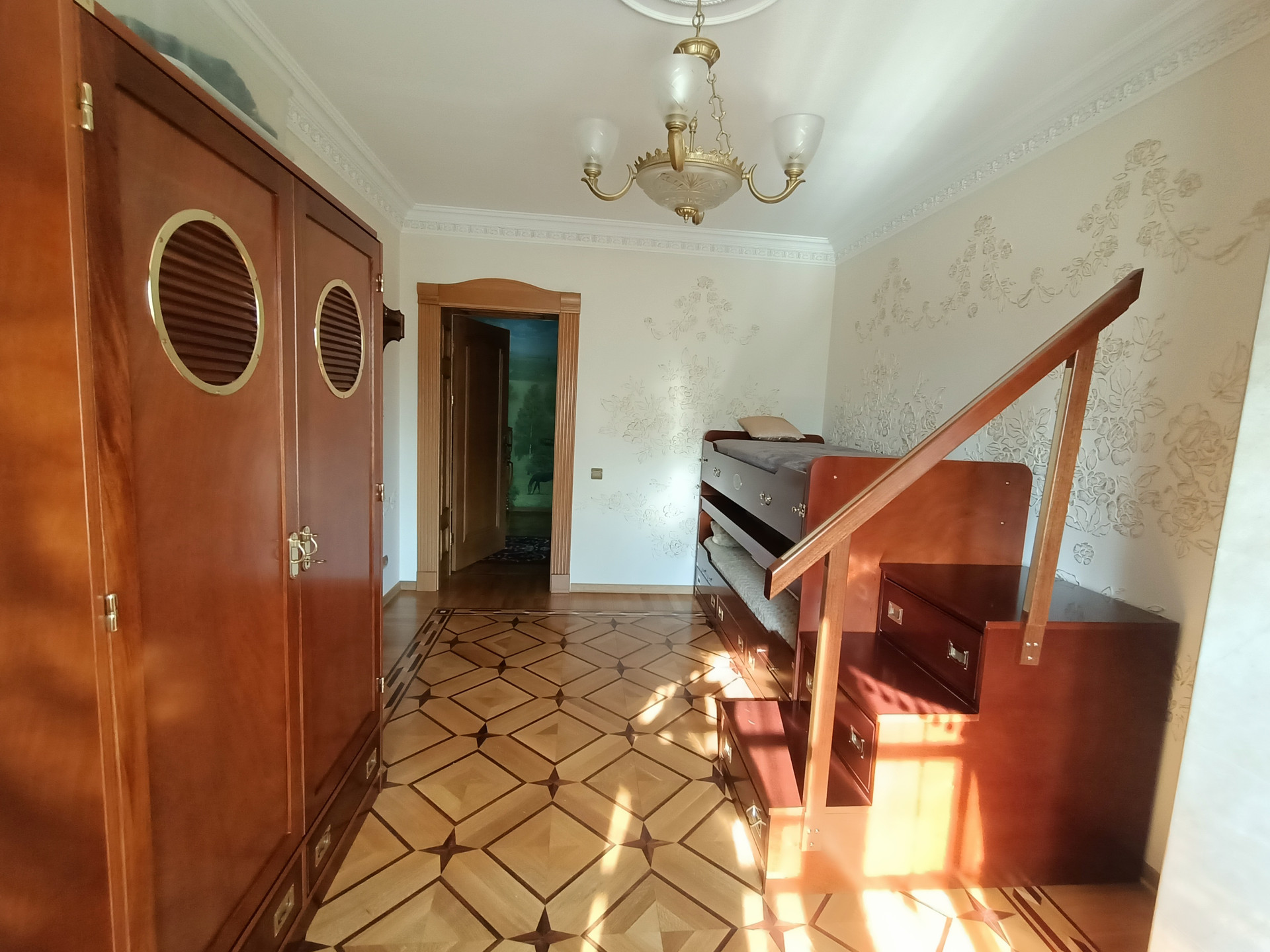 Площадь 253,2 кв.м., жилая 127 кв.м., кухня 23 кв.м. Сделан эксклюзивный дизайнерский ремонт из высококачественных материалов. Межкомнатные двери и лестница из массива дуба, в комнатах — сборный паркет. Дорогая мебель и техника, везде сделаны теплые полы, на кухне встроенная техника Miele. На втором этаже есть балкон и просторная терраса с видом на собственную березовую рощу.