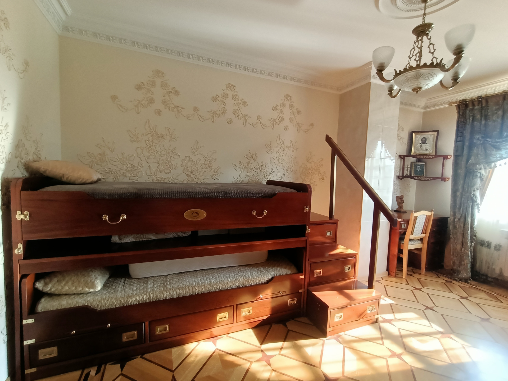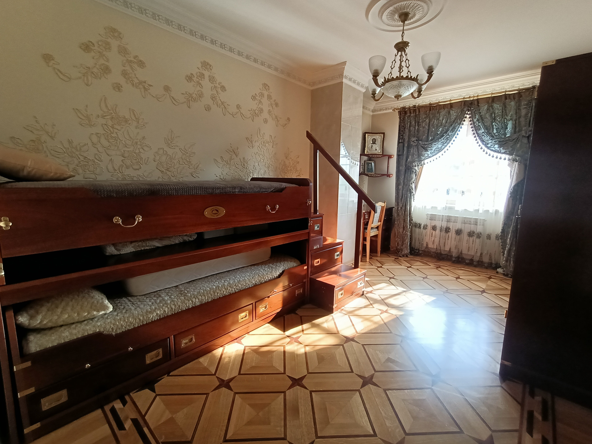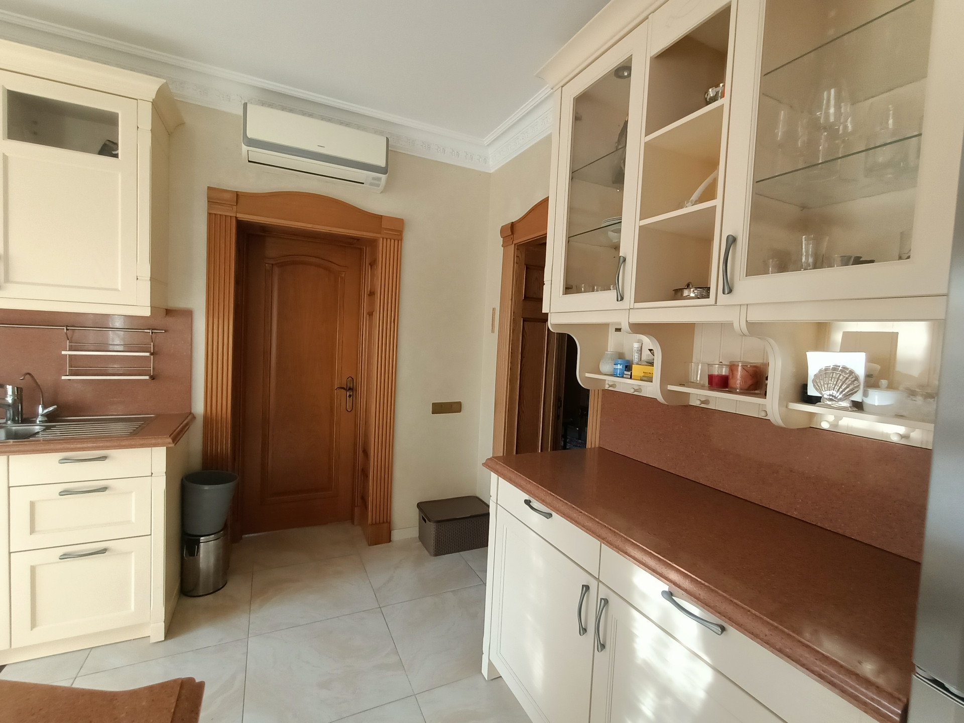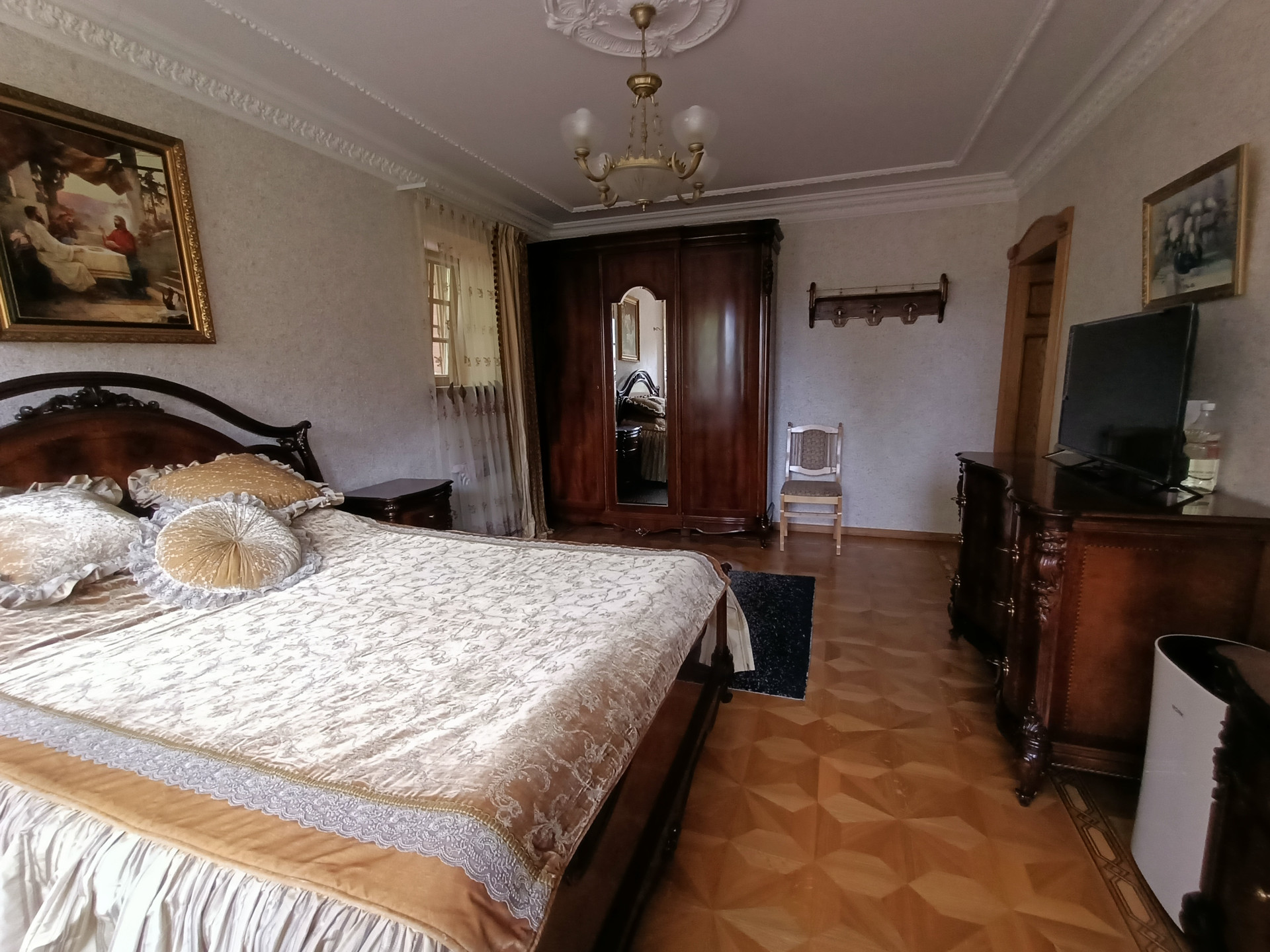 Площадь 253,2 кв.м., жилая 127 кв.м., кухня 23 кв.м. Сделан эксклюзивный дизайнерский ремонт из высококачественных материалов. Межкомнатные двери и лестница из массива дуба, в комнатах — сборный паркет. Дорогая мебель и техника, везде сделаны теплые полы, на кухне встроенная техника Miele. На втором этаже есть балкон и просторная терраса с видом на собственную березовую рощу.
