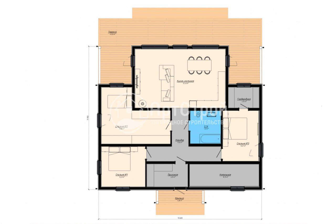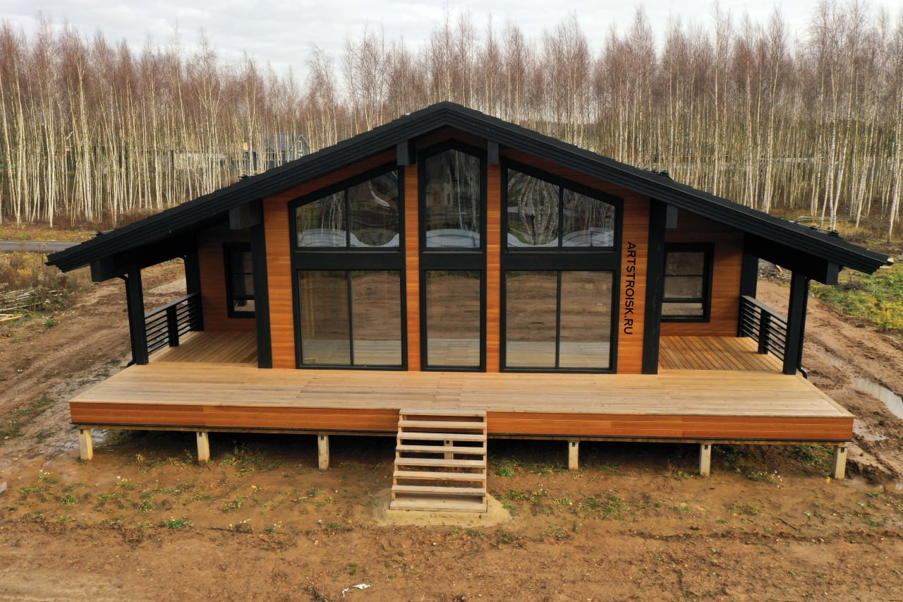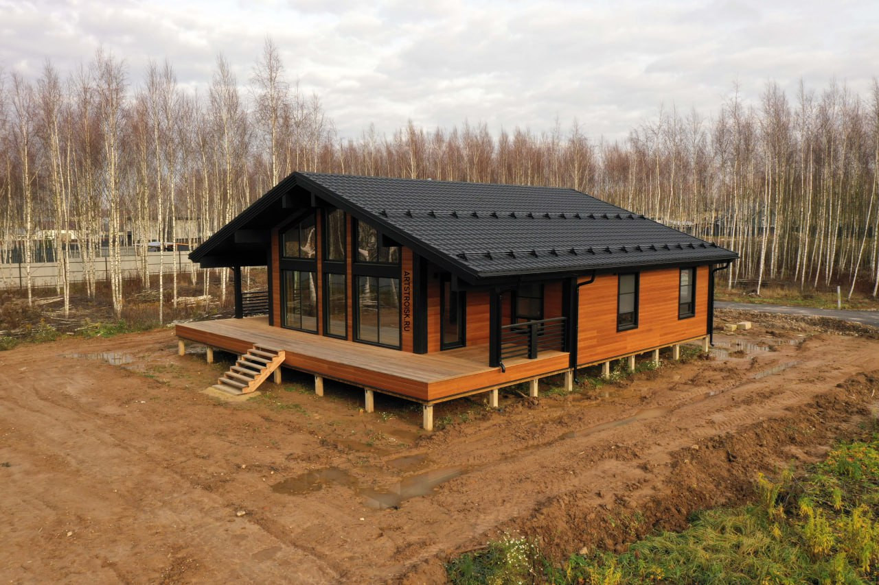 Одноэтажный дом с фасадом из лиственницы. Размеры 14,4 х 13,6 метров, с террасой 49 м2 и крыльцом 5 м2, общая площадь 160 м2.