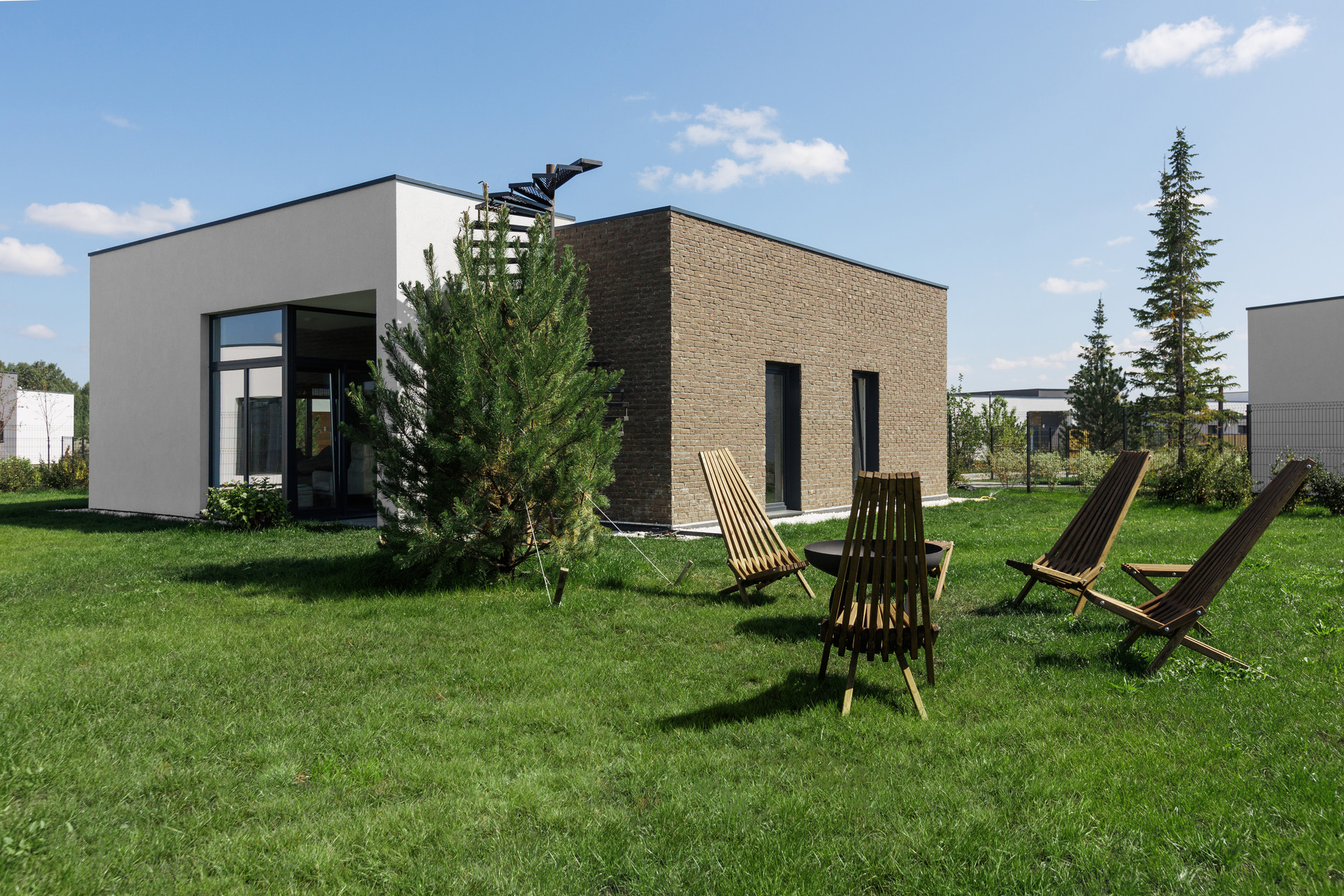 -Благоустройство участка (крупномерные деревья и кустарники, посевной газон, парковочное место)