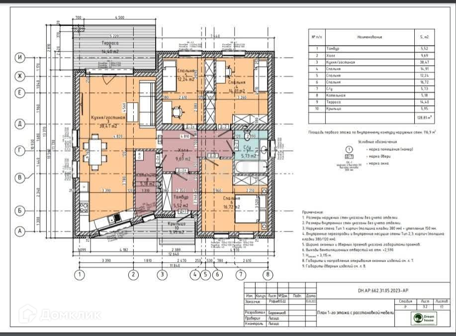 Отличный дом в комфортном месте! ПОДХОДИТ ПОД СЕЛЬКУЮ ИПОТЕКУ! Дом 128 м2 на участке 4,8 соток. Продажа от физлица - без обременений и иных долгов. Материал стен кирпич, фасад кирпич штукатуренный, предчистовая отделка: на полу полусухая фиброцементная стяжка, стены оштукатурены. Большой холл, кухня-гостиная с выходом на террасу, три спальни, санузел, котельная, панорамные окна во всем доме. По дому разведена вся электрика, сантехника, канализация, вентиляция, водяные теплые полы. Установлен современный двухконтурный котел с системой удаленного доступа. Коммуникации: Центральное водоснабжение, Электричество 380В. Септик на участке 9 м3.