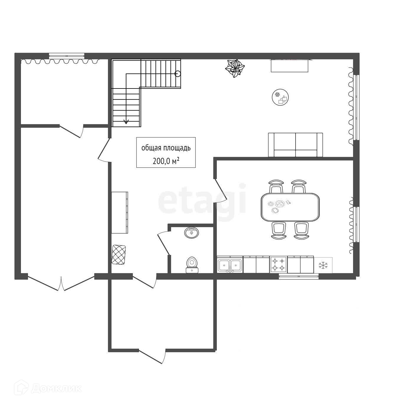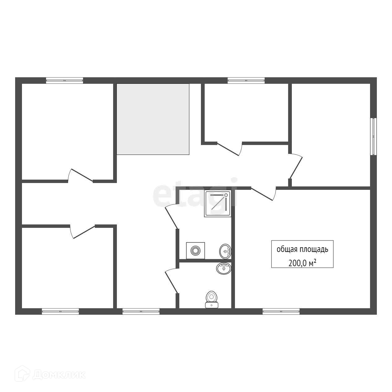 На первом этаже просторная кухня, гостиная, коридор, холл и гостевой туалет. На втором этаже 5 комнат, раздельный санузел, холл.