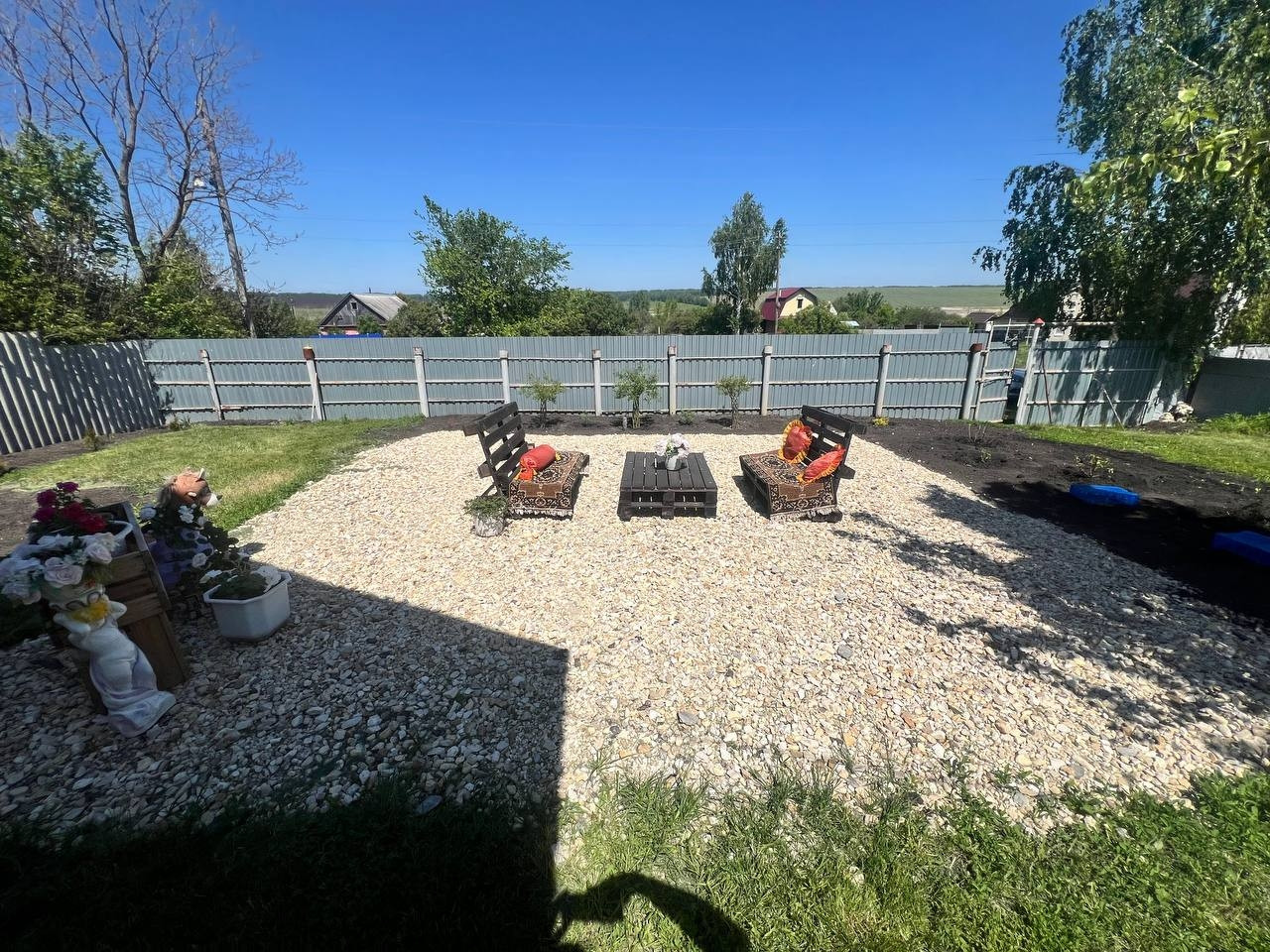 По периметру огорожен профлистом и сеткой рябицей.