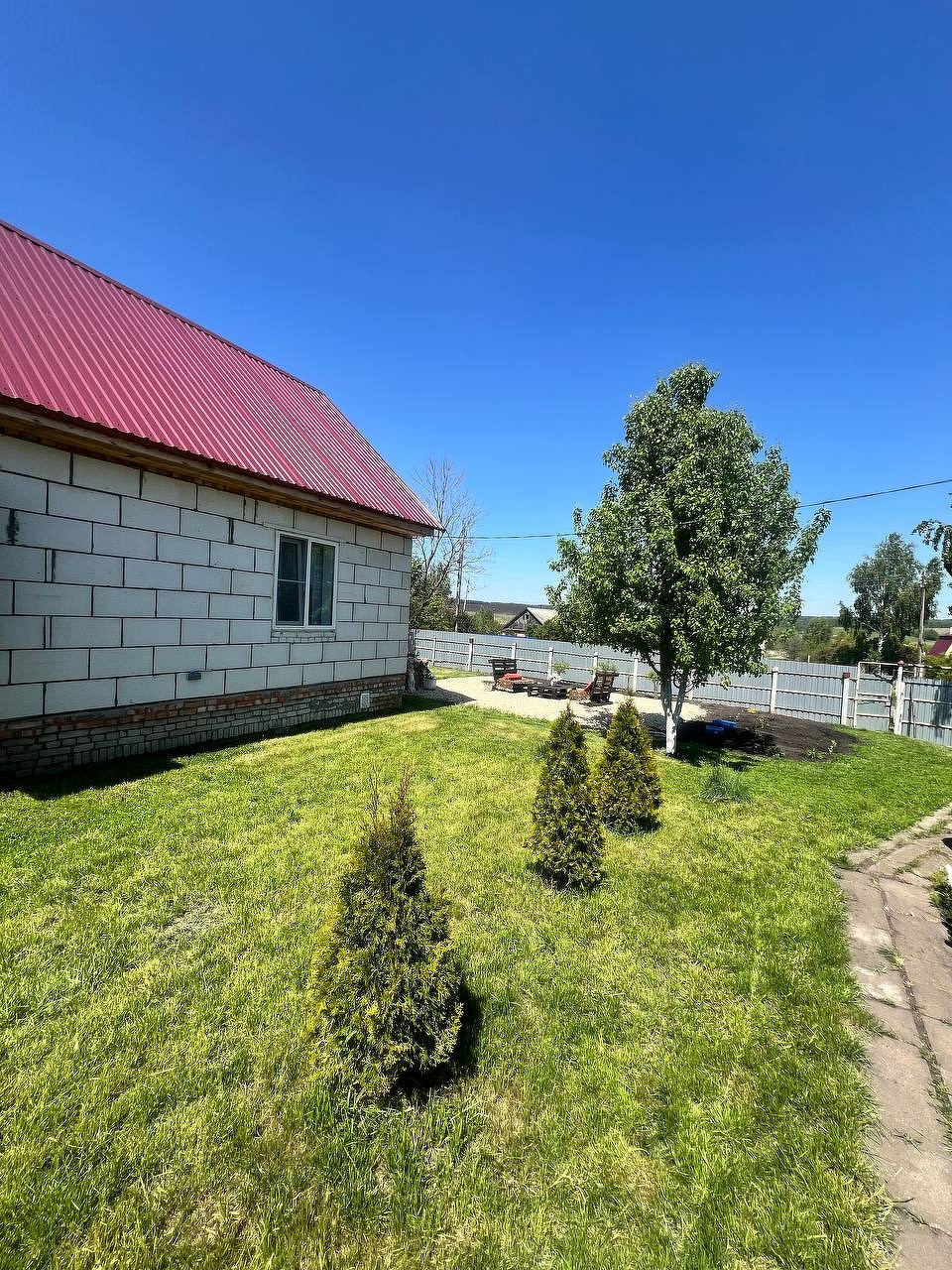 Очень ухоженная территория, с плодоносящими деревьями, туями.