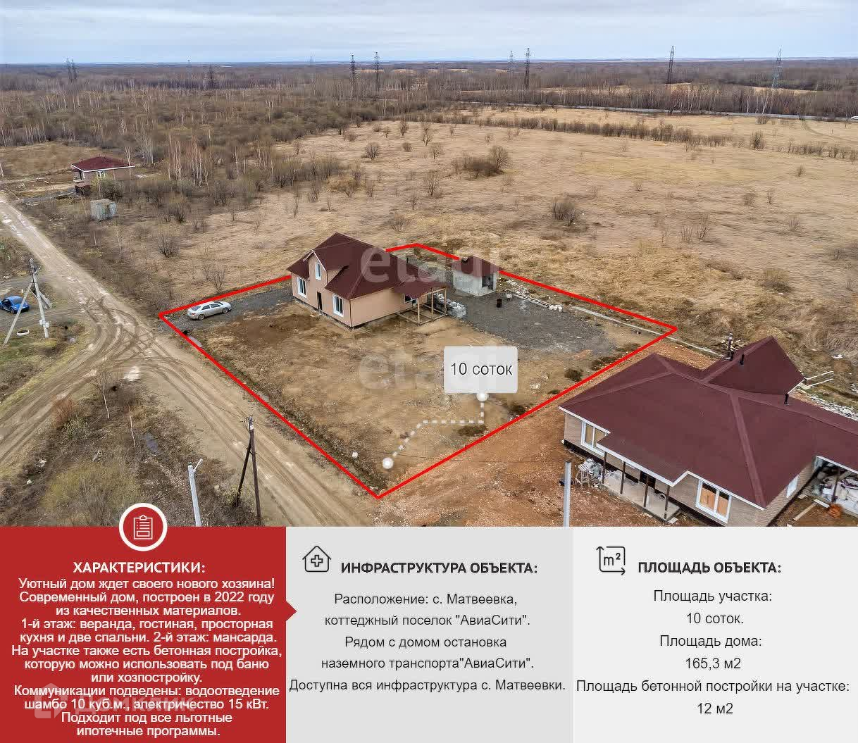 Уютный дом в коттеджном поселке Авиасити в с.Матвеевка ждет своего нового хозяина! Этот современный дом, построенный в 2022 году, обладает всеми удобствами для комфортной жизни. Общая площадь дома составляет 165,3 кв.м, на участке площадью 10 соток уже проведено межевание. На первом этаже расположены просторная веранда, уютная гостиная, просторная кухня и две уютные спальни. На втором мансардном этаже вы найдете помещение свободного назначения площадью 71,3 кв.м. Дом выполнен из качественных материалов: газоблок с утеплением с минваты 20 см, ленточный фундамент, армирующий пояс на первом этаже, крыша Ондулин, деревянные перекрытия. На участке также есть бетонная постройка площадью 12 кв.м, которую можно использовать под баню или хозпостройку. Коммуникации подведены: водоотведение шамбо 10 куб.м., электричество 15 кВт. Дом подходит под все виды ипотечных программ в том числе под ДВ ипотеку, так что приобрести его стало еще проще! Не упустите уникальную возможность стать счастливым обладателем этого прекрасного дома. Звоните прямо сейчас, чтобы узнать больше и организовать просмотр!