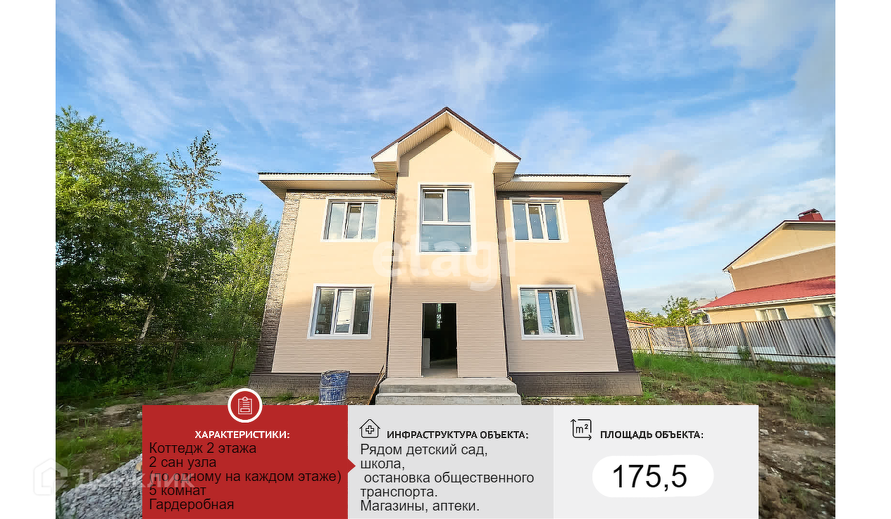 Идет строительство нескольких домов! Коттедж построен площадью 120 кв. Строим своими деньгами, продаем по окончании стройки по ДКП и уже ищем покупателя, который может наблюдать за ходом строительства своими глазами до выхода на сделку! Уникальное предложение для тех, кто мечтает о собственном доме! Дом в предчистовой ( White box) отделке, что позволит новым владельцам воплотить свои дизайнерские идеи. В стоимость дома входят земельный участок 10 соток и все коммуникации! Улица газифицирована, есть возможность к подключению и отоплению дома газовым котлом! К дому проложена асфальтированная дорога. В шаговой доступности детский сад, школа, магазины, аптека. Подходит под льготные программы!