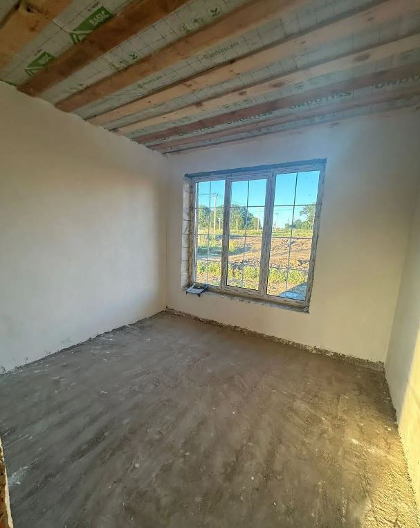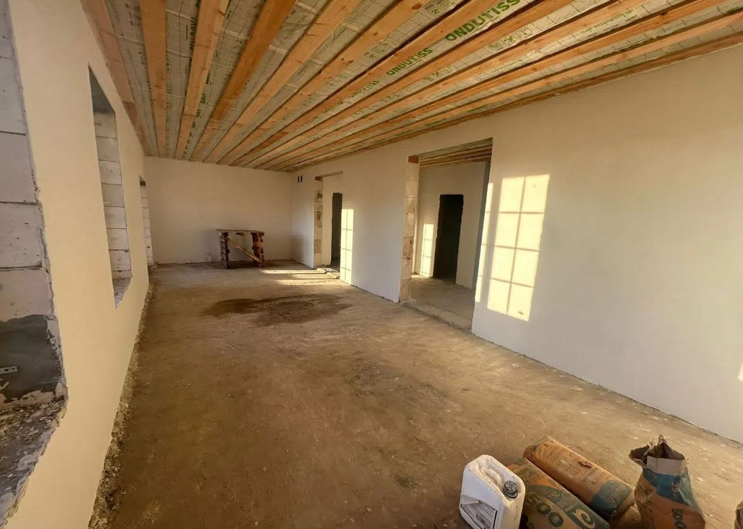 Стены оштукатурены по маякам и ошпатлеваны. Утепленное перекрытие первого этажа.