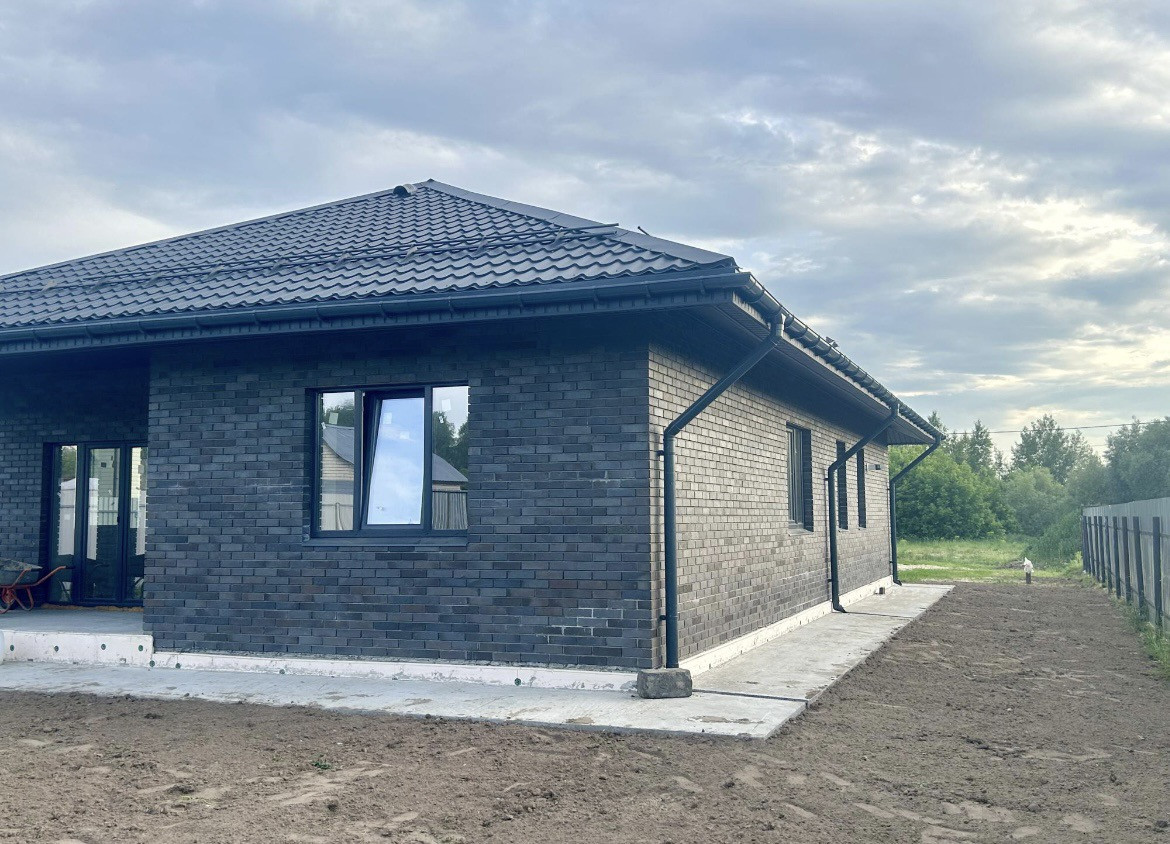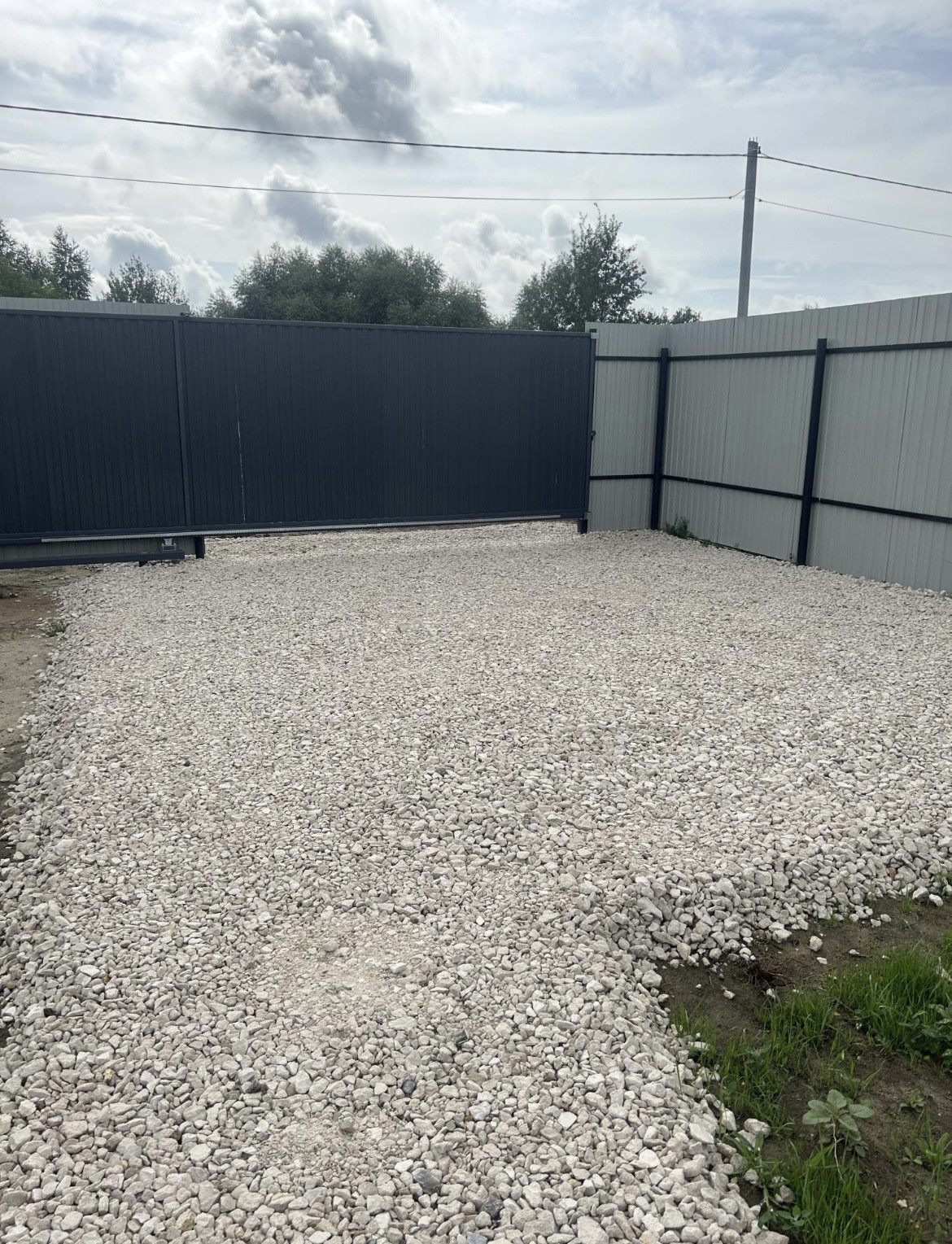 Забор с откатными воротами (по цвету дома ) засеян газон, парковочное место и тропинки к дому тоже готовы .