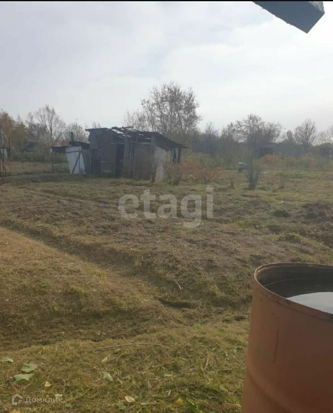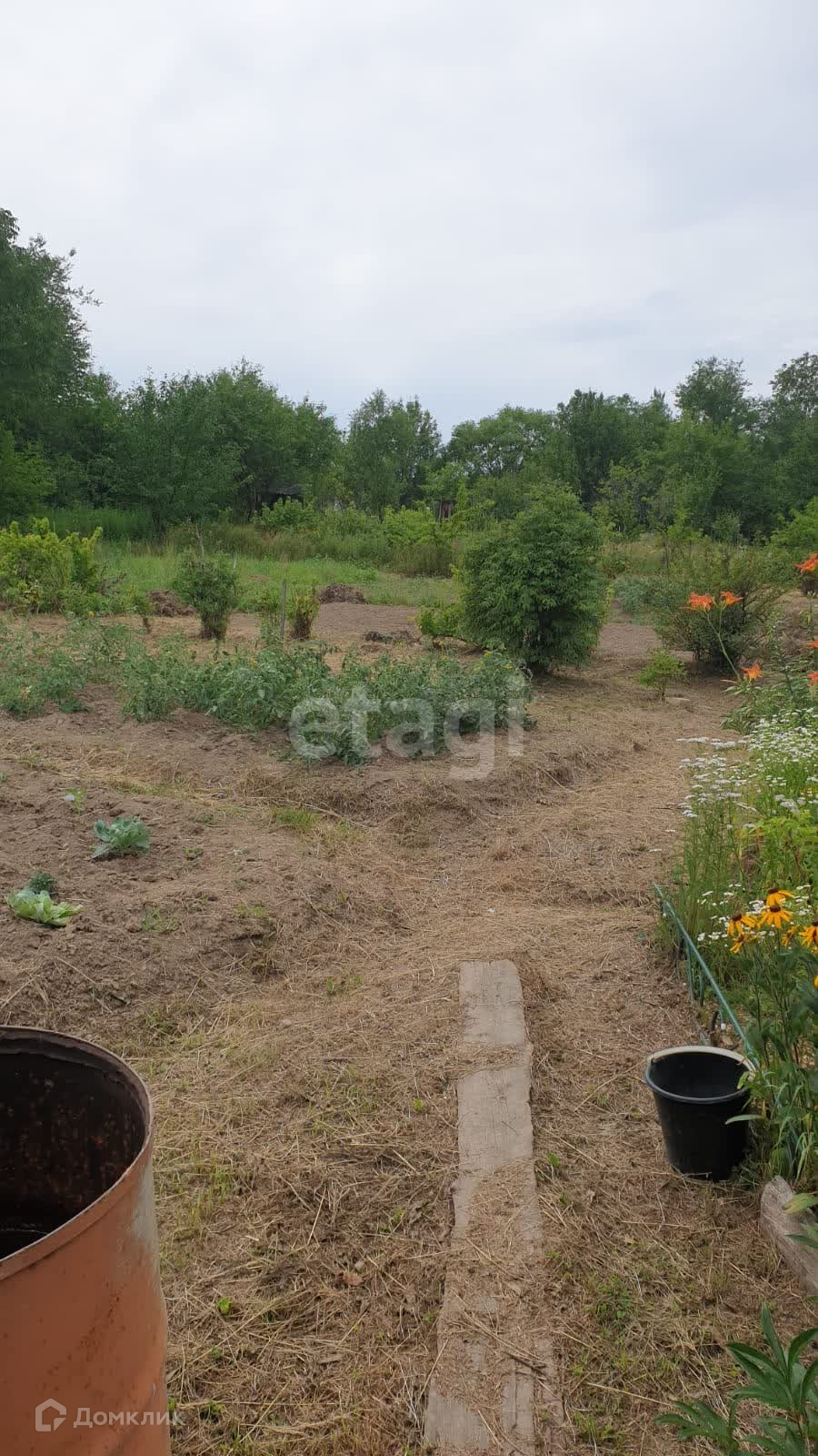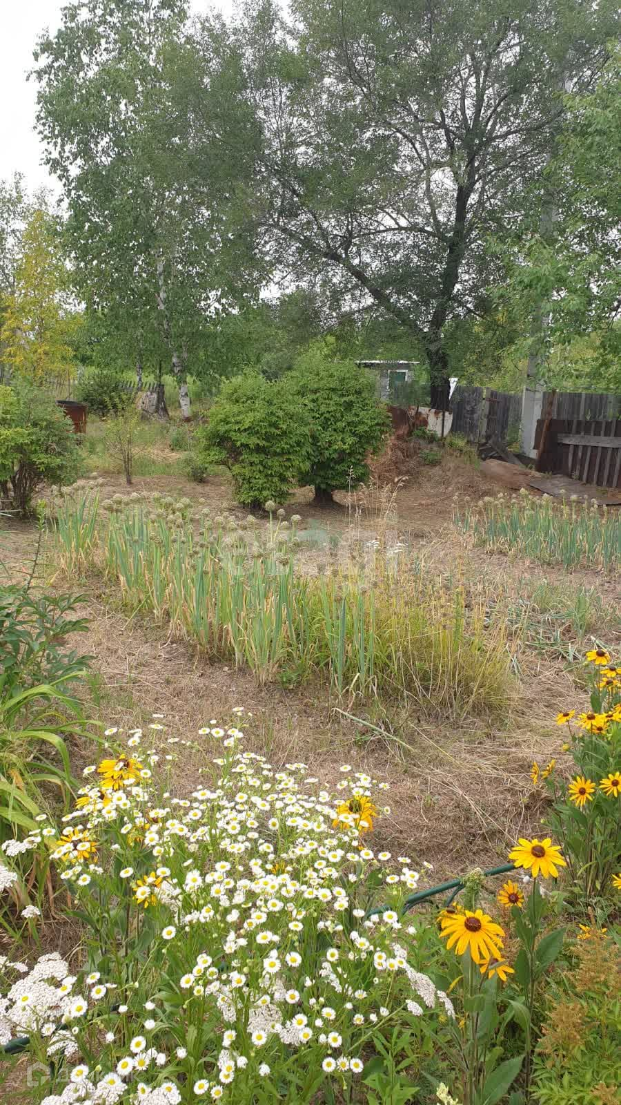 Земля разработанная, ежегодно собирают урожай (картофель, огурцы, помидоры). Высажены кусты смородины, малины.