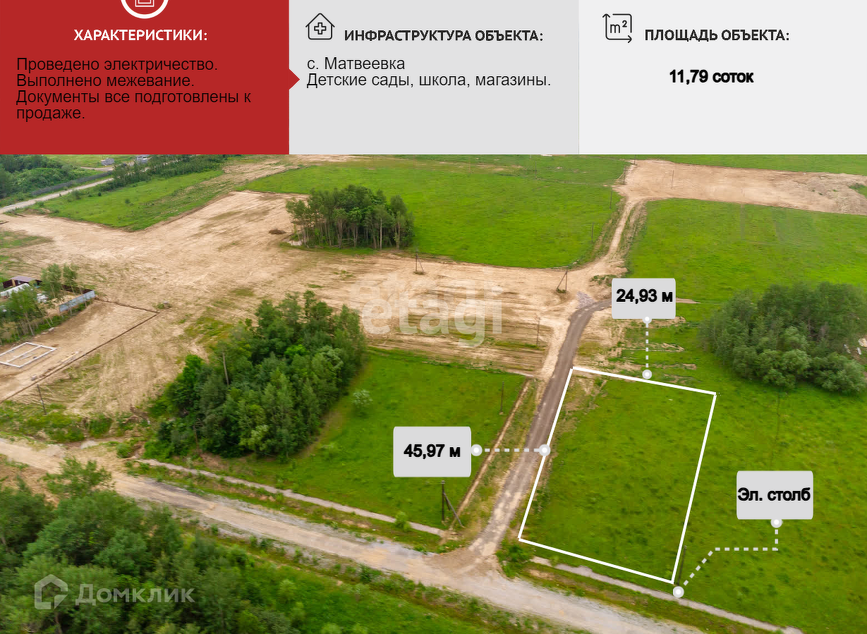 В продажу представлен отличный земельный участок 11,79 сот. Участок ровный, с небольшим уклоном - что благоприятно для отвода верховодки. Земельное назначение ИЖС, в с. Матвеевка.