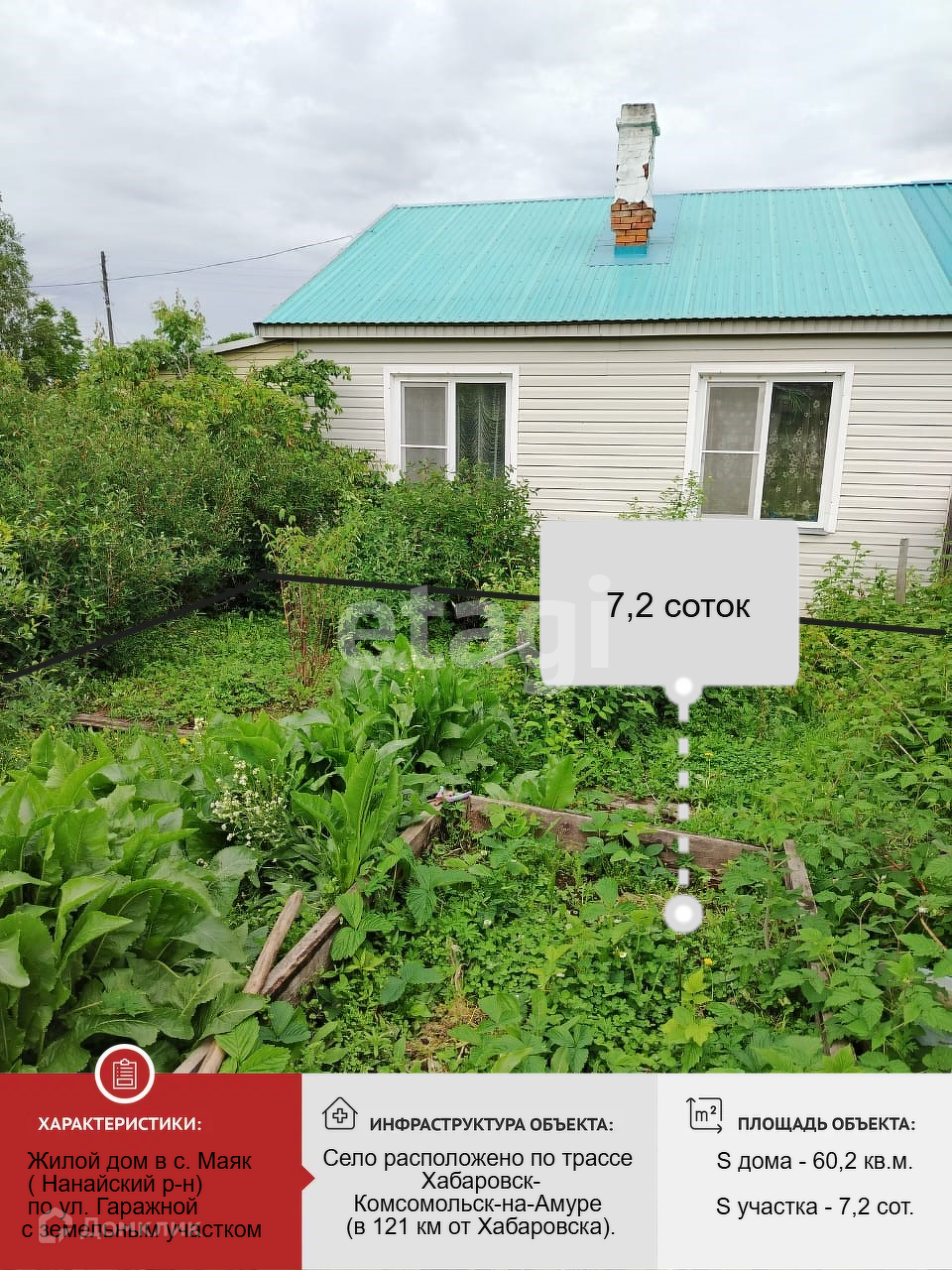 Продается жилой дом в с. Маяк ( Нанайский р-н) по ул. Гаражной с земельным участком площадью 7,2 соток. Отопление печное и электрическое (тены), колонка на улице. На участке есть баня, гараж и дровяник. Также присутствует разнообразный сад, в котором есть: яблоня, жимолость, клубника, малина, ежевика, чернослив, смородина, абрикосы. При продаже вся мебель остаётся. В селе имеется почта, магазины, дет. сад. Село расположено по трассе Хабаровск-Комсомольск-на-Амуре (в 121 км от Хабаровска). Неподалеку располагается красивое и живописное озеро Синдинское, отличное место для отдыха и рыбалки! Документы готовы к продаже. Один взрослый собственник.