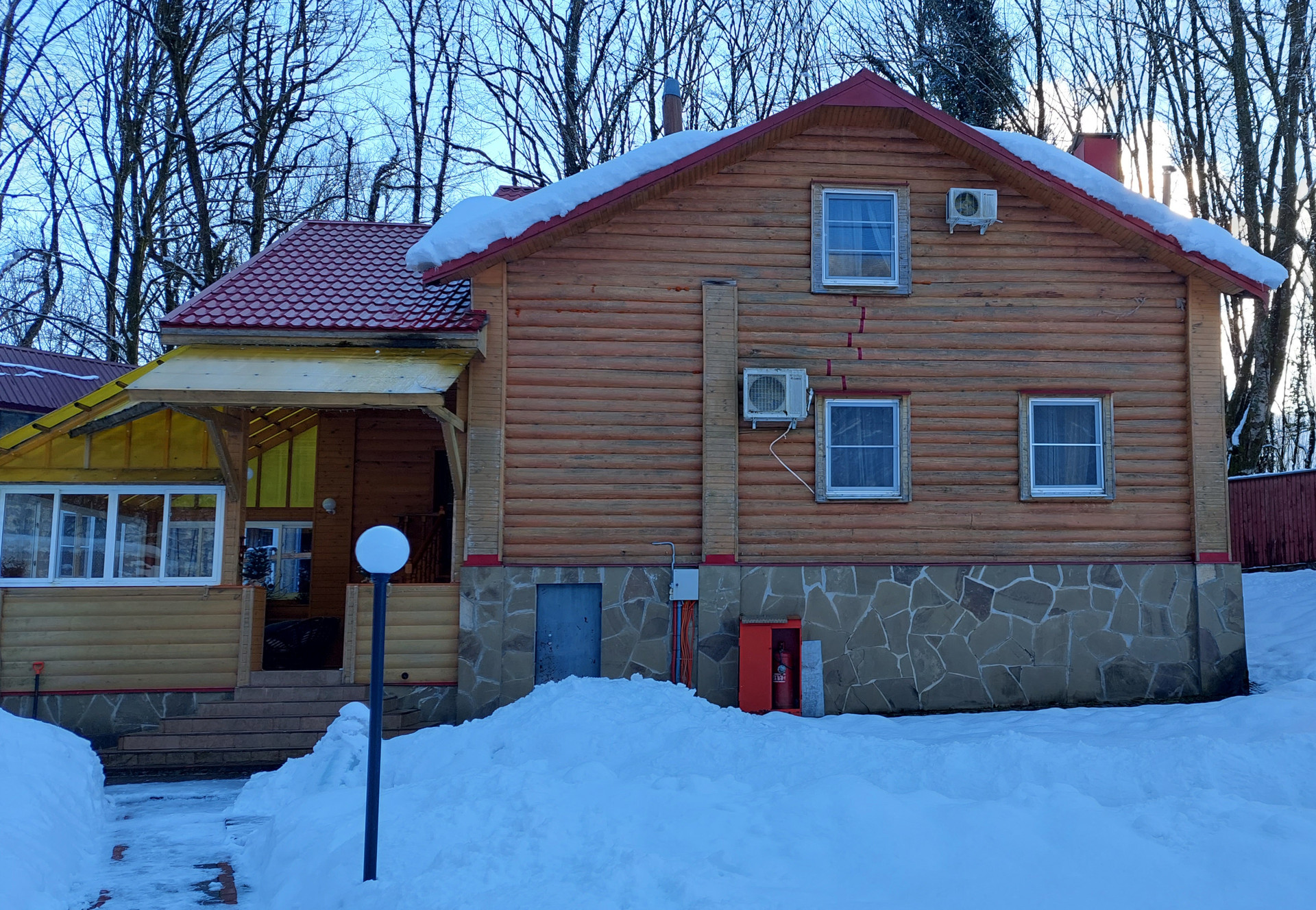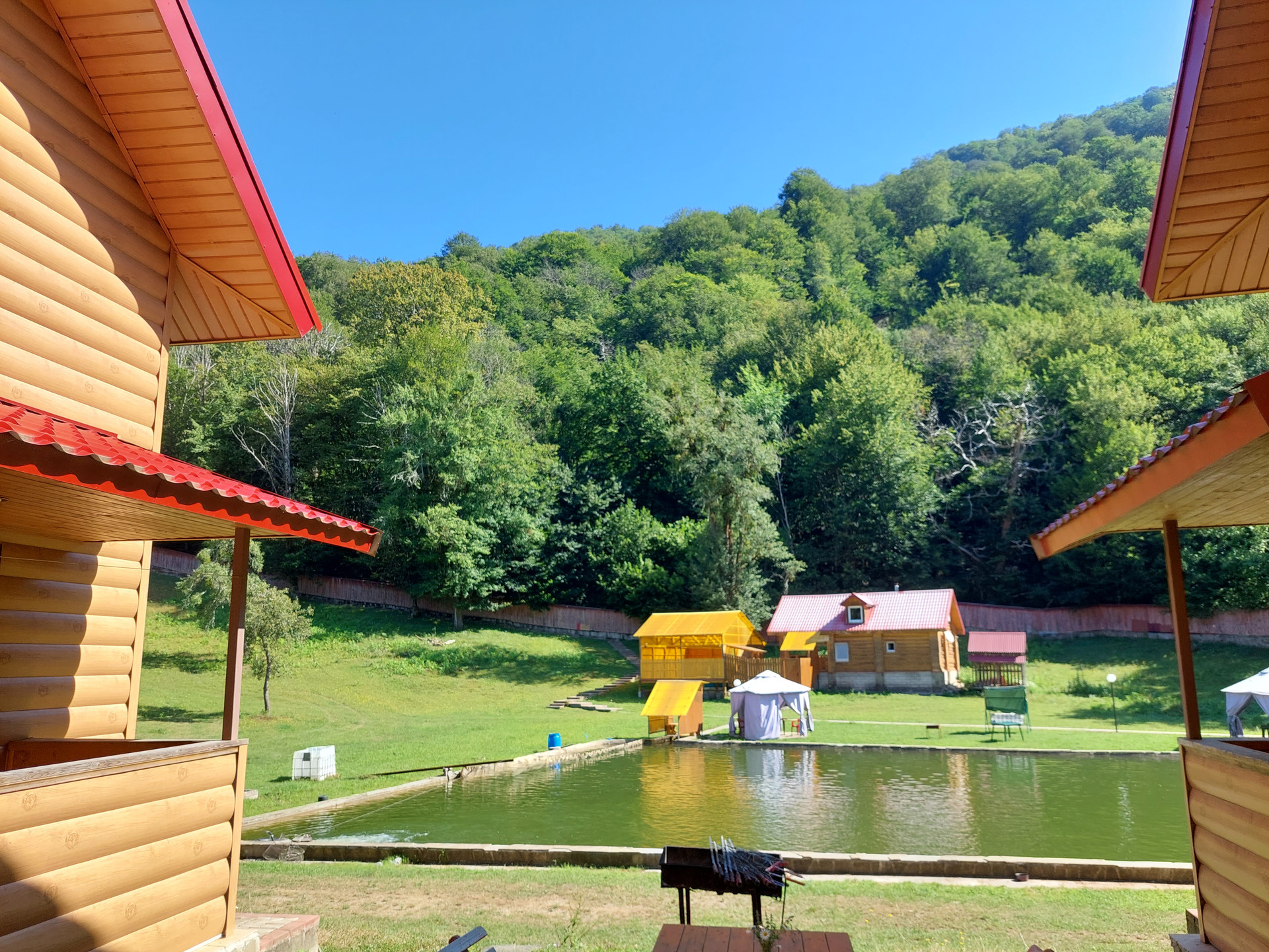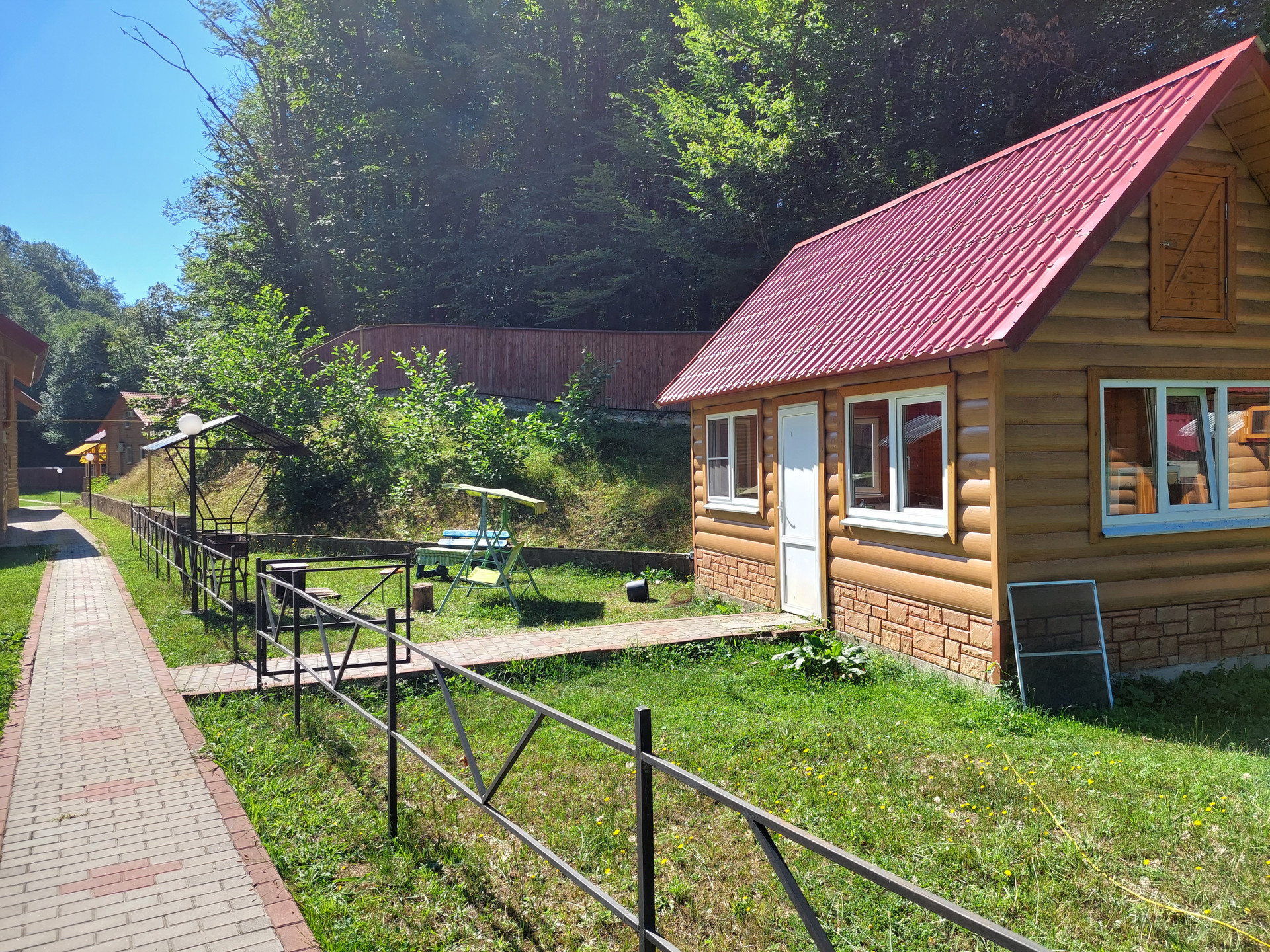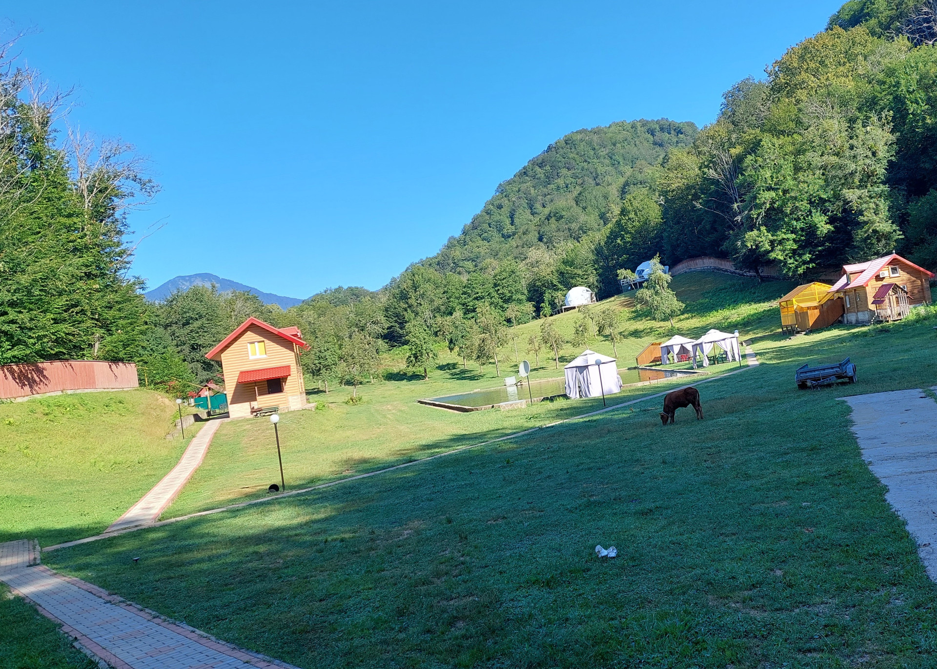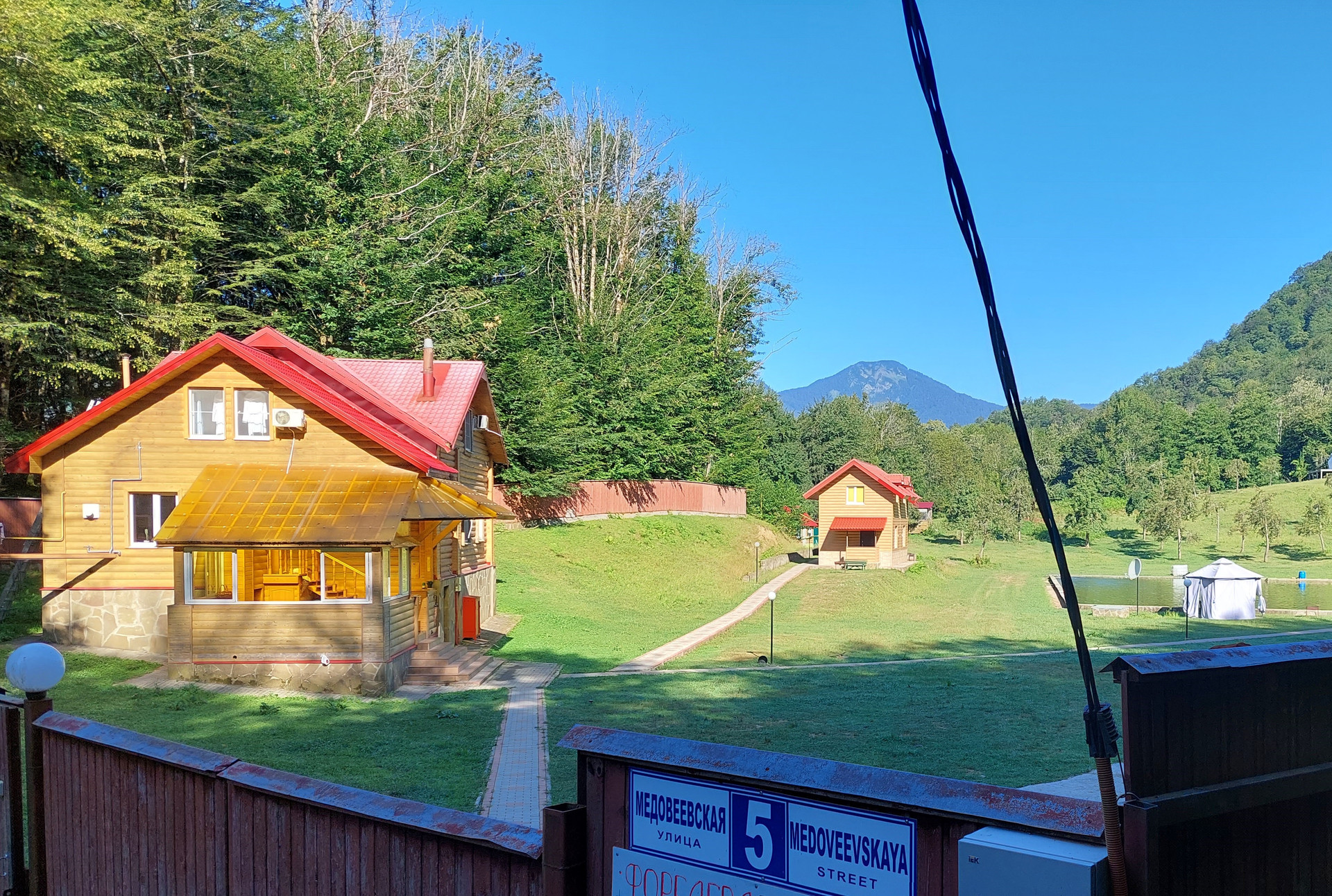 Жилой дом площадью 180 кв.м.( сруб) из круглого бревна ( начало сборки 2005 г., окончание сборки-2011 г) располагается вместе с баней из сруба( площадью около 50 кв.м.) и  двумя гостевыми домиками ( площадью около 70 кв.м. каждый) на берегу рукотворного озера -бассейна с проточной родниковой водой. В озере-живая форель способом самовоспроизводства. Ухоженная территория земельного участка  площадью 1,28 га- практически ровная. Территория усадьбы  огорожена по периметру добротным деревянным забором высотой 2,7 м на бетонном фундаменте. Коммуникации: Электричество -65 кВт, Газ-45 куб.м/час. Имеются технические возможности увеличения объемов. Вода- проточная из родника и собственная небольшая скважина. Канализация-септик.