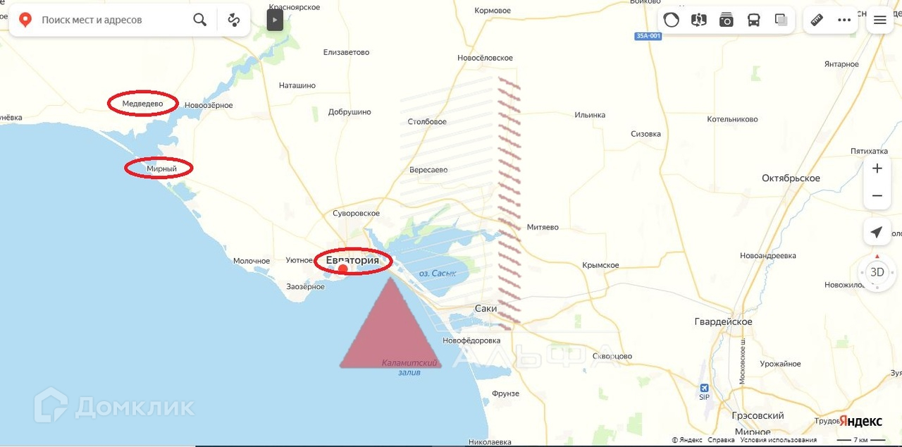 Участок находится в 7 км от моря и пляжа Беляус (один из самых чистых пляжей на побережье Крыма.) Расстояние до озера Донузлав 1,5 км.