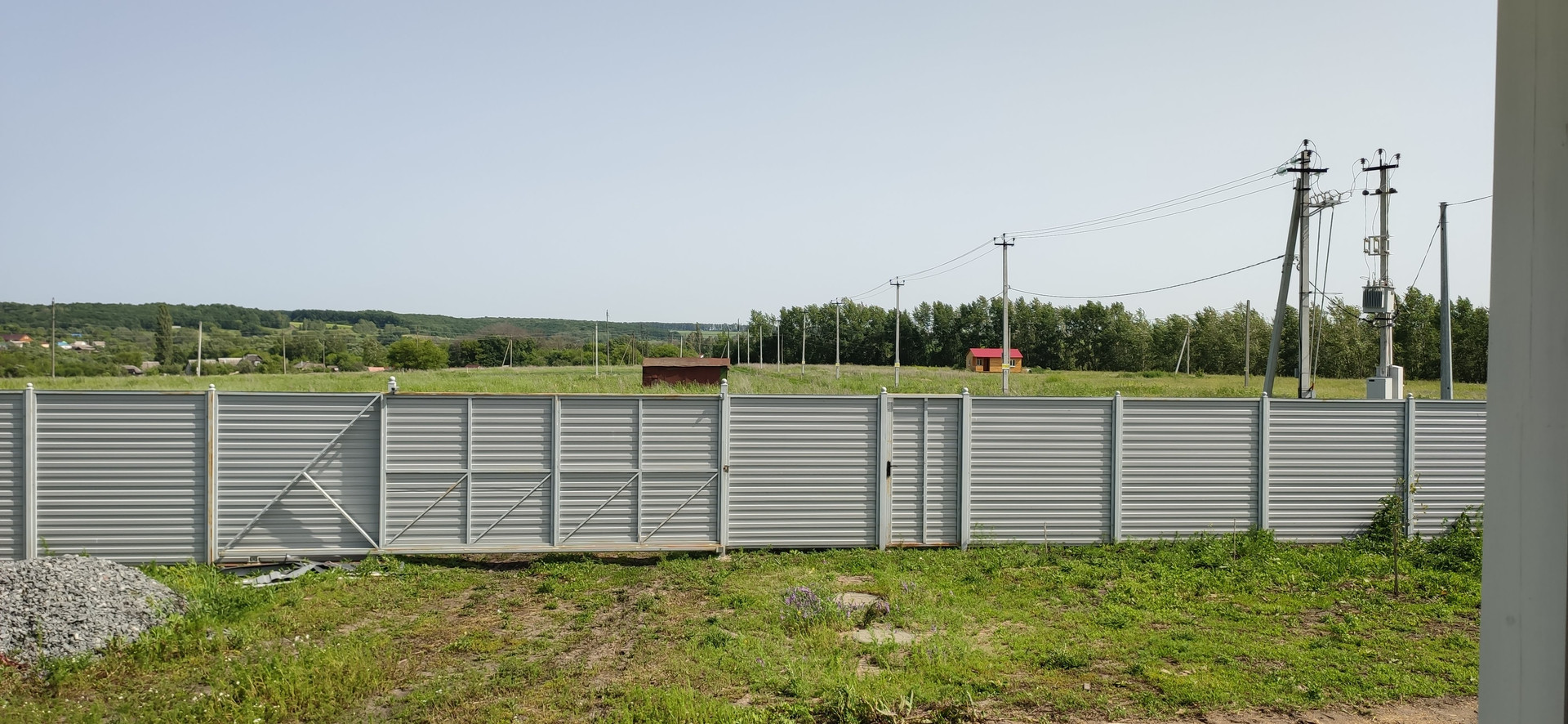 Участок квадратный угловой. Забор со стороны улицы (2 стороны) из проф. листа в цвет крыши дома, со сторон соседей – сетка рабица. Две калитки, ворота 4 п.м откатные с подготовкой к автоматизации.