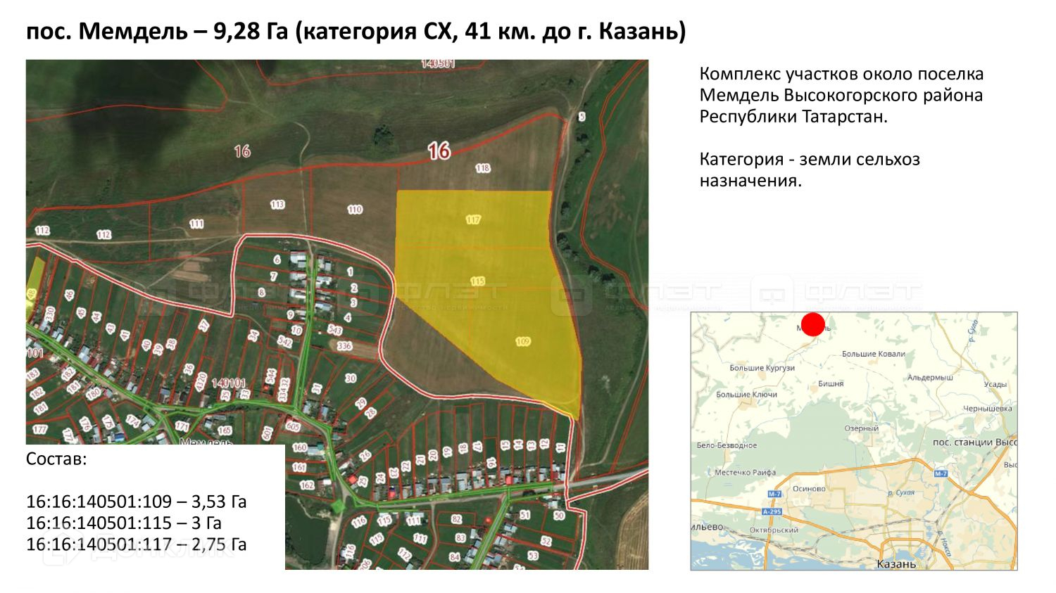 Объект №82713  Участки в экологически чистом районе Земельные участки, относящиеся к категории земель сельскохозяйственного назначения, с разрешенным использованием для сельскохозяйственного производства, общей площадью 9,3 га Кадастровые номера участков 16:16:140501:109, 16:16:140501:115, 16:16:140501:117 Участки расположены в 100 м севернее населенного пункта Мемдель Высокогорского района. Идеальное место для организации фермерского хозяйства и строительства усадьбы.  Добавьте объявление в избранное, чтобы не потерять понравившийся объект. Поможем купить земельный участок. Звоните сейчас, проконсультируем. • рассмотрение ипотеки за 2 часа по 2 документам • полное ЮРИДИЧЕСКОЕ сопровождение сделки • подарки покупателям: сертификаты на сумму более 150 000 руб. от партнеров ФЛЭТ Более 200 проектов домов под любой бюджет от надежных застройщиков. Звоните нам с 8.00 до 21.00 или пишите в любое время