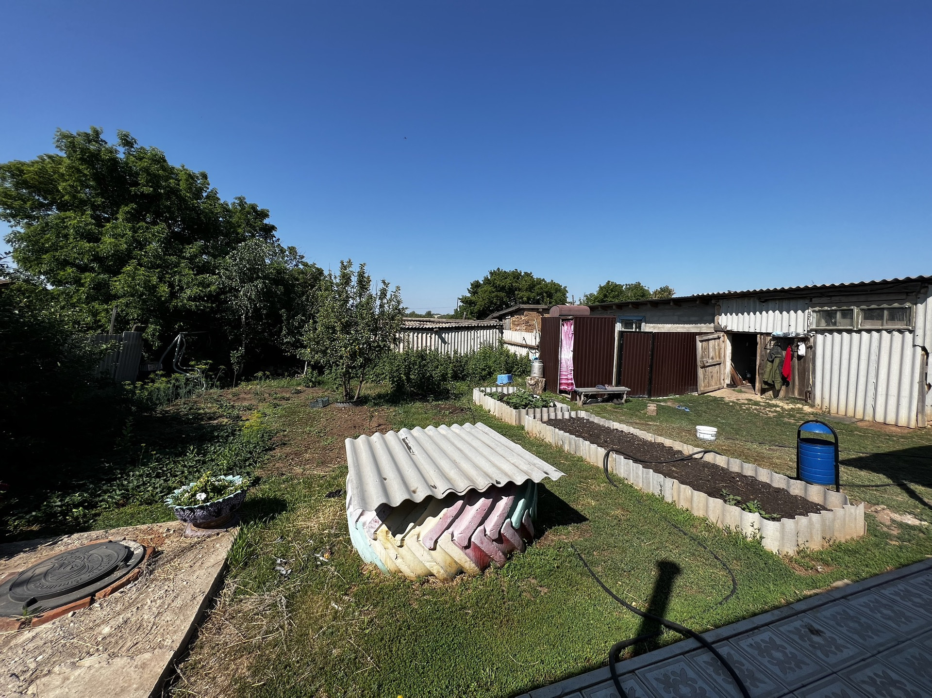 Во дворе растут березы, вишня, груша, яблони, малина, клубника