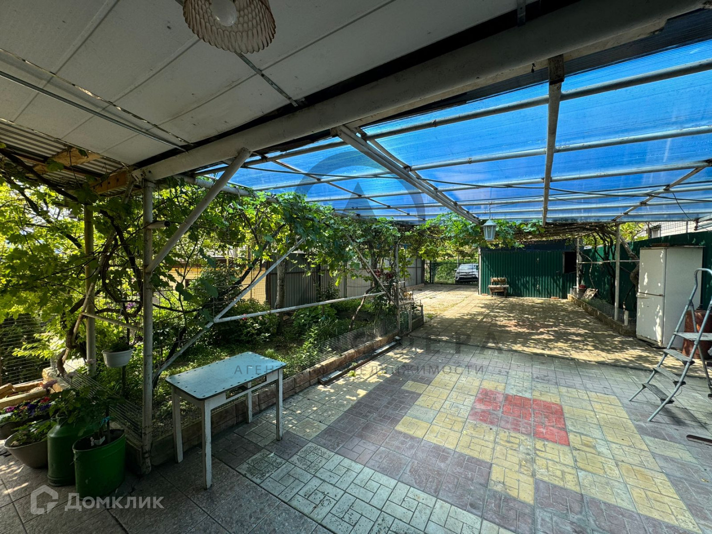 Во дворе гараж, навес, заезд на три автомобиля, хоз. постройки, фруктовые деревья.