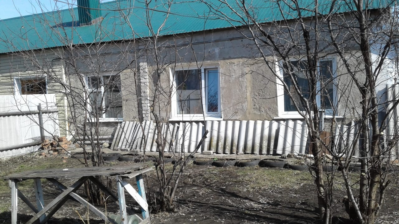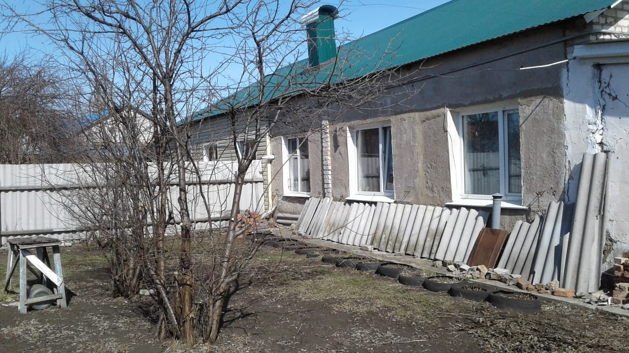Материал стен - шлакоблоки и кирпич, фундамент - бетонные блоки, перекрытия - железобетонные, крыша - шифер.