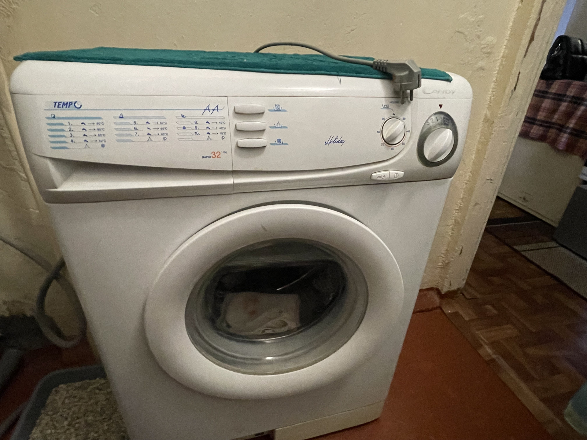 Кухня: небольшой кухонный гарнитур, обеденная зона, газовая плита, стиральная машина.