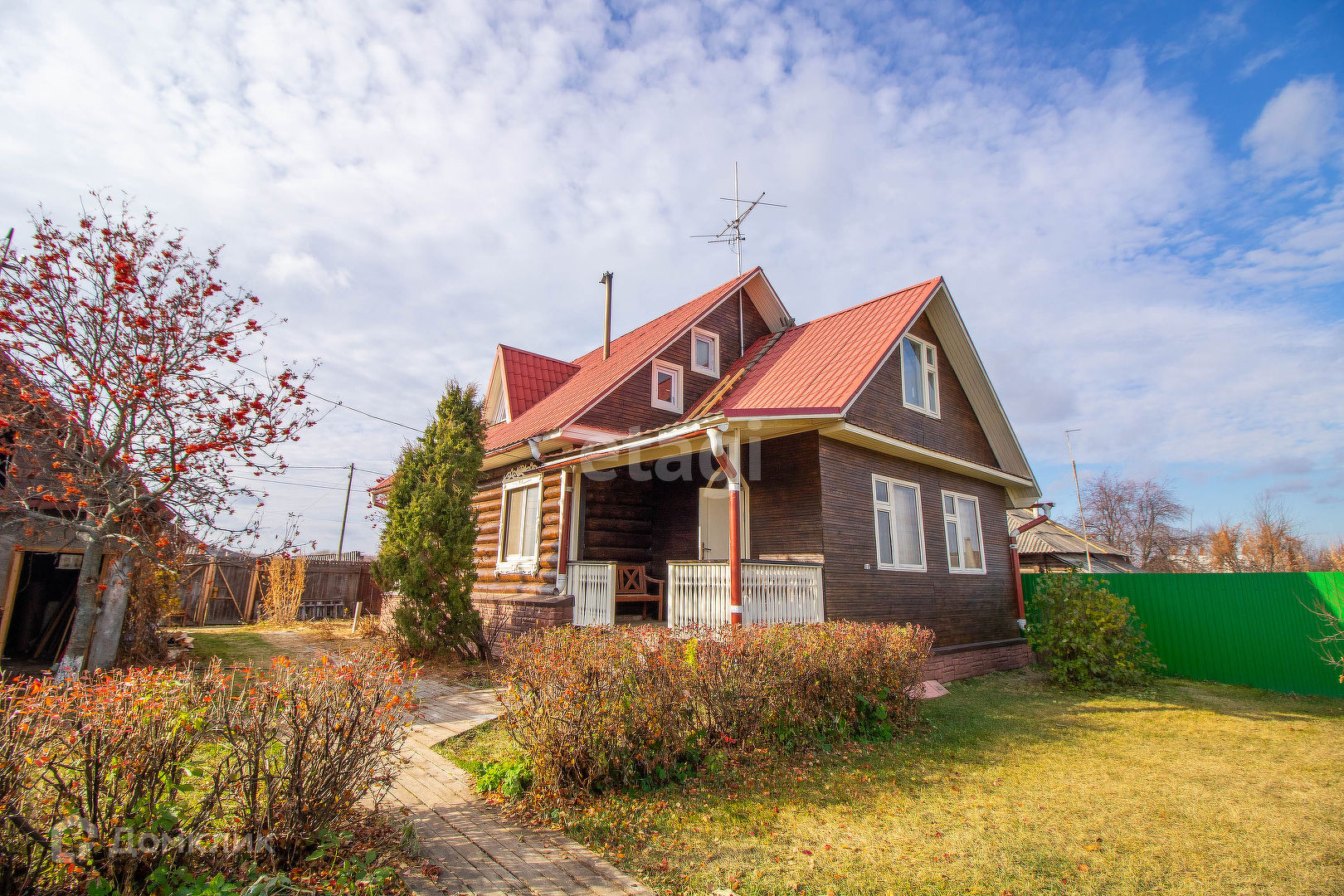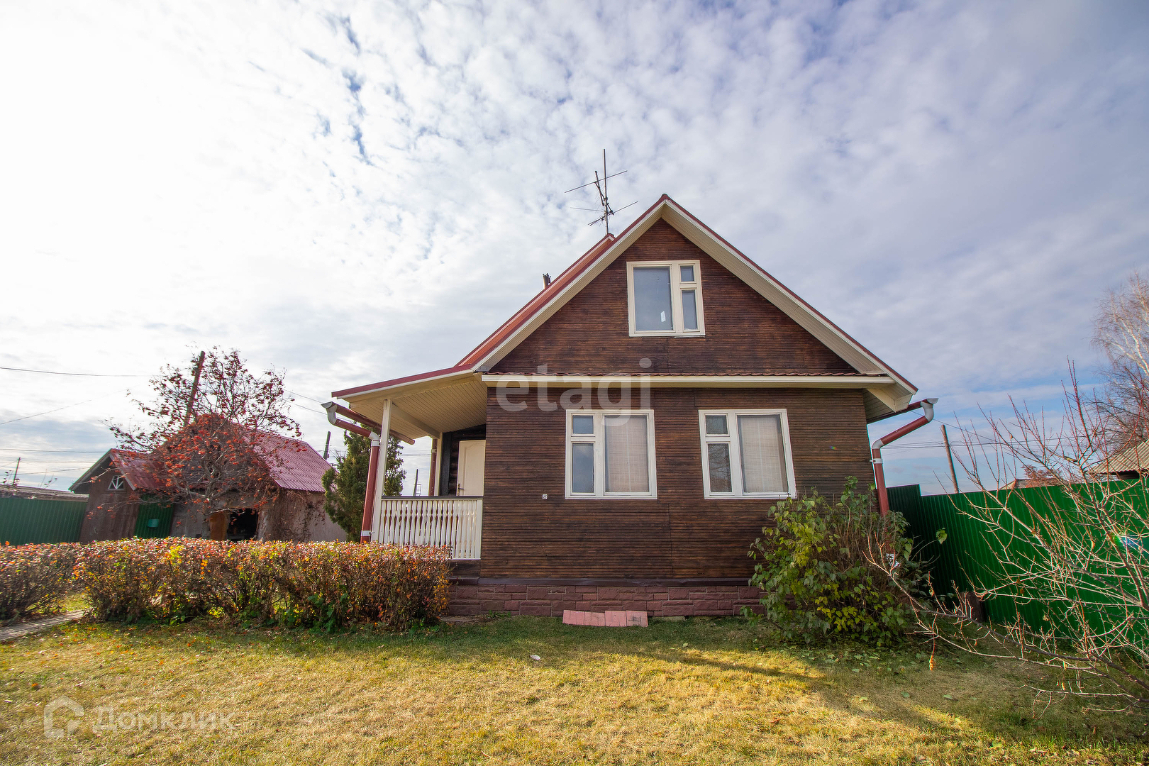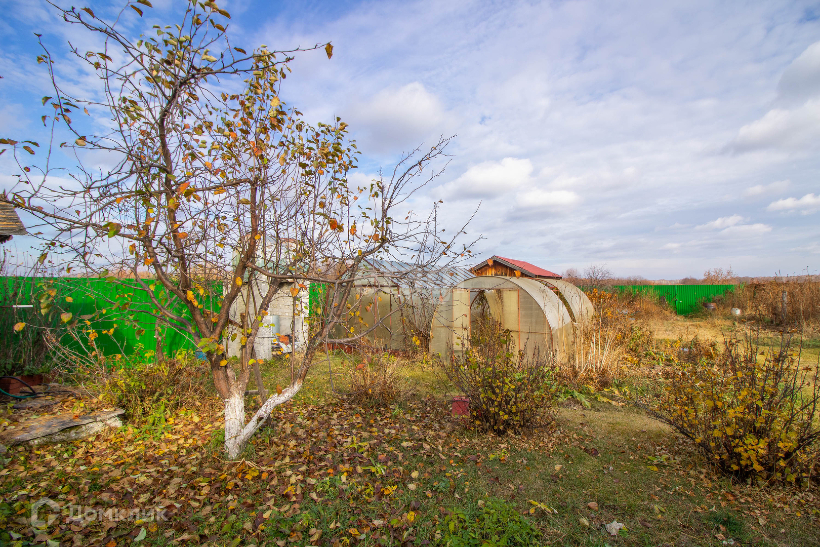 Участок ухоженный, плодовые и декоративные деревья (груша, яблоня, абрикос), кустарники (смородина, малина, жимолость), газон.