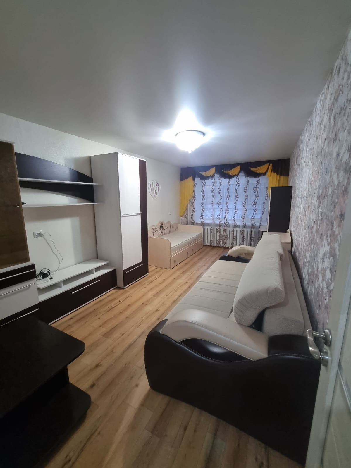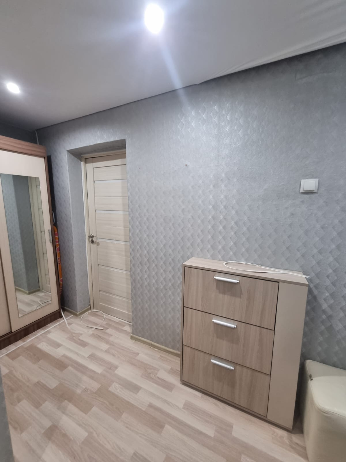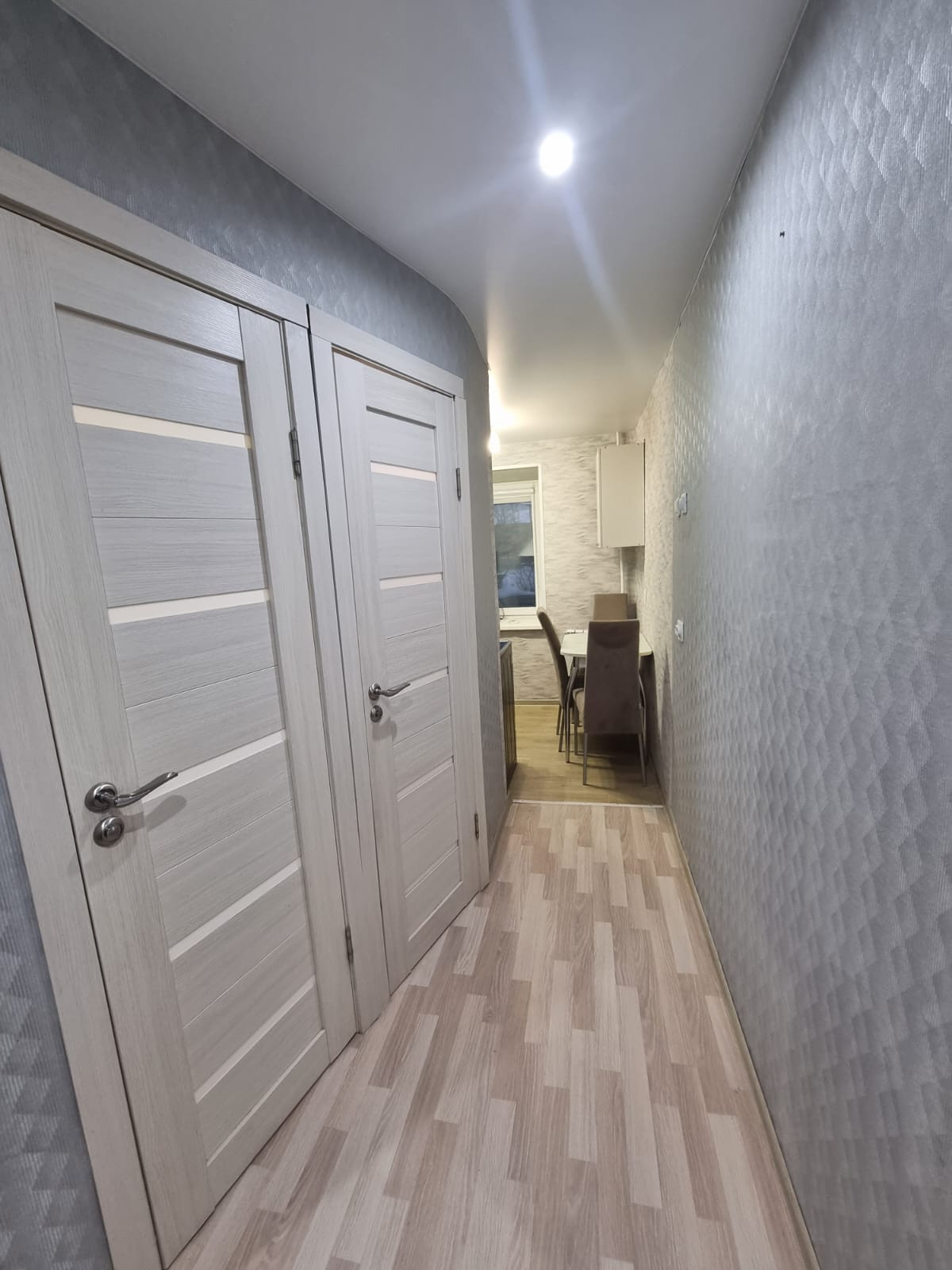 Железная дверь, Ламинат, Натяжной потолок, Пластиковые окна, Стены выровнены, Софиты