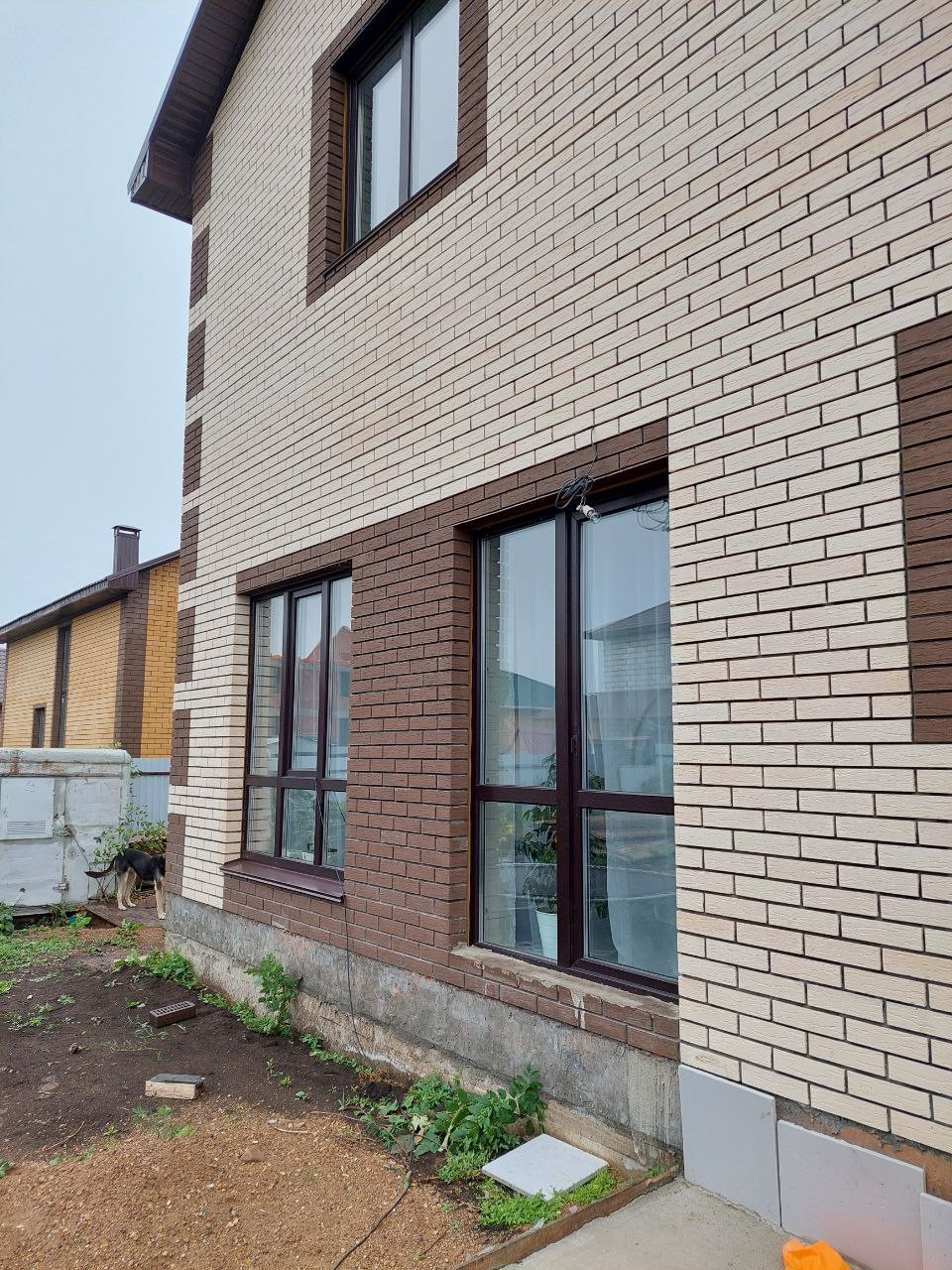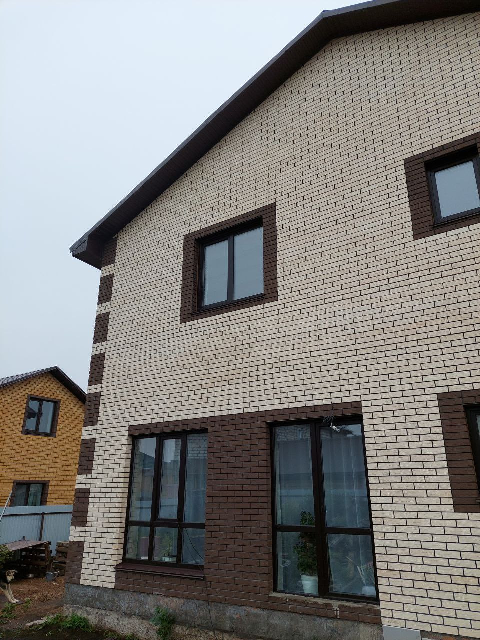 ✅ Дом 12x12 м. Стены дома изготовлены из газобетоноблоков, теплошумоизоляционный материал базальтовая вата, дорогой облицовочный кирпич Красная гвардия (самый белый кирпич, представленный на рынке). Крыша покрыта металлочерепицей. Фундамент ленточный. Перекрытия железобетонные. Витражные окна.