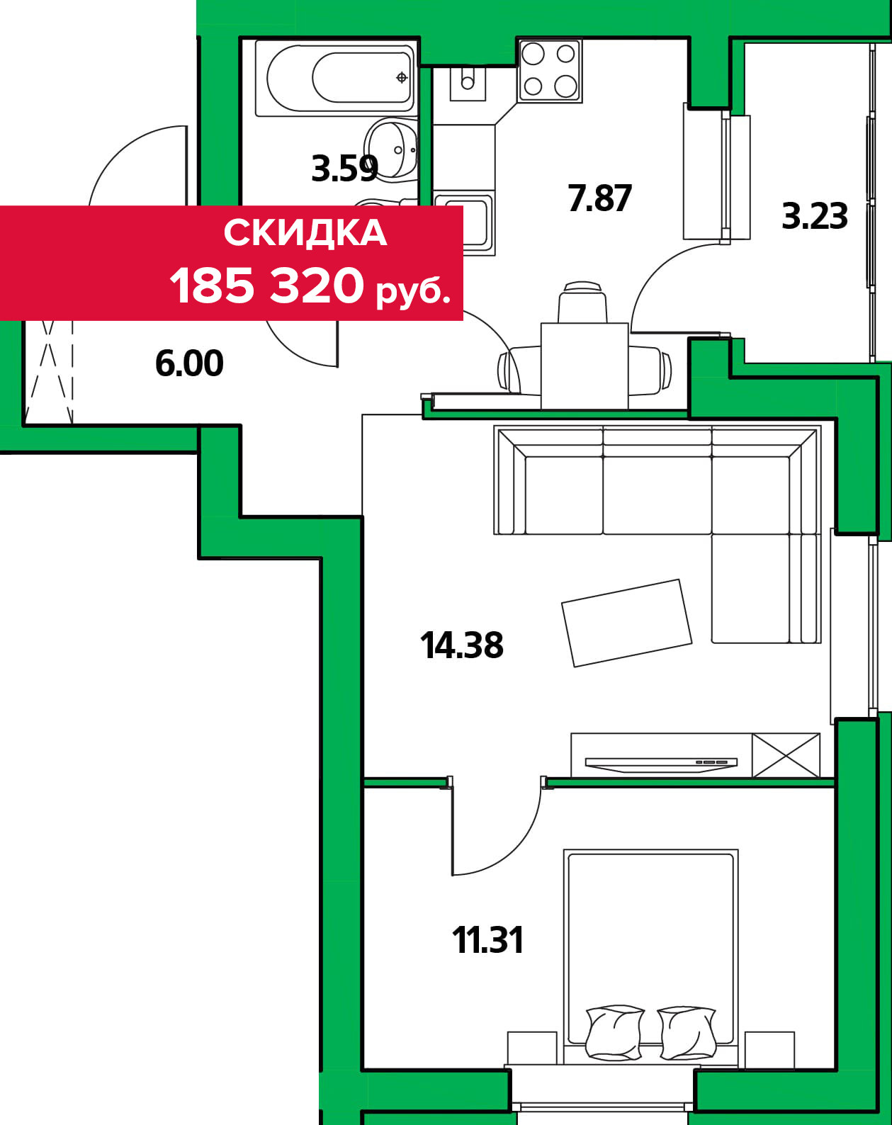 На данную квартиру распространяется СКИДКА в размере 185 320 рублей.