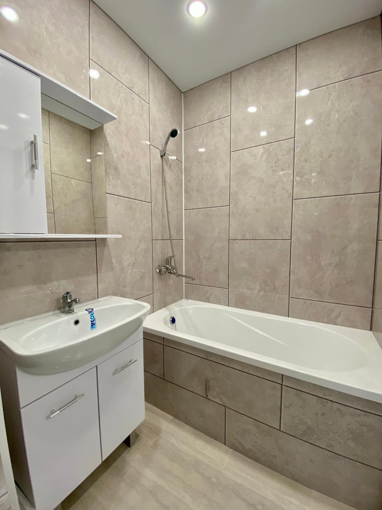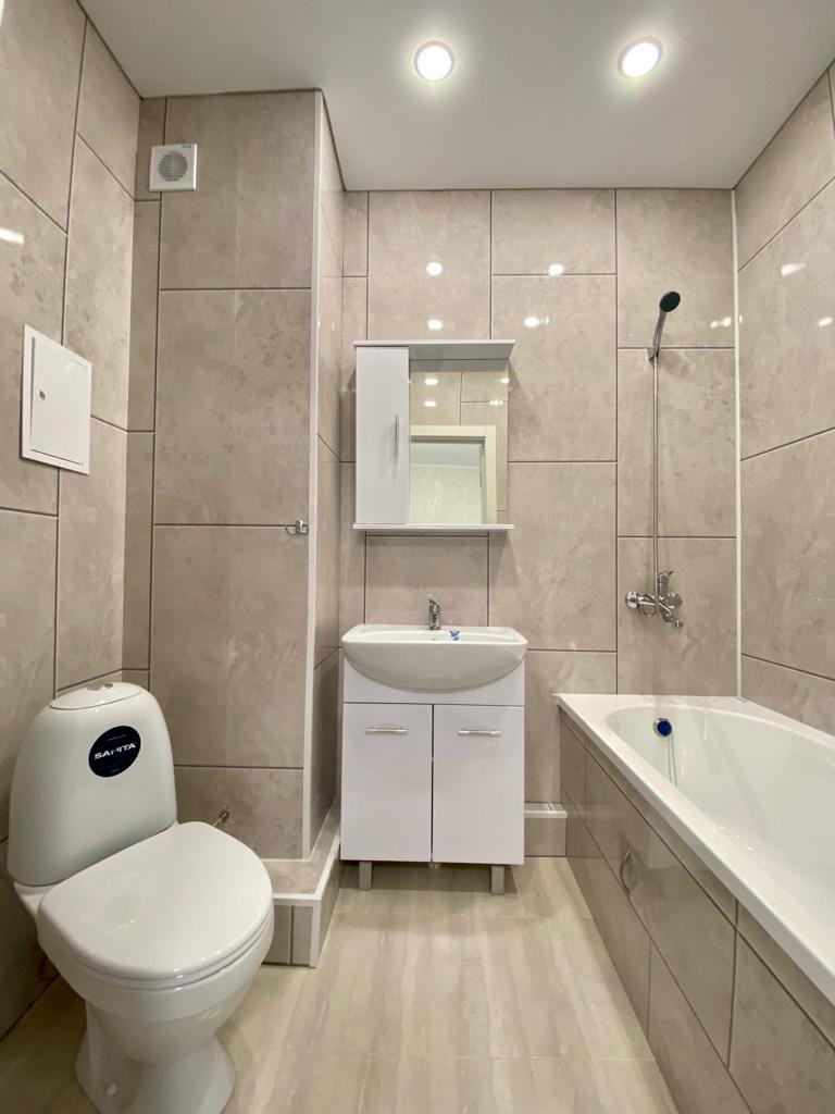 - Санузел облицован кафельной плиткой, установлена хорошая сантехника (ванная, раковина с тумбой, унитаз, смесители).