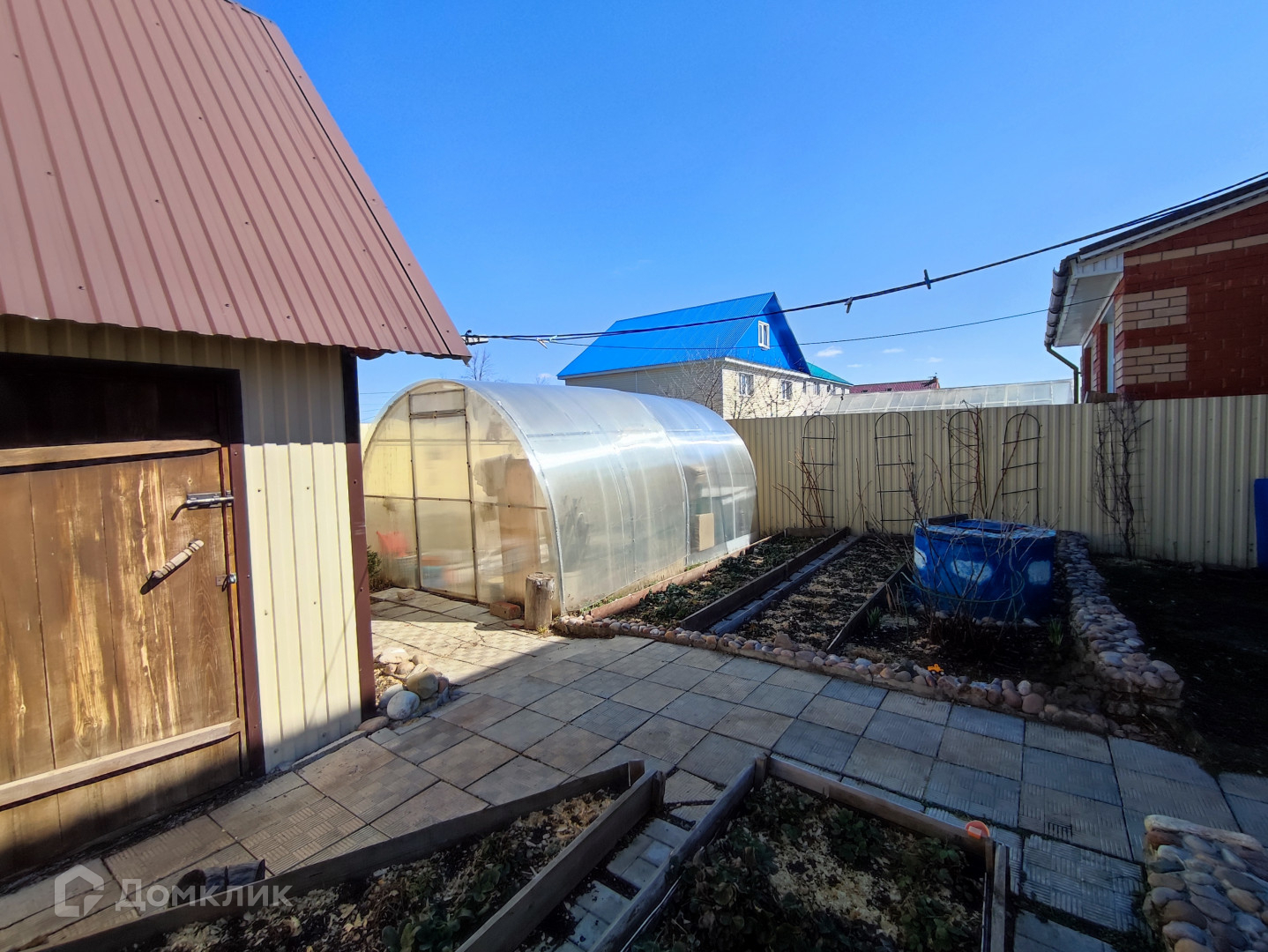 Весь двор уложен тротуарной плиткой, садовая часть двора расположена на заднем участке все грядки обложены декоративным камнем и предусмотрено отдельное место для мангальной зоны.