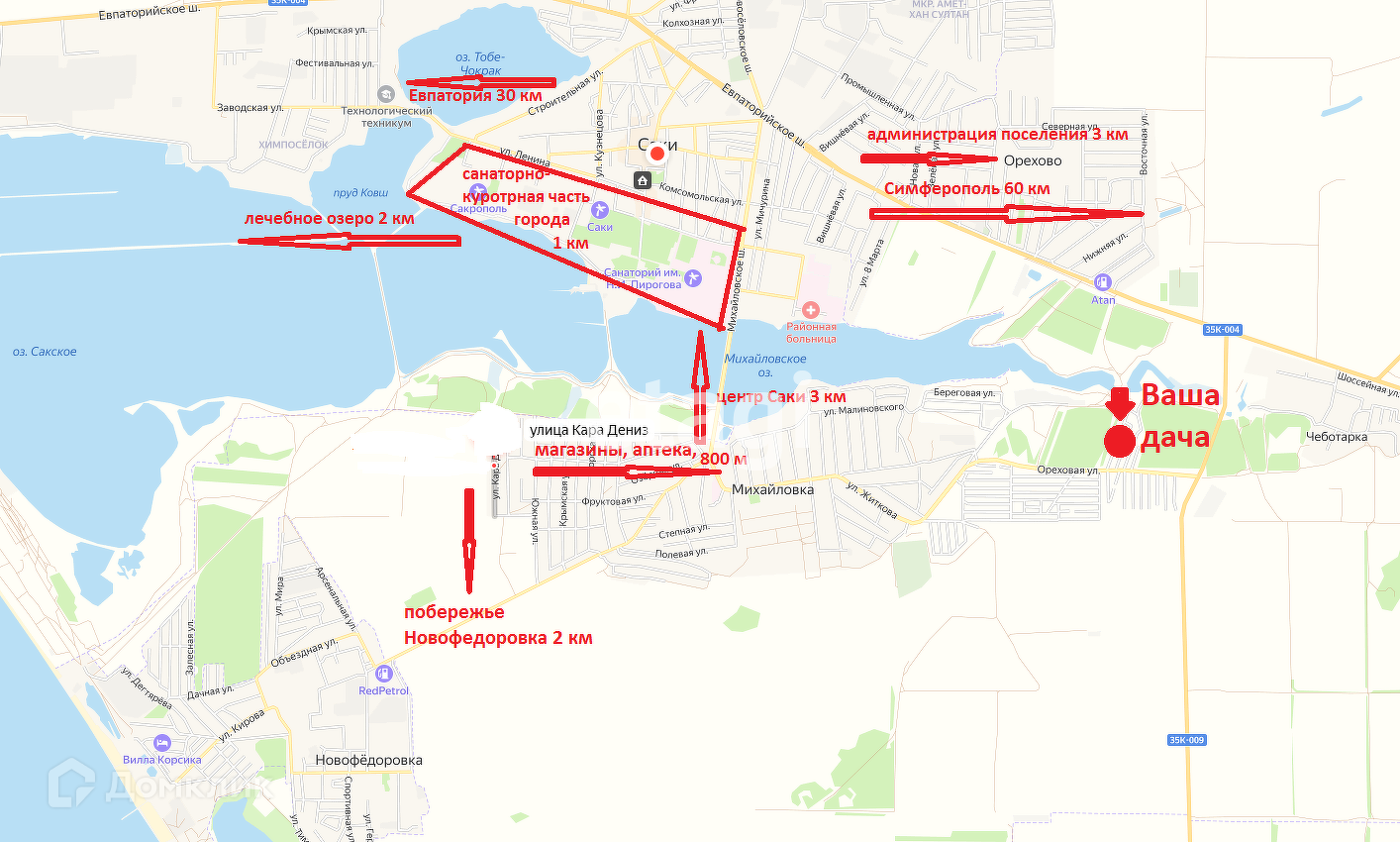 До морского побережья 6 км, до центра г Саки 2 км. Обращайтесь, для Вас будет организован оперативный показ и предоставлена исчерпывающая информация по всем интересующим Вас вопросам.