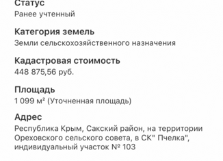 Продается земельный участок в селе Михайловка по улице Парниковая. Общая площадь участка 10 соток. Назначение участка - ИЖС. Участок ровный, прямоугольной формы. Проведено уточнение границ. Коммуникации- рядом. До центра города-курорта Саки mdash; 3 километра 8 мин на автомобиле. До моря mdash; 3 километров 9 мин на автомобиле. При звонк... |