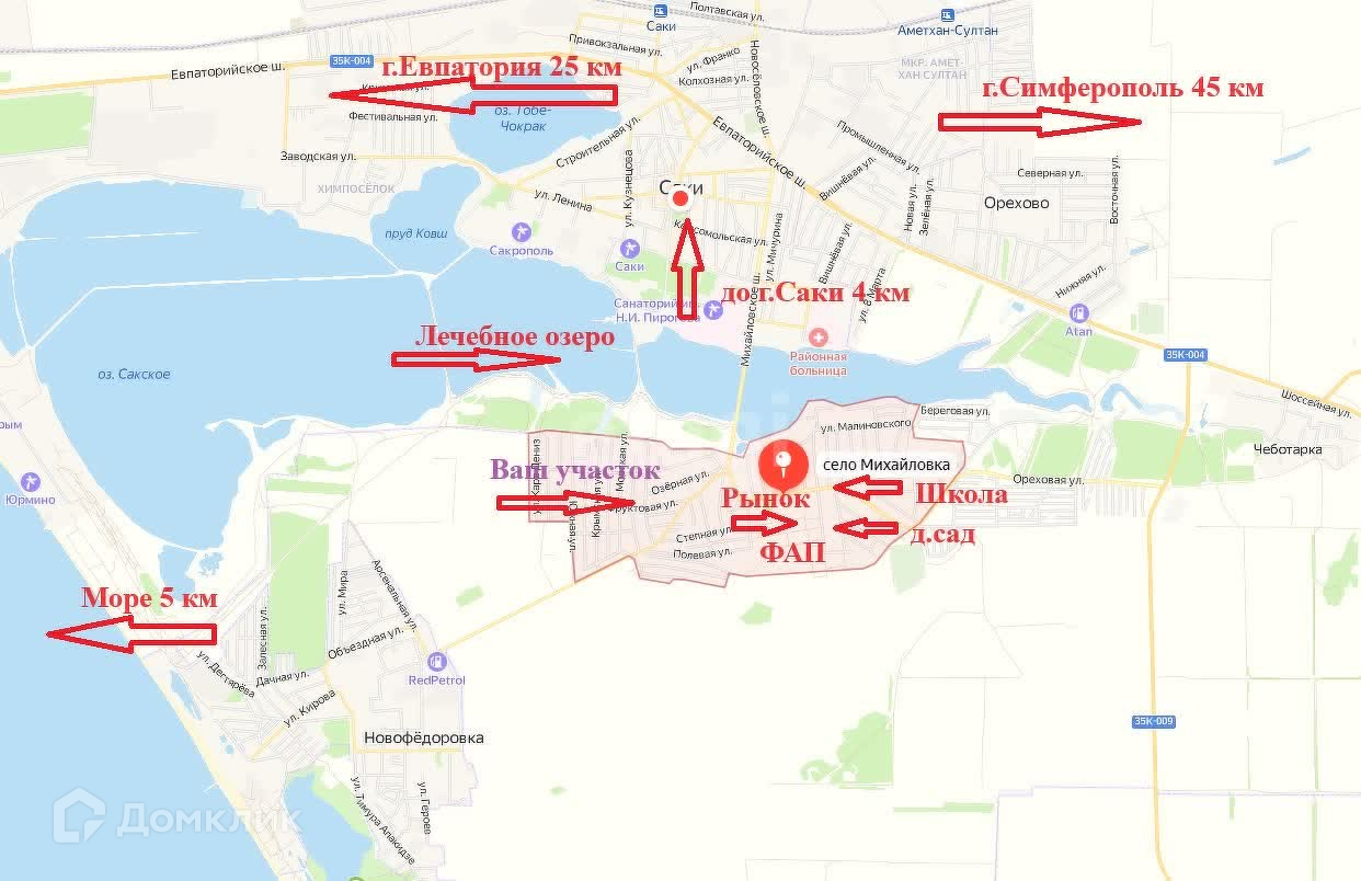Подъезд к участку по грунтовой дороге. Земля обработана. До лесного массива 70 м, сразу за ним расположены Сакские лечебные озера, с лечебными грязями. Воздух и природа настолько чистые, что оттуда просто не хочется уходить. По благоустроенной дамбе, наслаждаясь воздухом соленого озера, можно пешком выйти на набережную г. Саки, прямо к санаториям. До моря 2,5 км. В Новофедоровке школа, садик, большое количество различных магазинов, закусочных, до моря 5 минут езды.