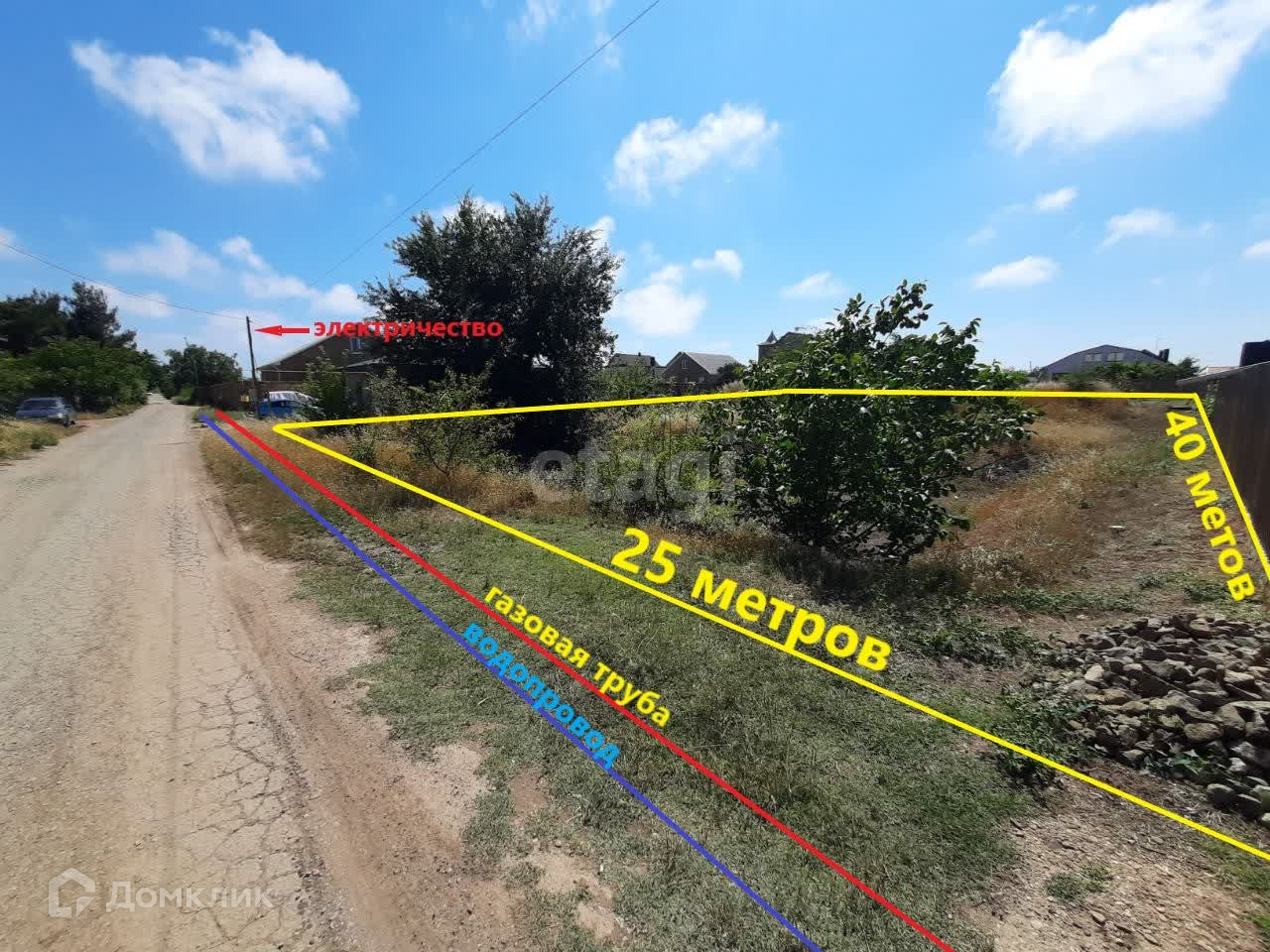 Участок прямоугольной формы (25 на 40 метров) располагается на асфальтированной улице. Все коммуникации (электричество, газ, вода) проходят вдоль границы участка.