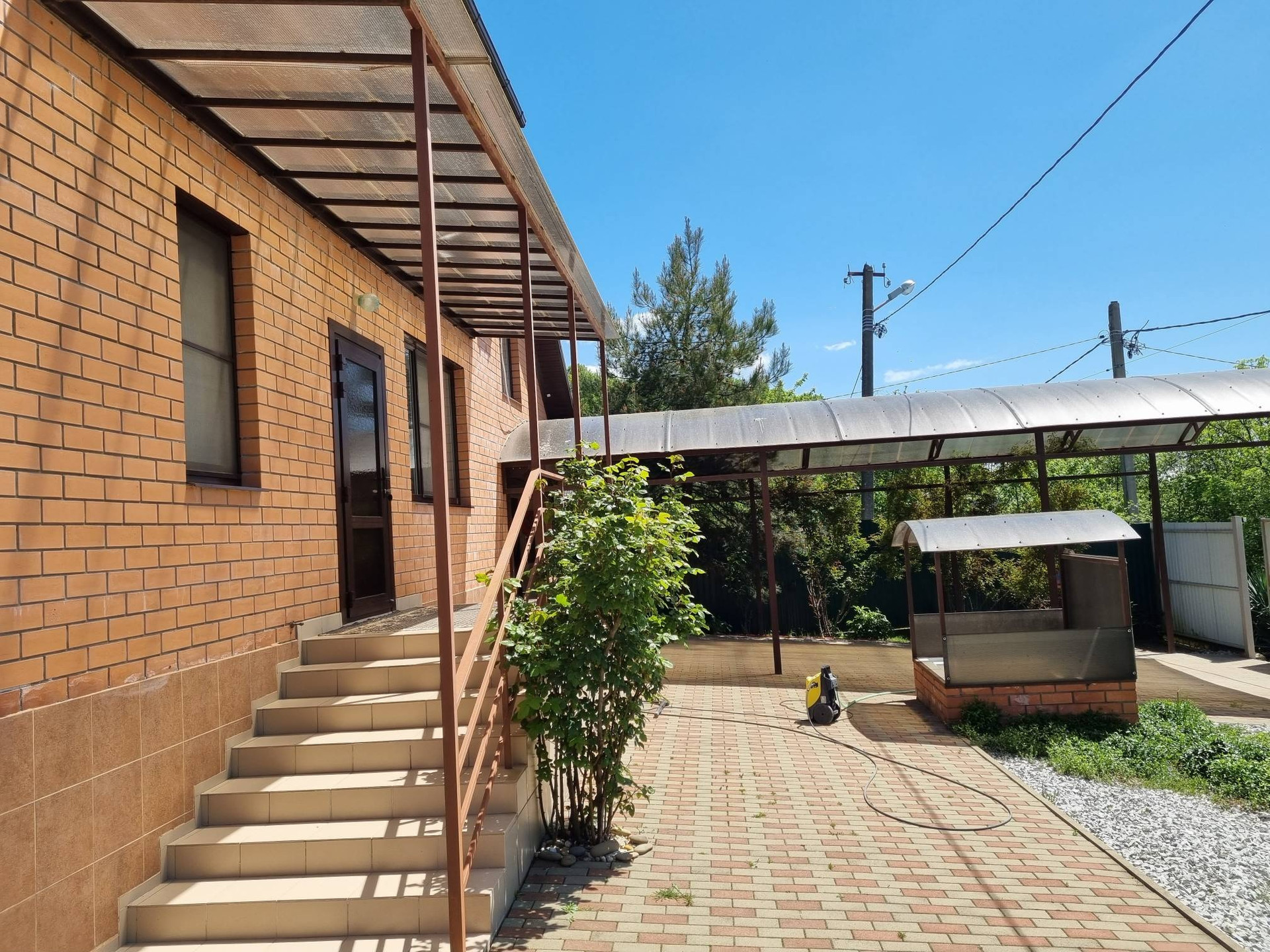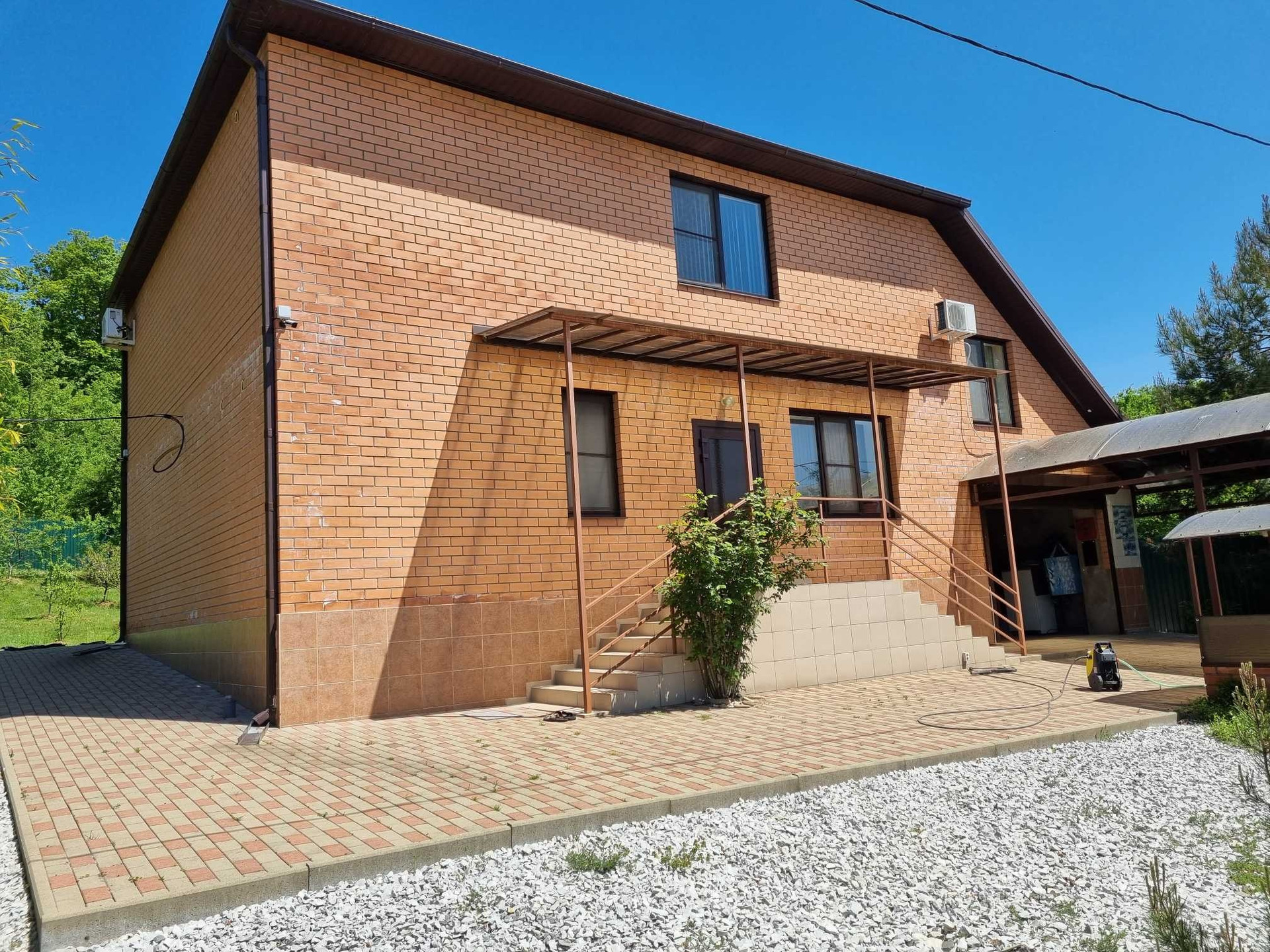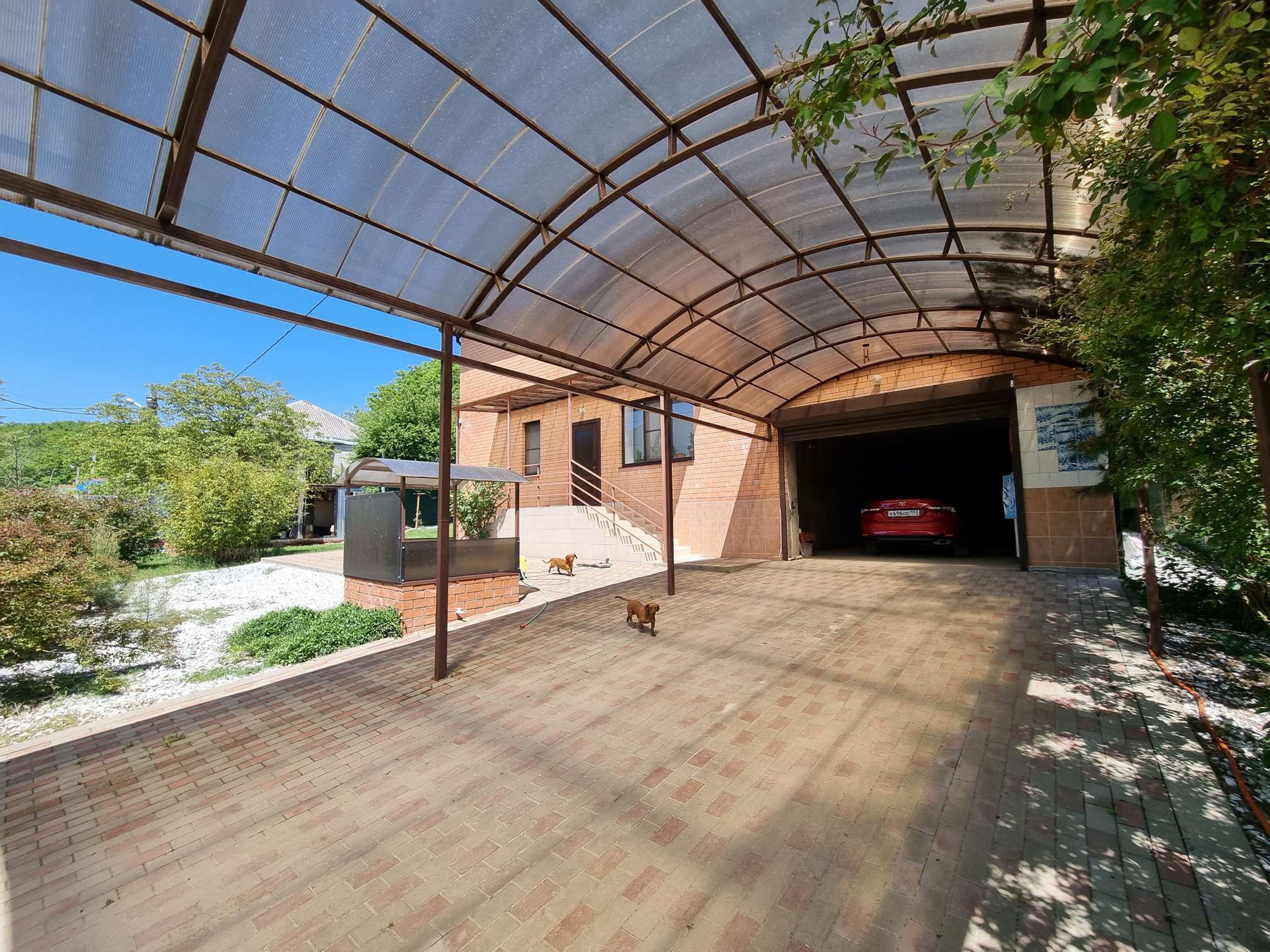 Территория дома облагорожена тротуарной плиткой, есть навес на две машины. Также во дворе оборудована летняя беседка и зона барбекю. В саду плодовые деревья.