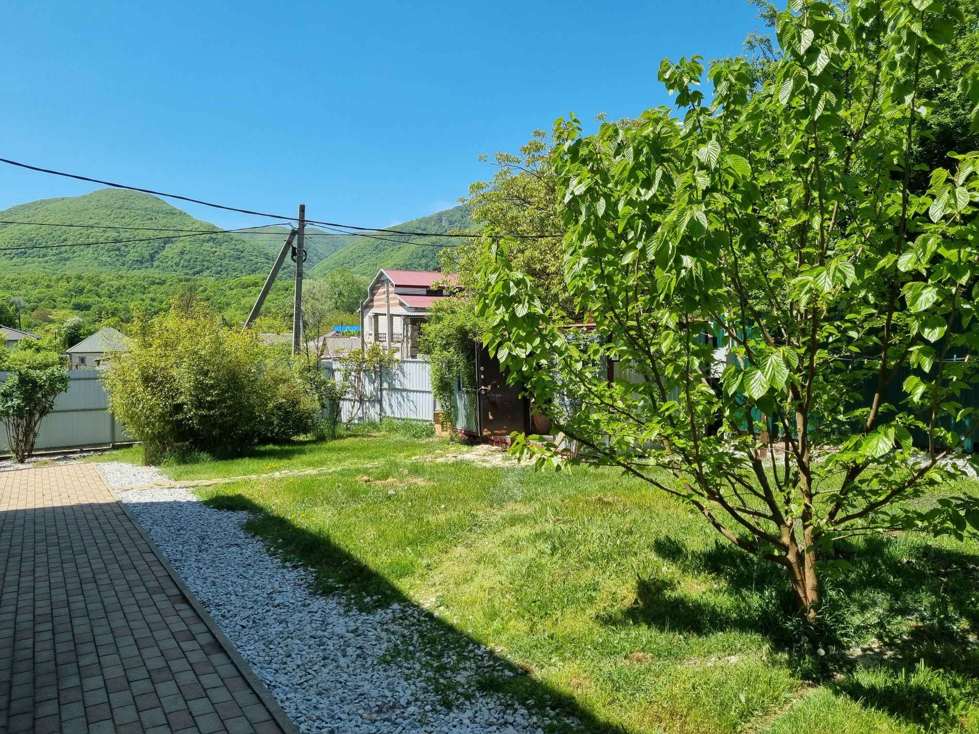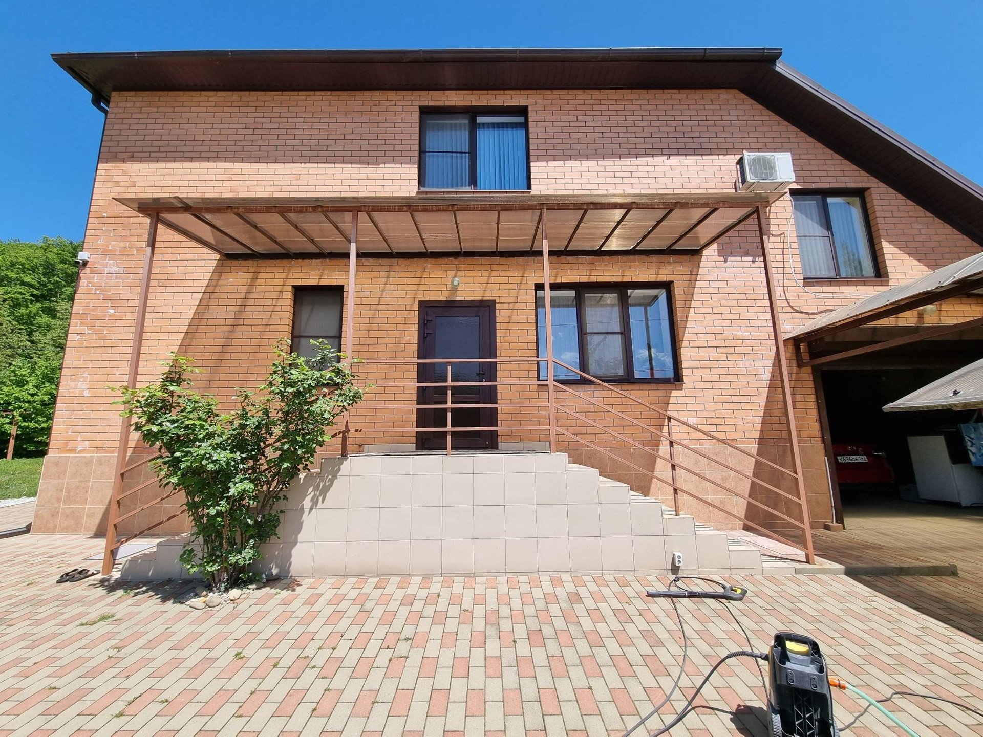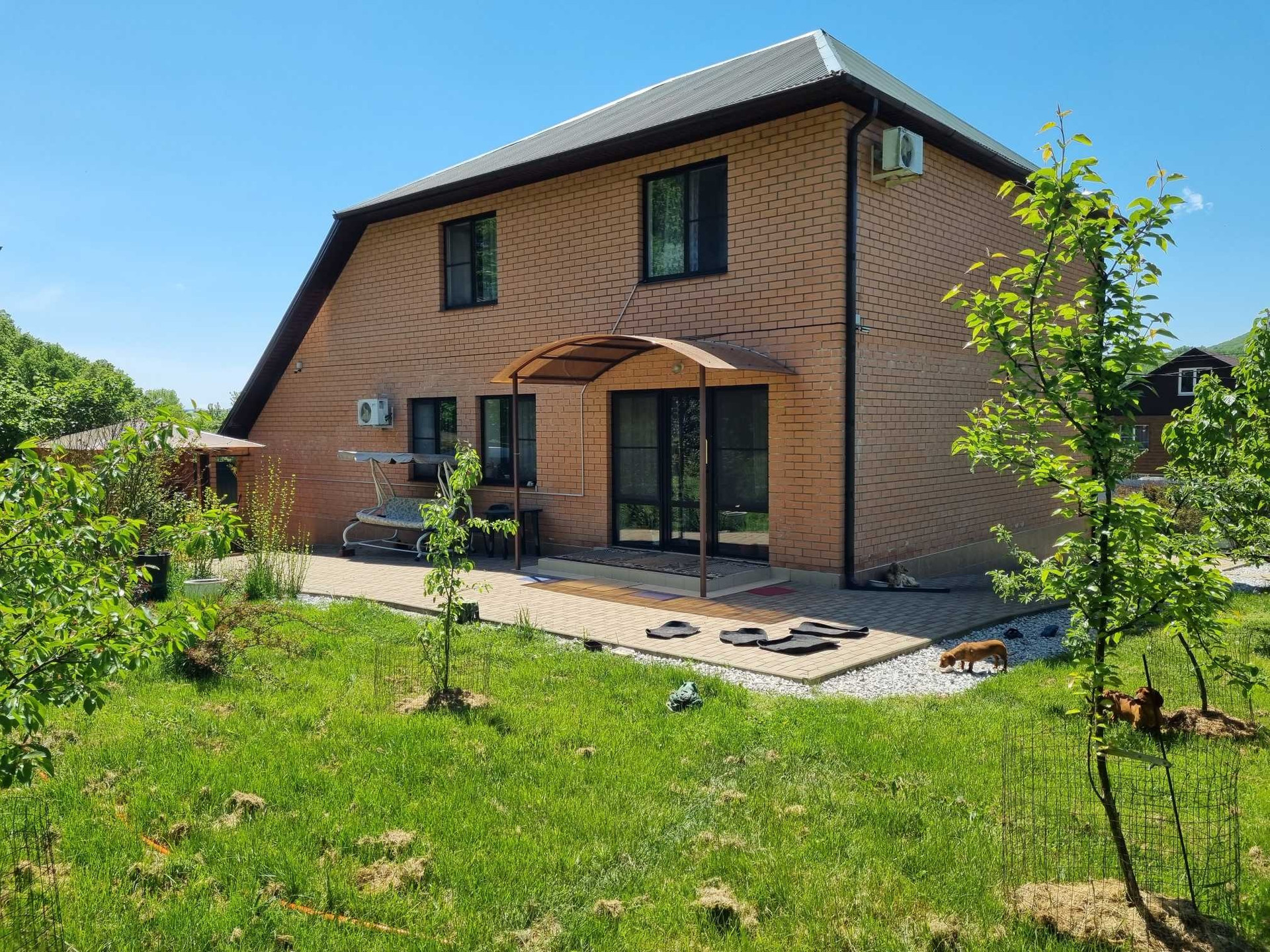 Территория дома облагорожена тротуарной плиткой, есть навес на две машины. Также во дворе оборудована летняя беседка и зона барбекю. В саду плодовые деревья.