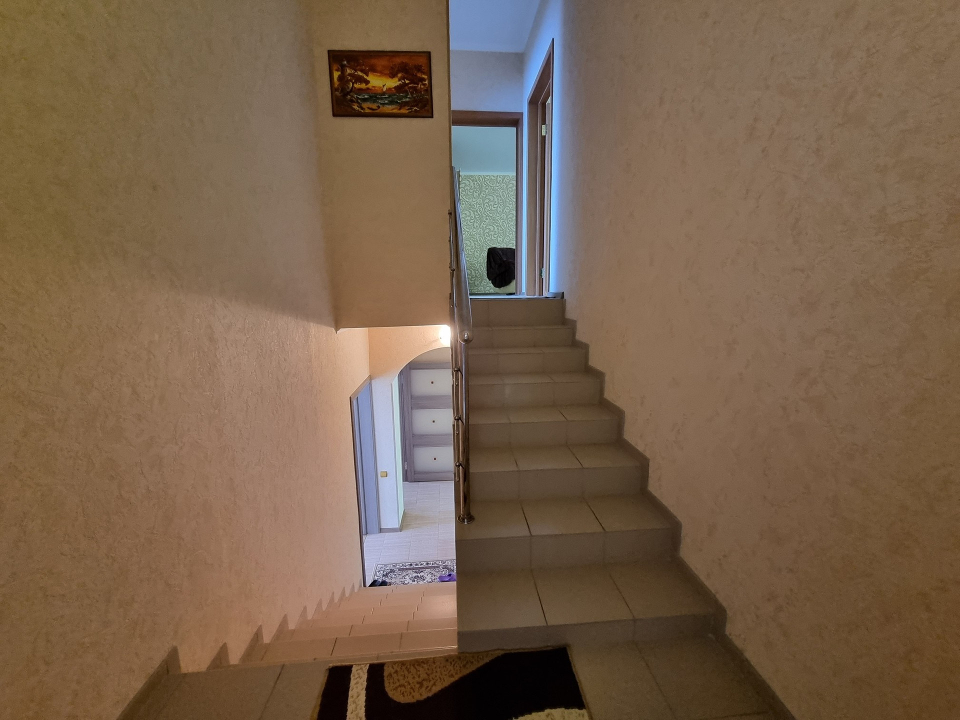 В доме просторная кухня гостиная,  санузел на каждом этаже, изолированные спальни, есть гараж в доме на две машины.