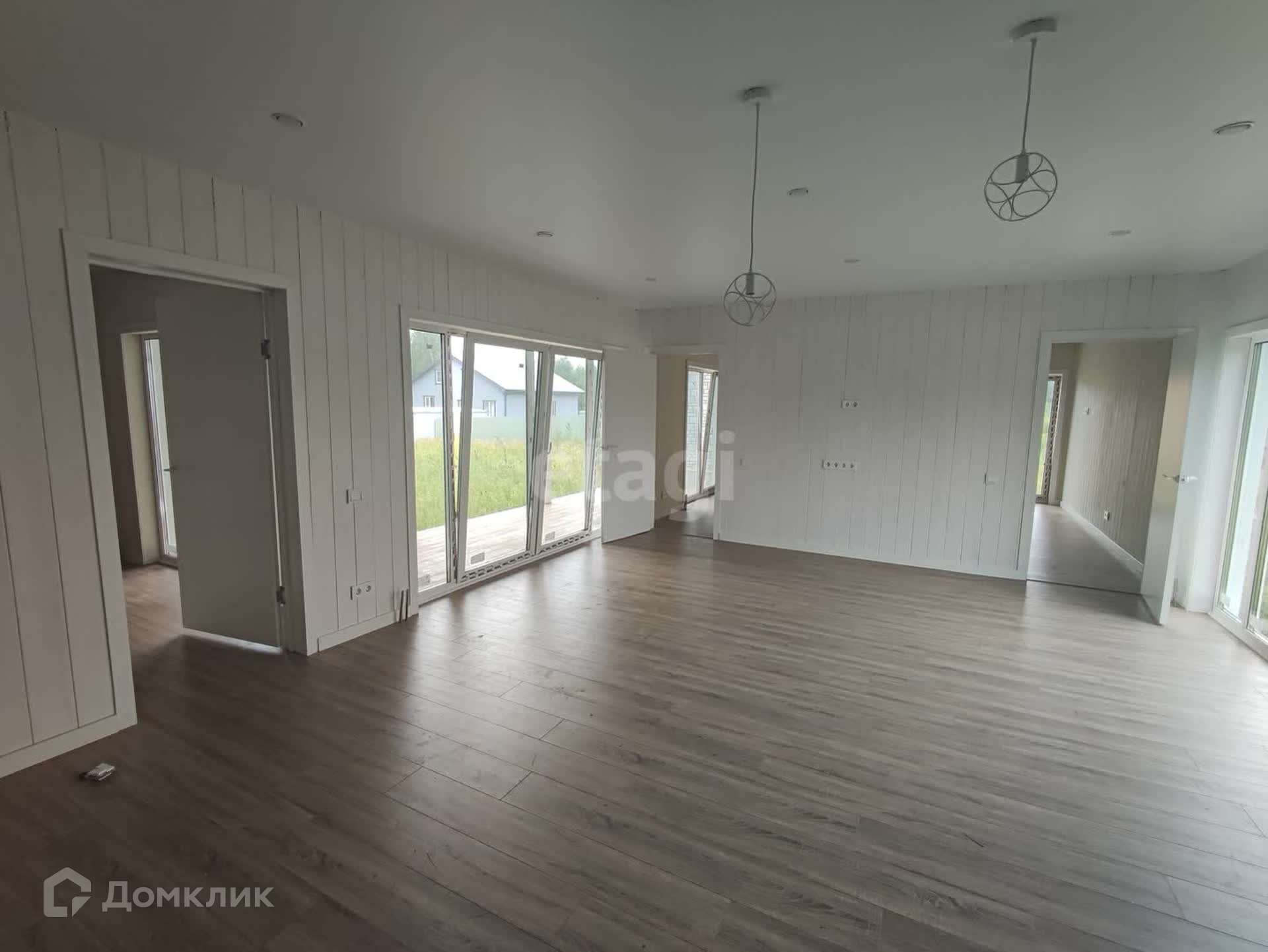 В доме просторная кухня-гостиная с панорамными окнами, 3 комнаты, в одной из них отдельный санузел и гардеробная, котельная и общий санузел.