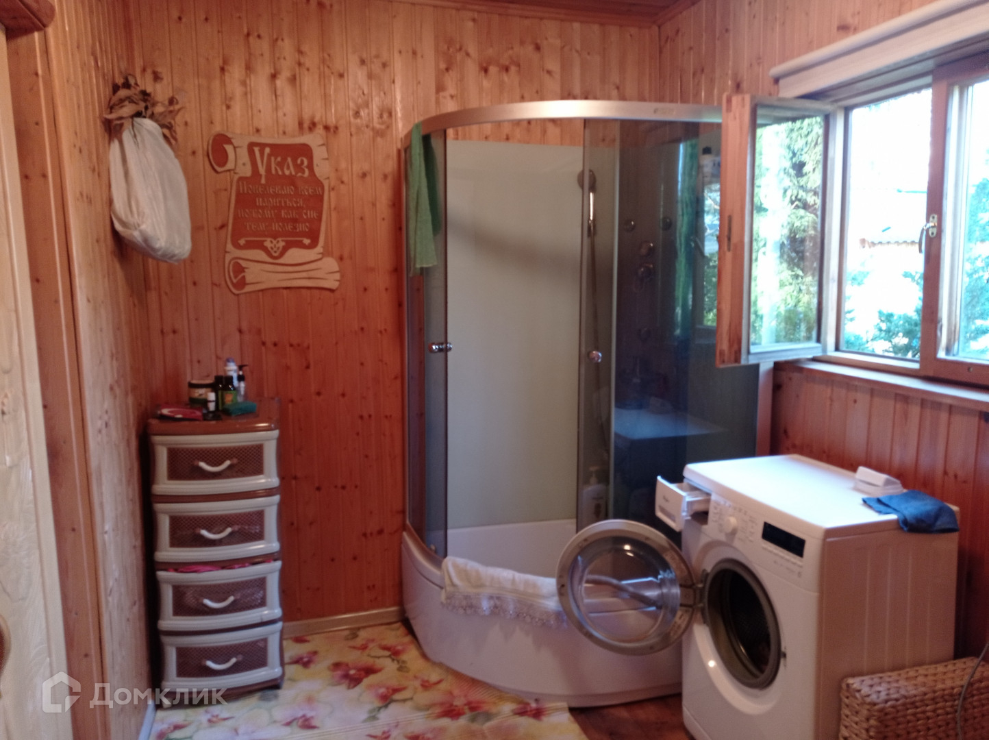 На участке установлена баня из брёвен. С просторной комнатой отдыха и помывочной.