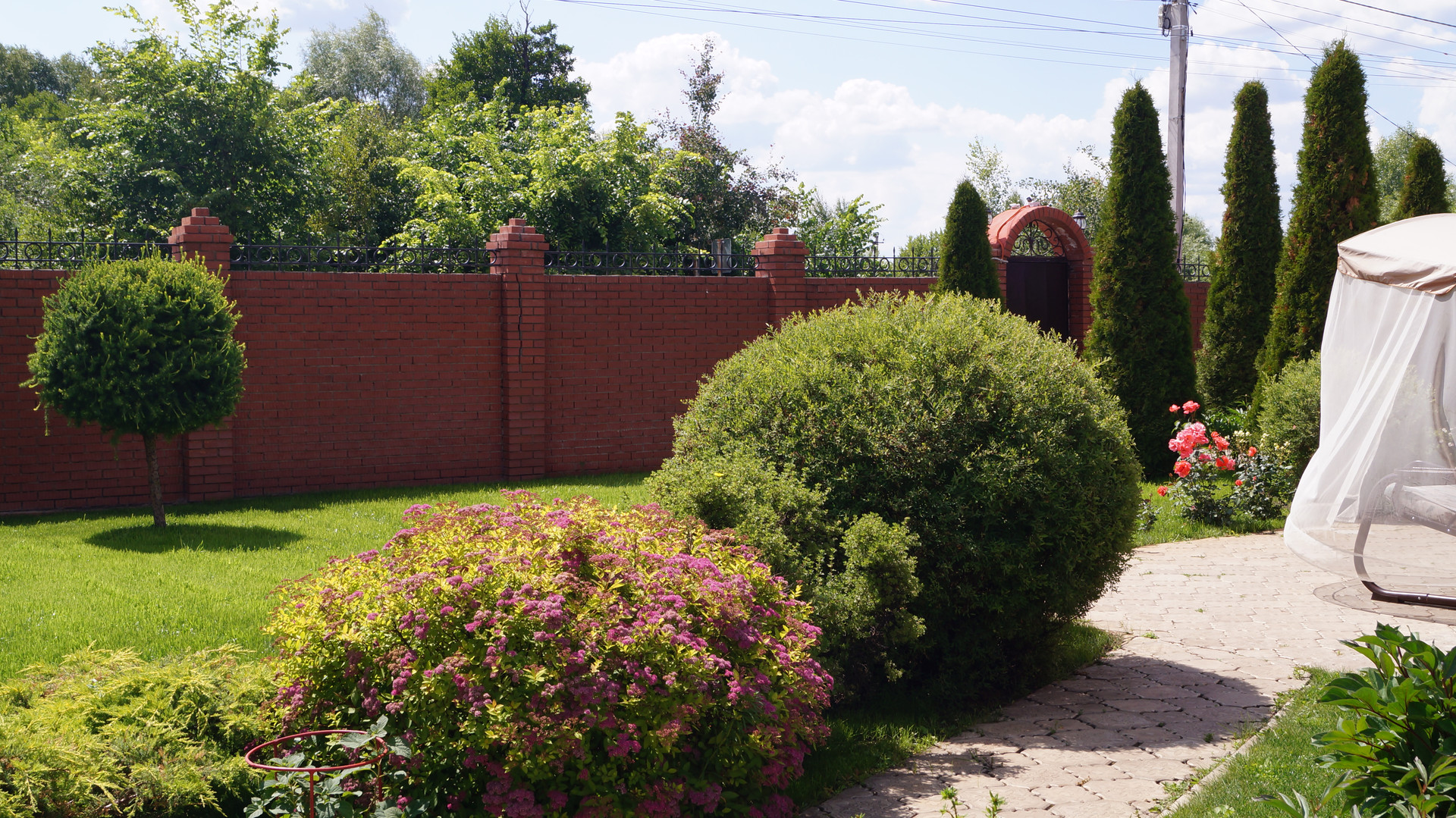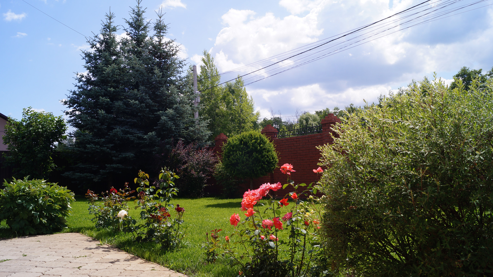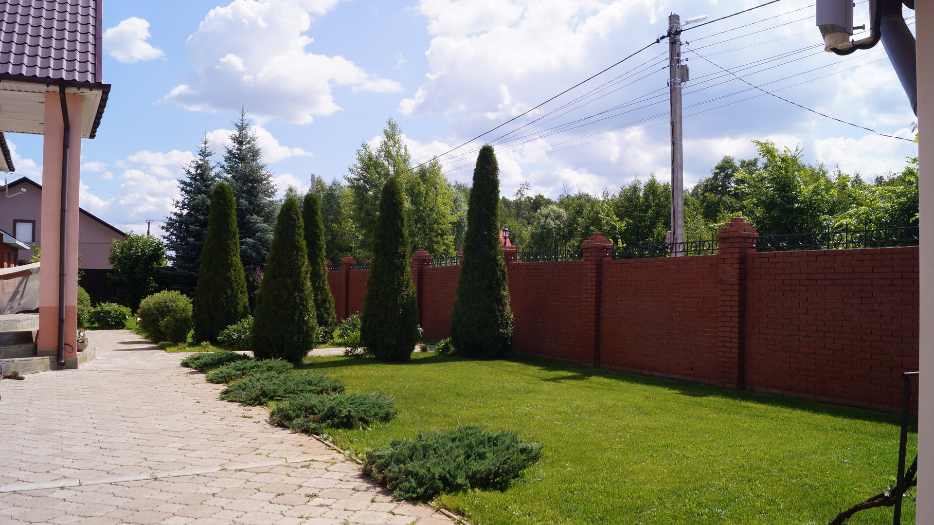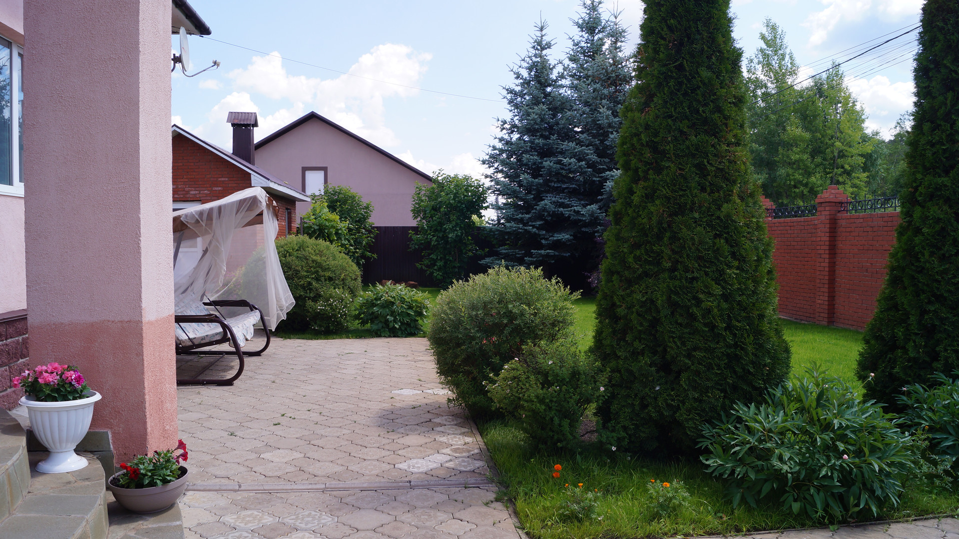 На участке много декоративных насаждений: в углу 3 большие голубые ели, встречают перед входом 6 огромных туи, гортензии, калина, виноград, спирея и многое другое.