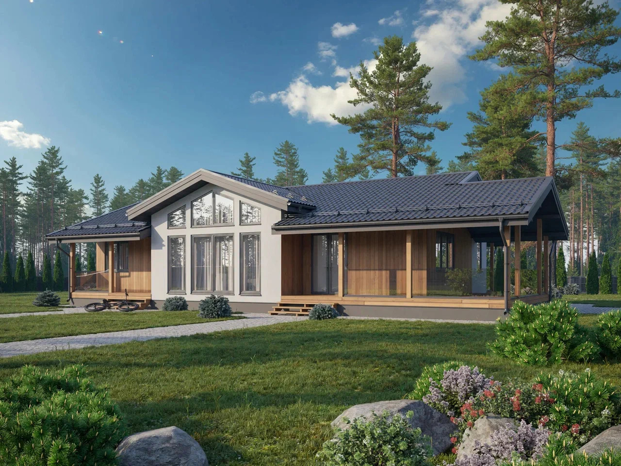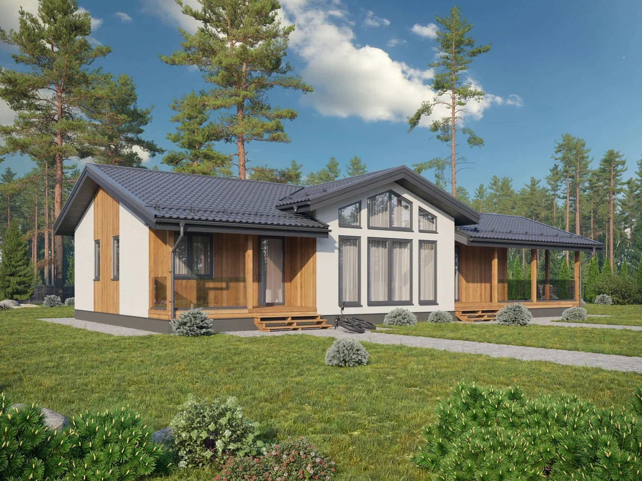 Пакет "Стандарт" + Наружная отделка + Полы перекрытия 200 мм + Окна + Наличники + Отливы + Входная дверь + Межкомнатные перегородки + Цоколь + Перекрестное утепление + Гипсокартон для внутренней отделки + Подшив кровли