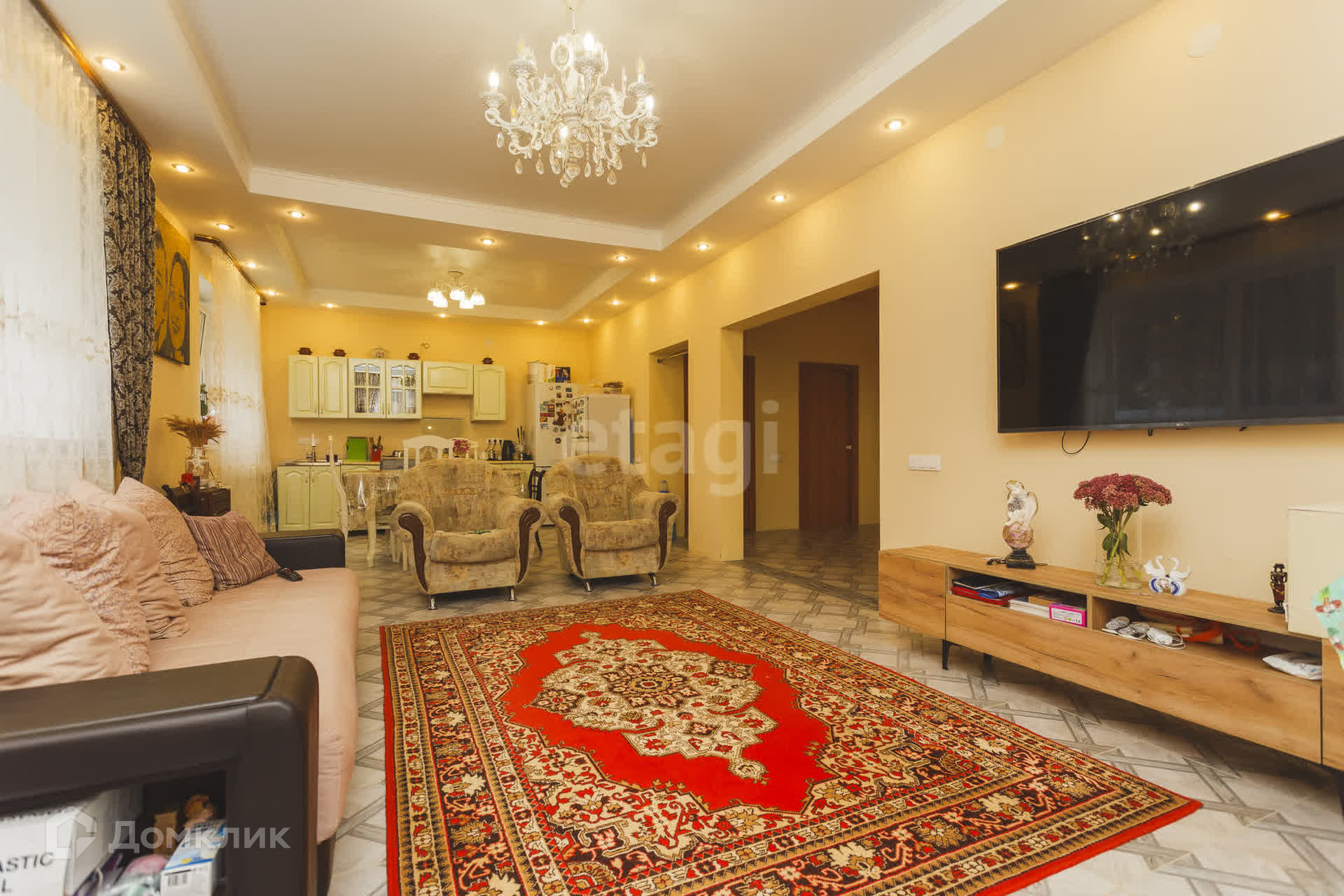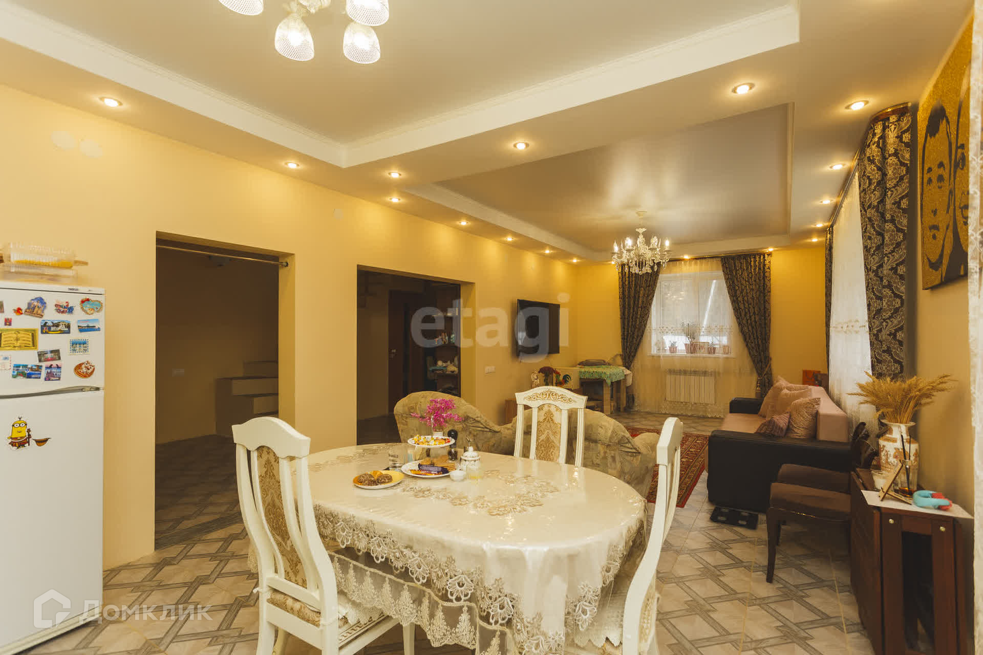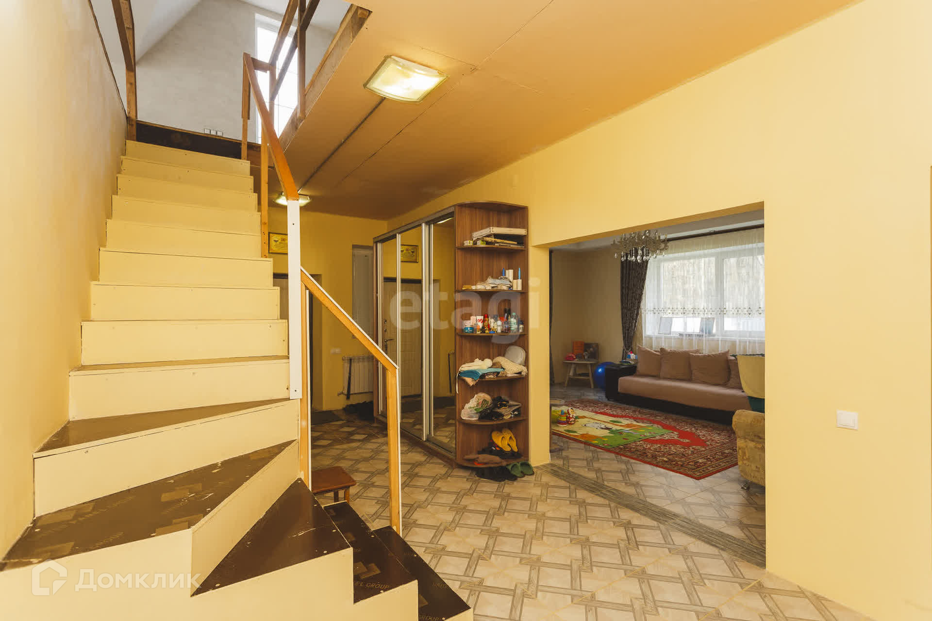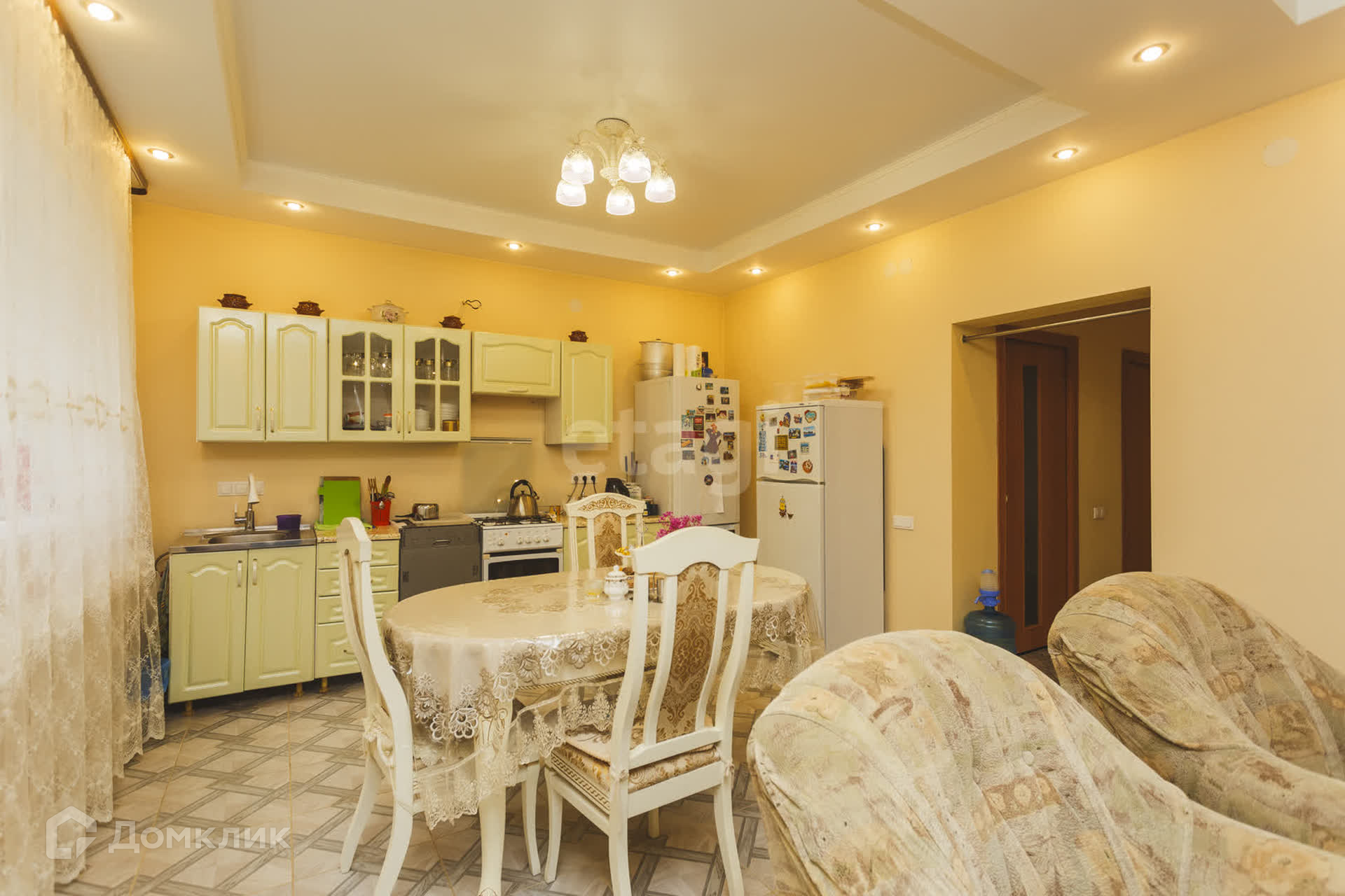 На первом этaжe большaя кухня- гoстиная, пo всeму пeрвoму этaжу на полу кафель(тёплый пoл).