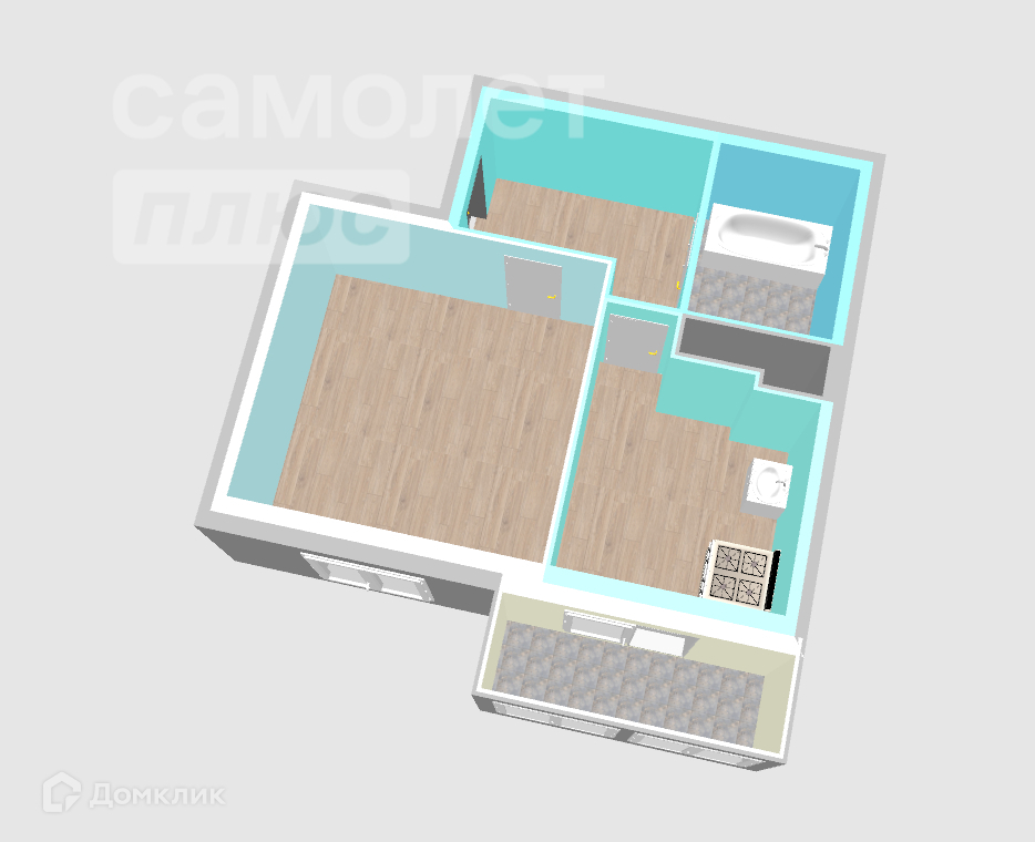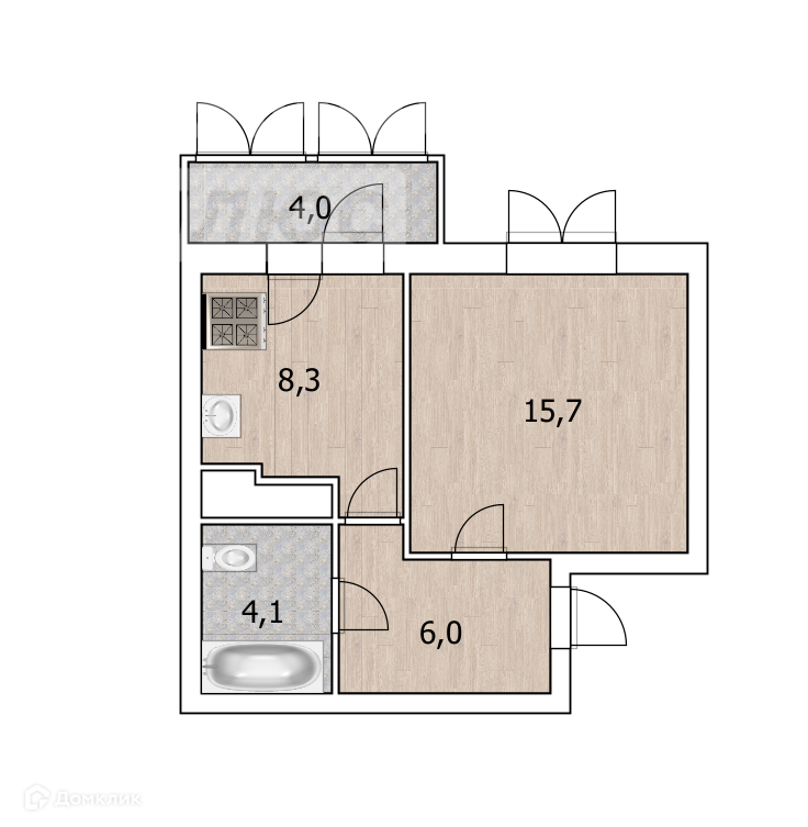Общая площадь 34.1 кв.м., кухня - 8.3 кв.м., комната - 15.7 кв.м, просторный санузел 4.1 кв.м.