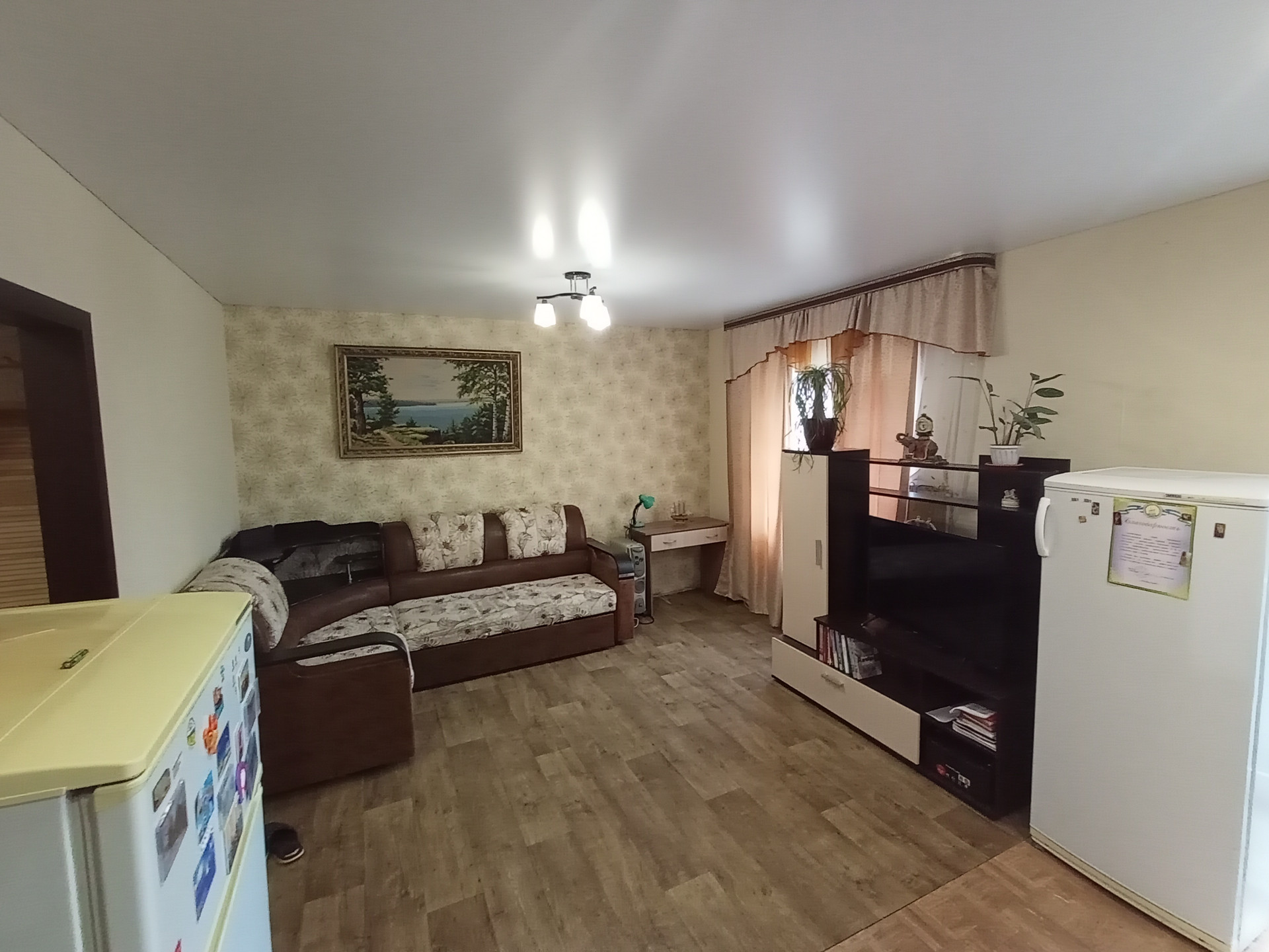 Натяжные потолки. В комнатах на полу линолеум, на кухне и в прихожей - керамогранит.