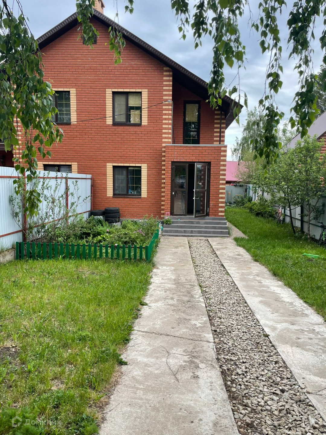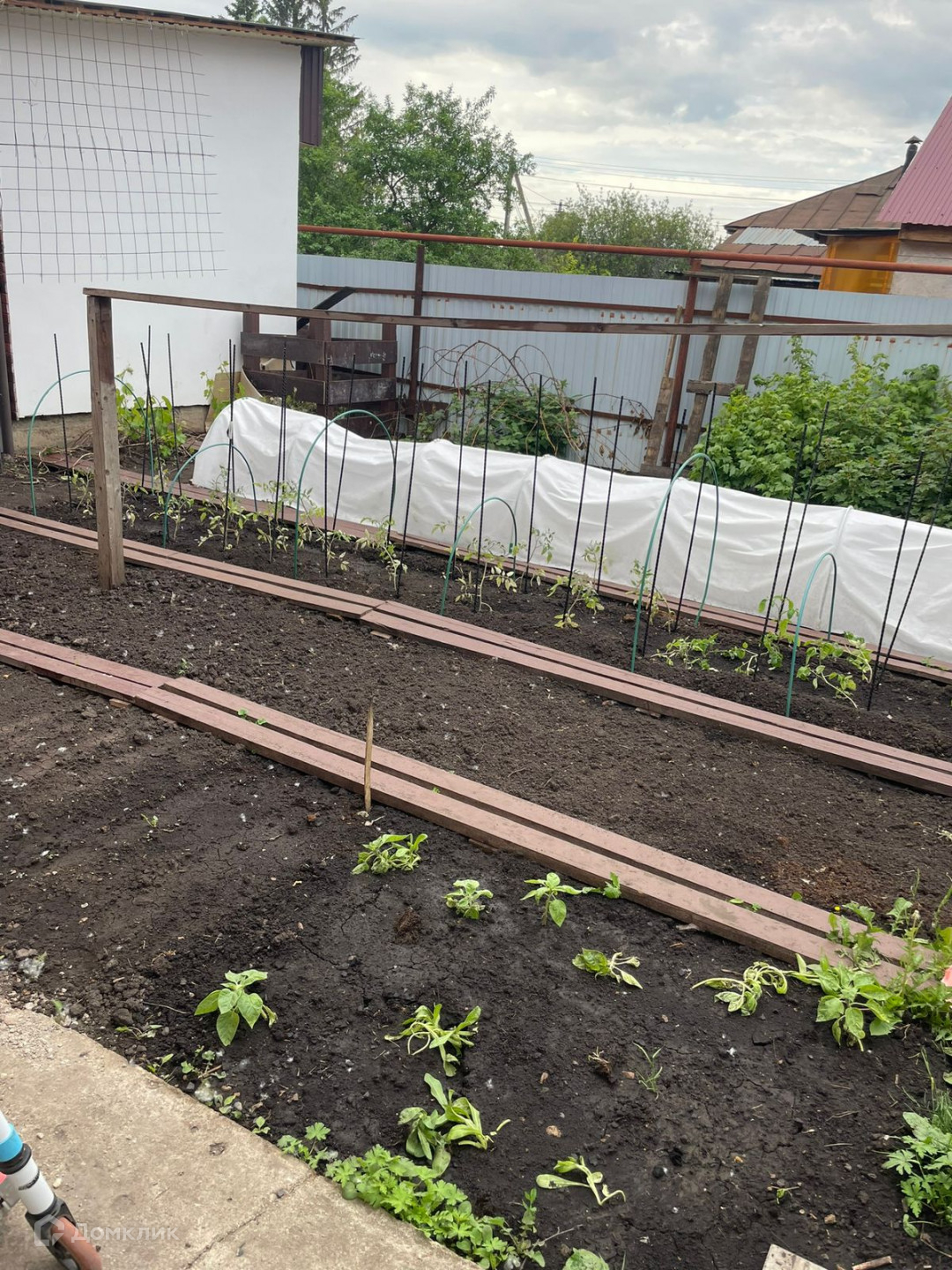 На участке: парковка для двух машин, газон, и небольшой огородик сзади дома.