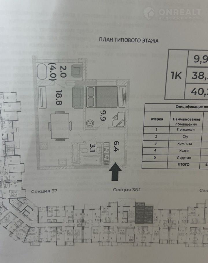 Общая площадь 40.2 м2